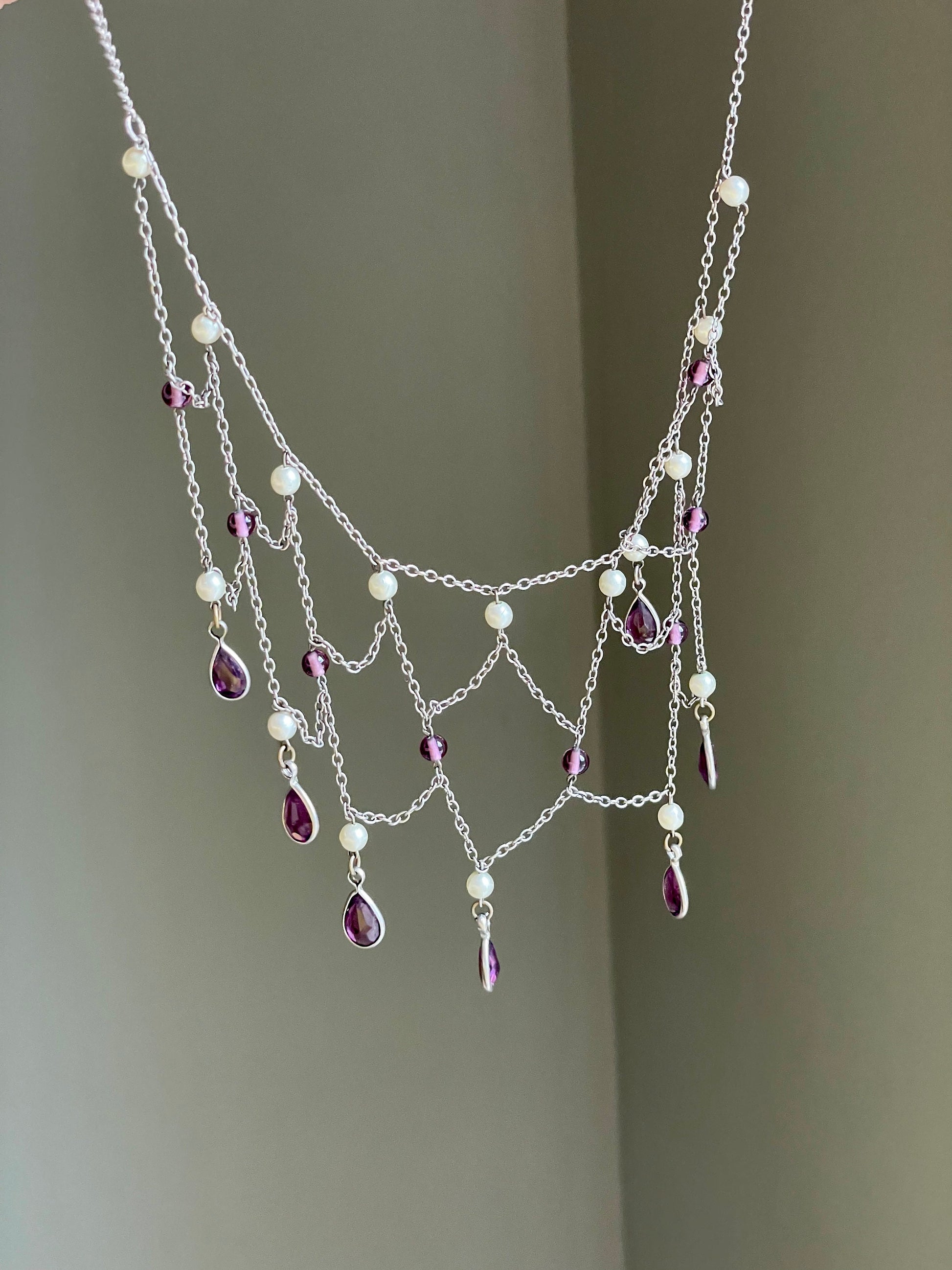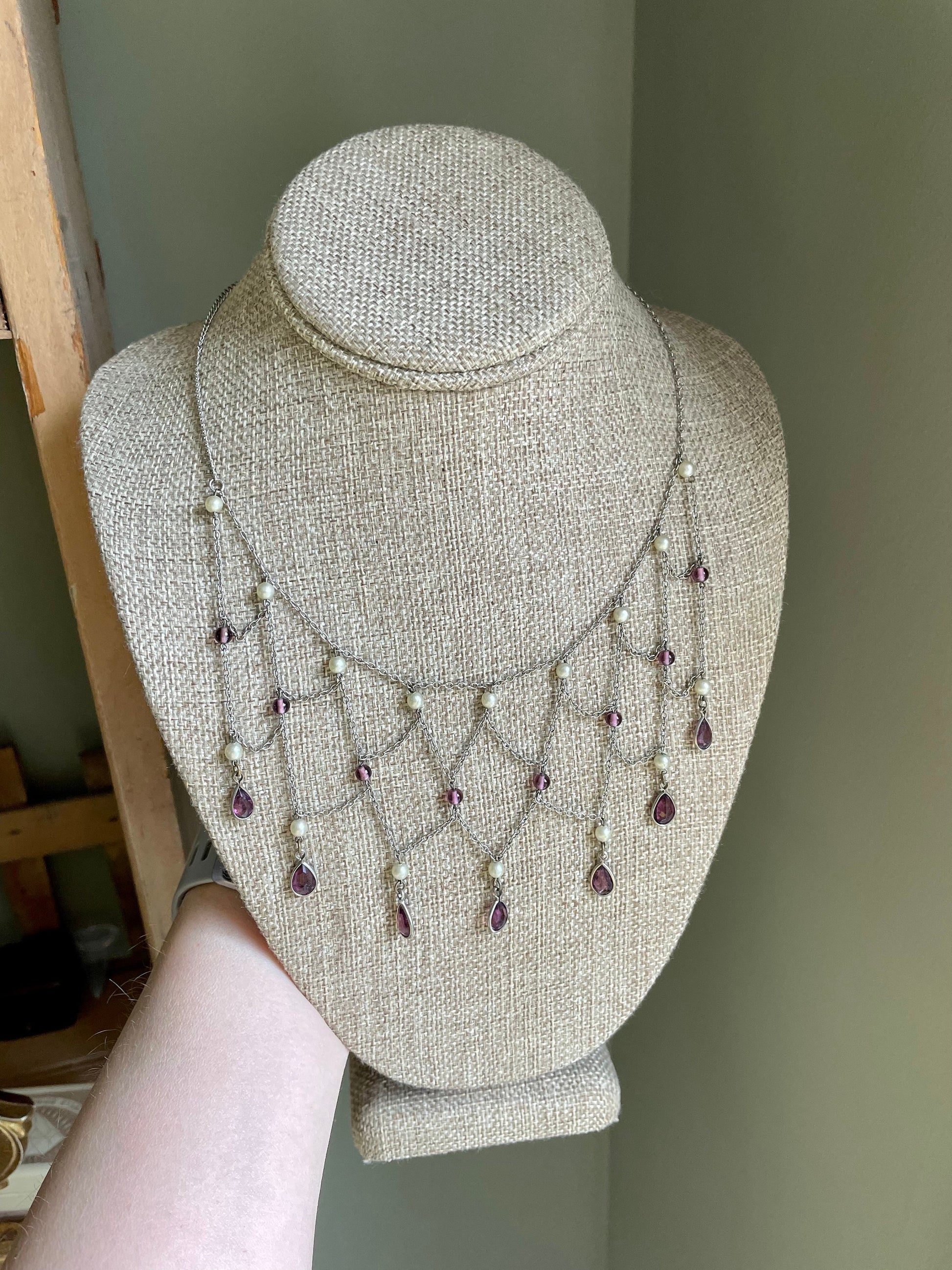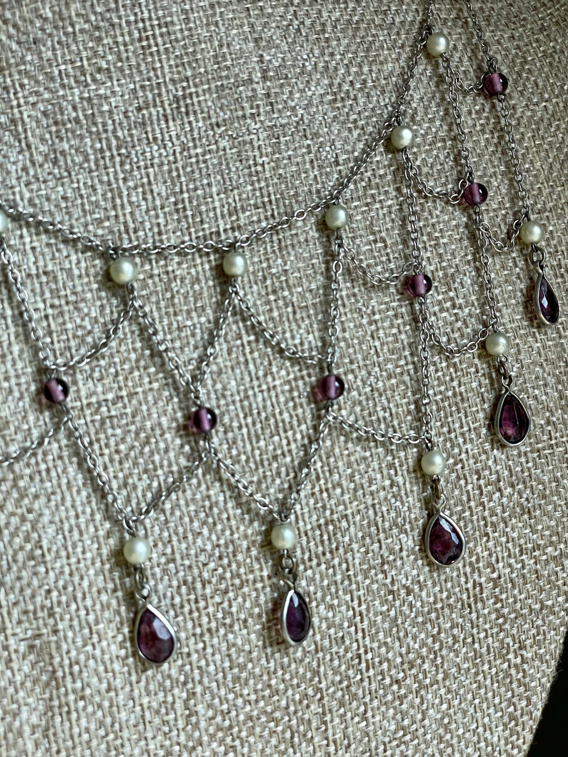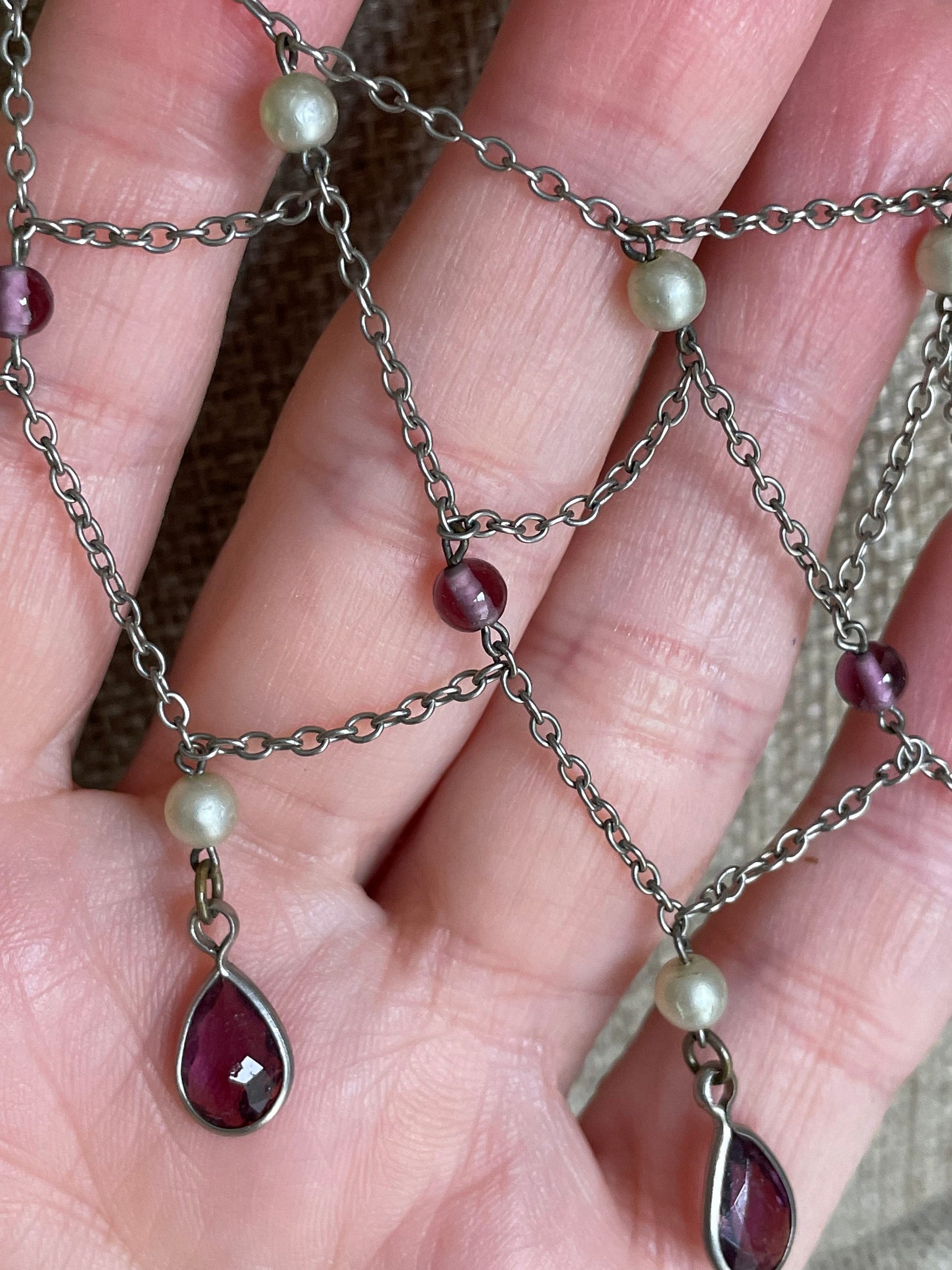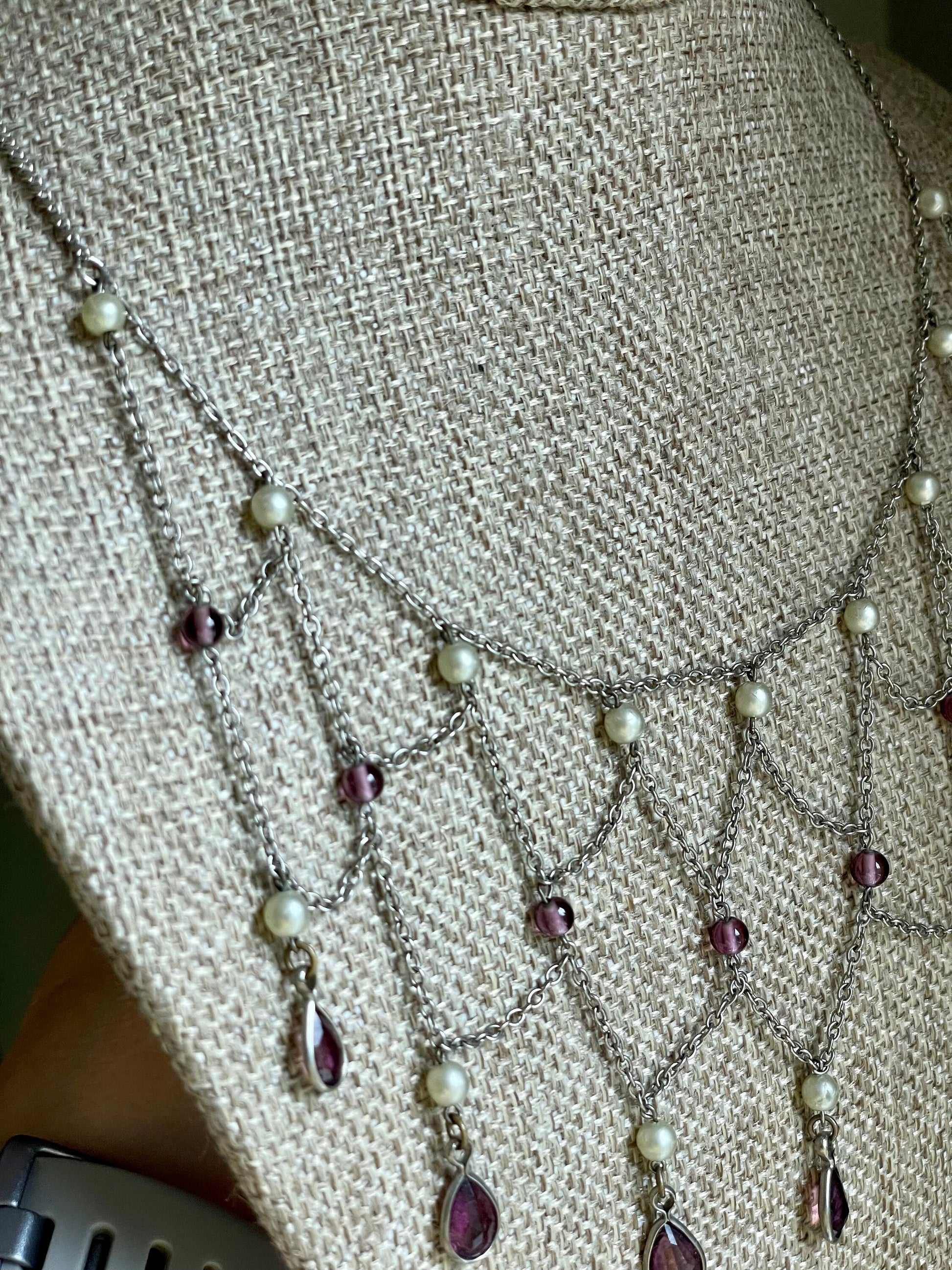 Interesting bid style vintage necklace-I think it dates to somewhere around 40's -50's. The metal is silver in tone and there are glass pearls and purple glass beads and pear shapes. At somepoint in its lift one side of the chain was replaced-but it is very similar and honestly I wore it a few times not even noticing until I started to really look it over to list for sale. Just please note this as I try to describe pieces accurately. I have kept the price down to reflect the different chain. The necklace is in very good condition. The purple imitation stones are very well done. Bid is about 16.5" in length and front is about 2.5" in width.