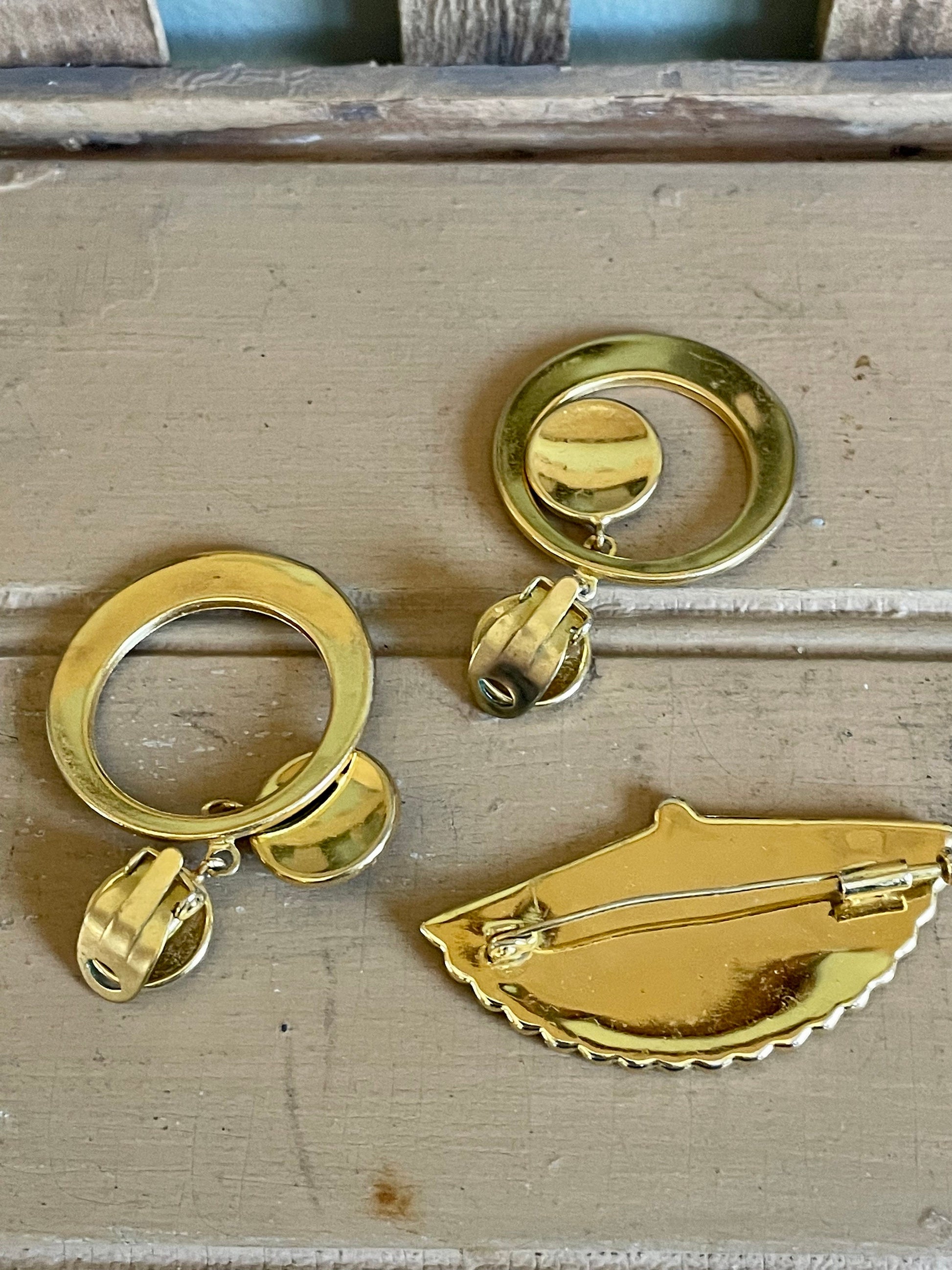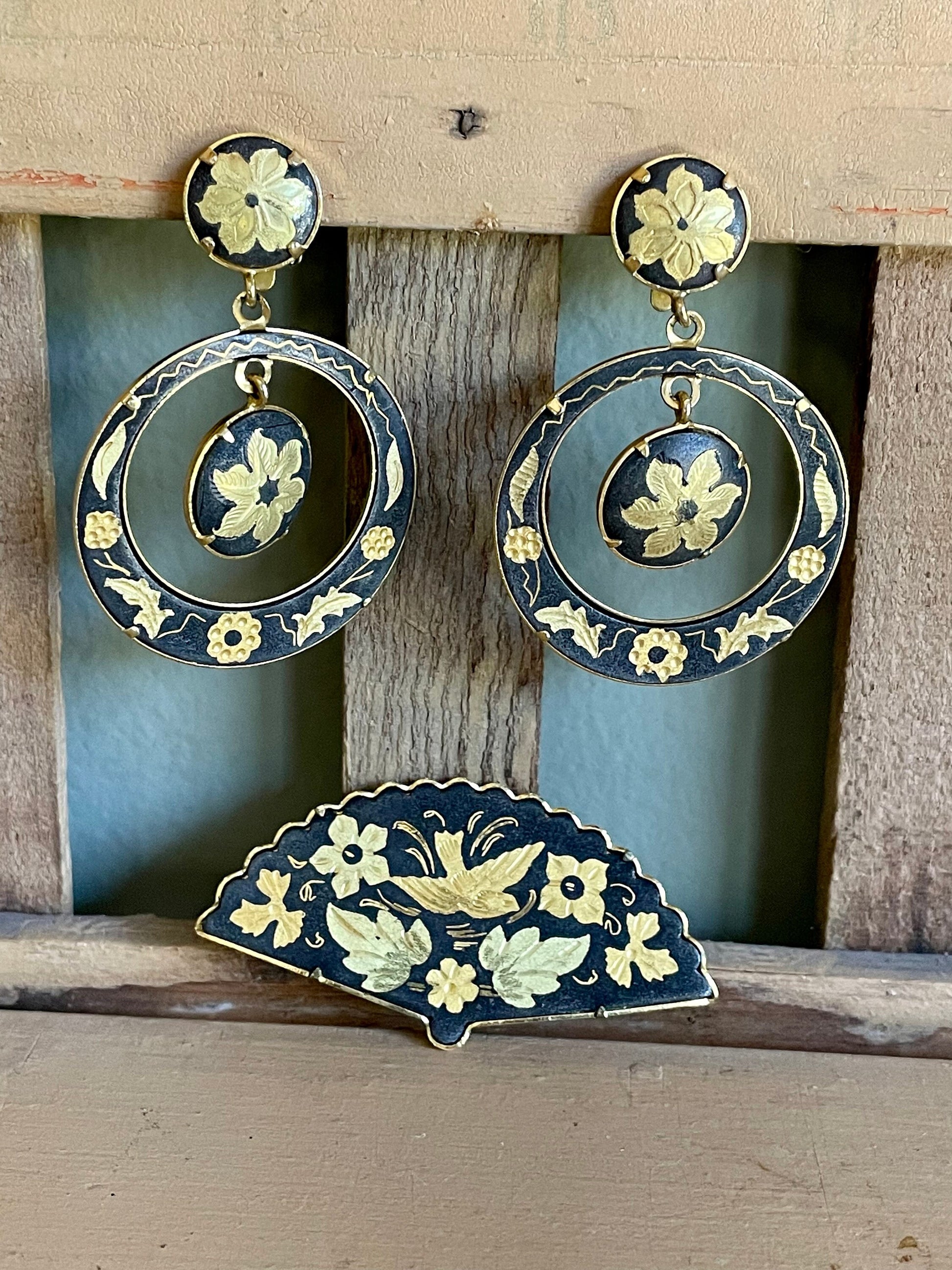 Vintage Damascene Style Fan Brooch with Dangle Earrings