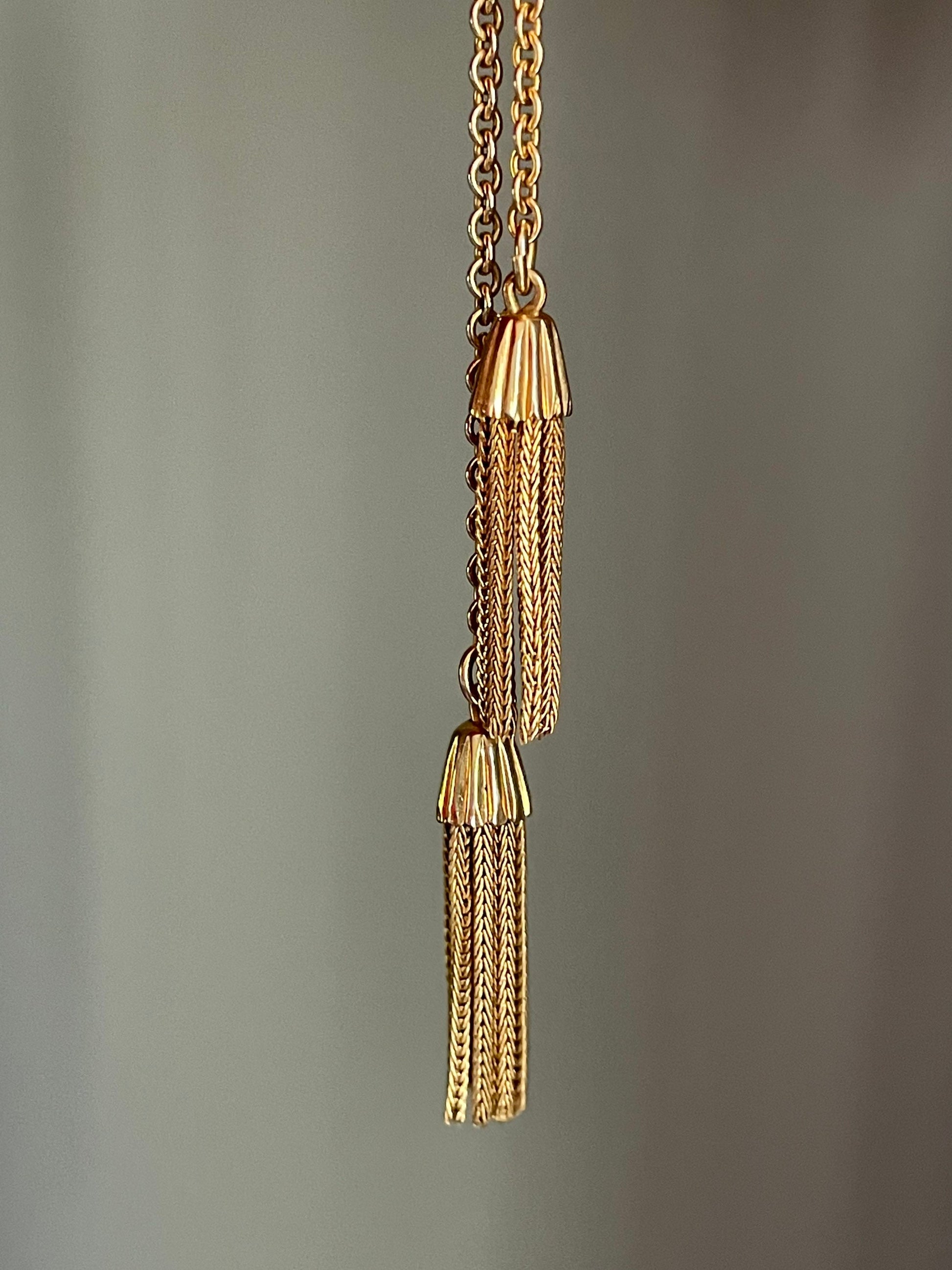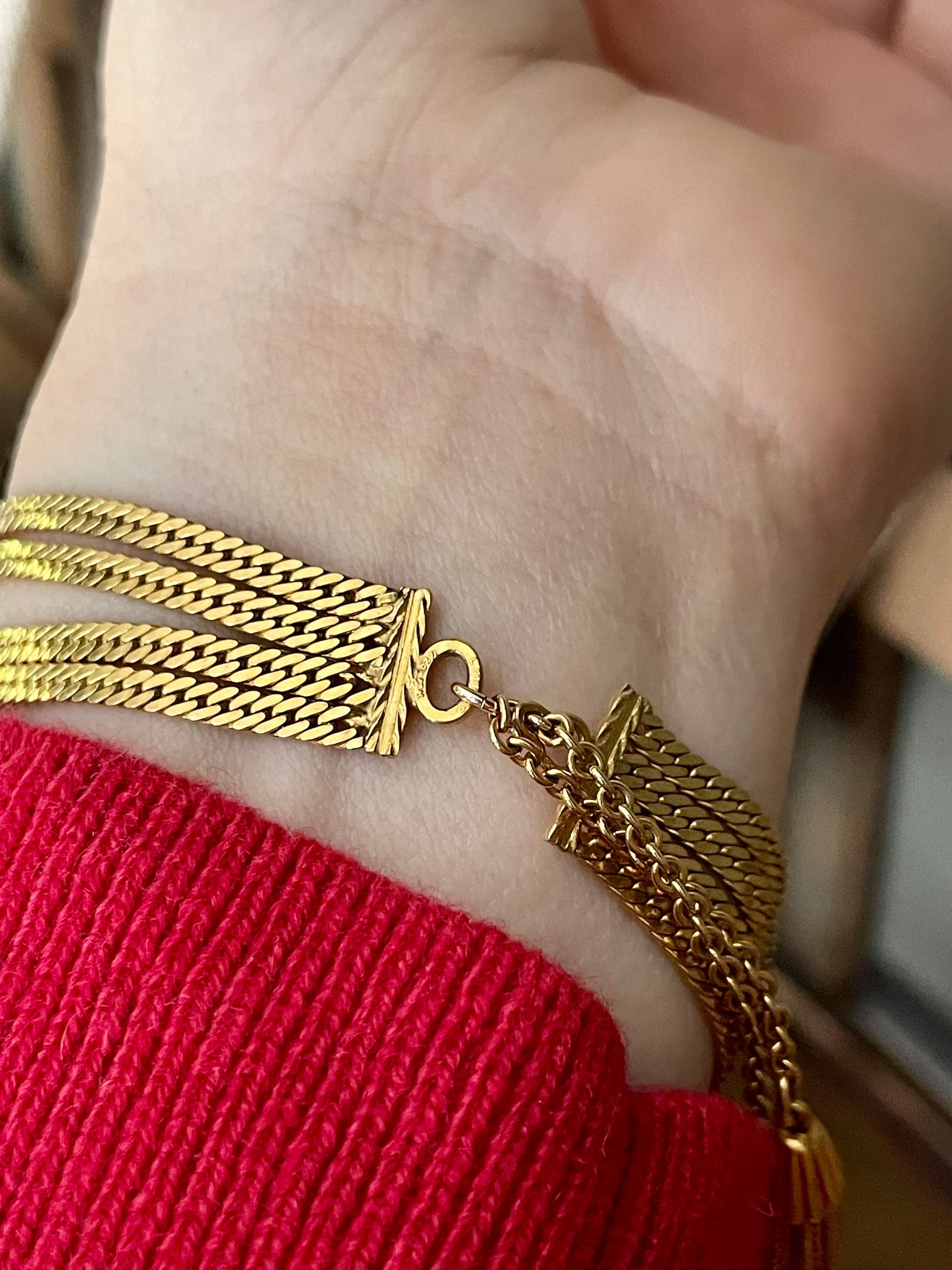 It is a costume piece, but it looks and feels like 18K yellow gold. The links are smooth in the hand and it just feels so nice on. There are four flat link chains that have a center bezel set shell hand carved cameo. The cameo is very well done. I adore this type of bracelet because the cameo will stay at the top of your wrist and won't flip under. The bracelet has two tassels that you adjust to your wrist and the weight of the tassels keep the cameo on top.