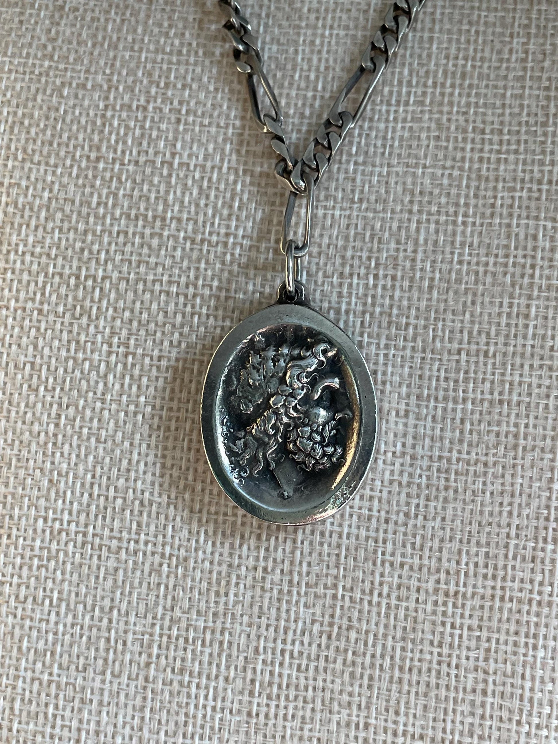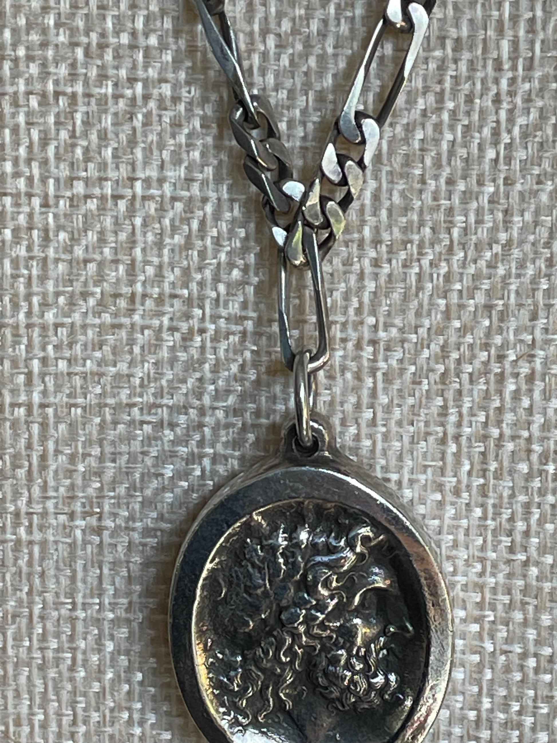 Known for his fine silver work. This pendant features a greek or roman man in profile with a thick frame. Below is Henryk's hallmark. 1 1/2" top of bale to bottom. Comes with the original chain it has been with for around 60 years. Lightly polished to all the relief to shine against the patina background. Clasp closes on chain with latch. 18" length chain.