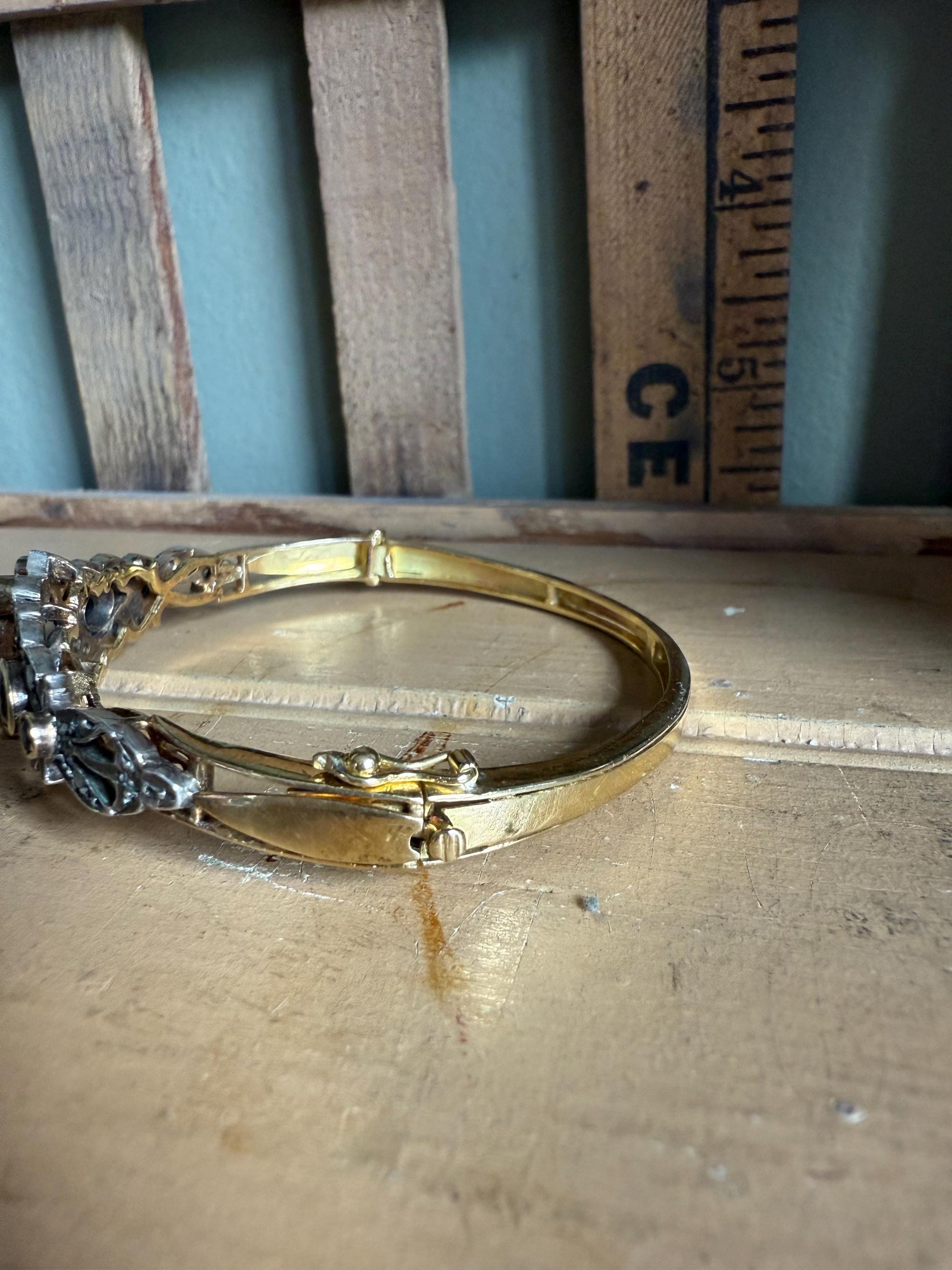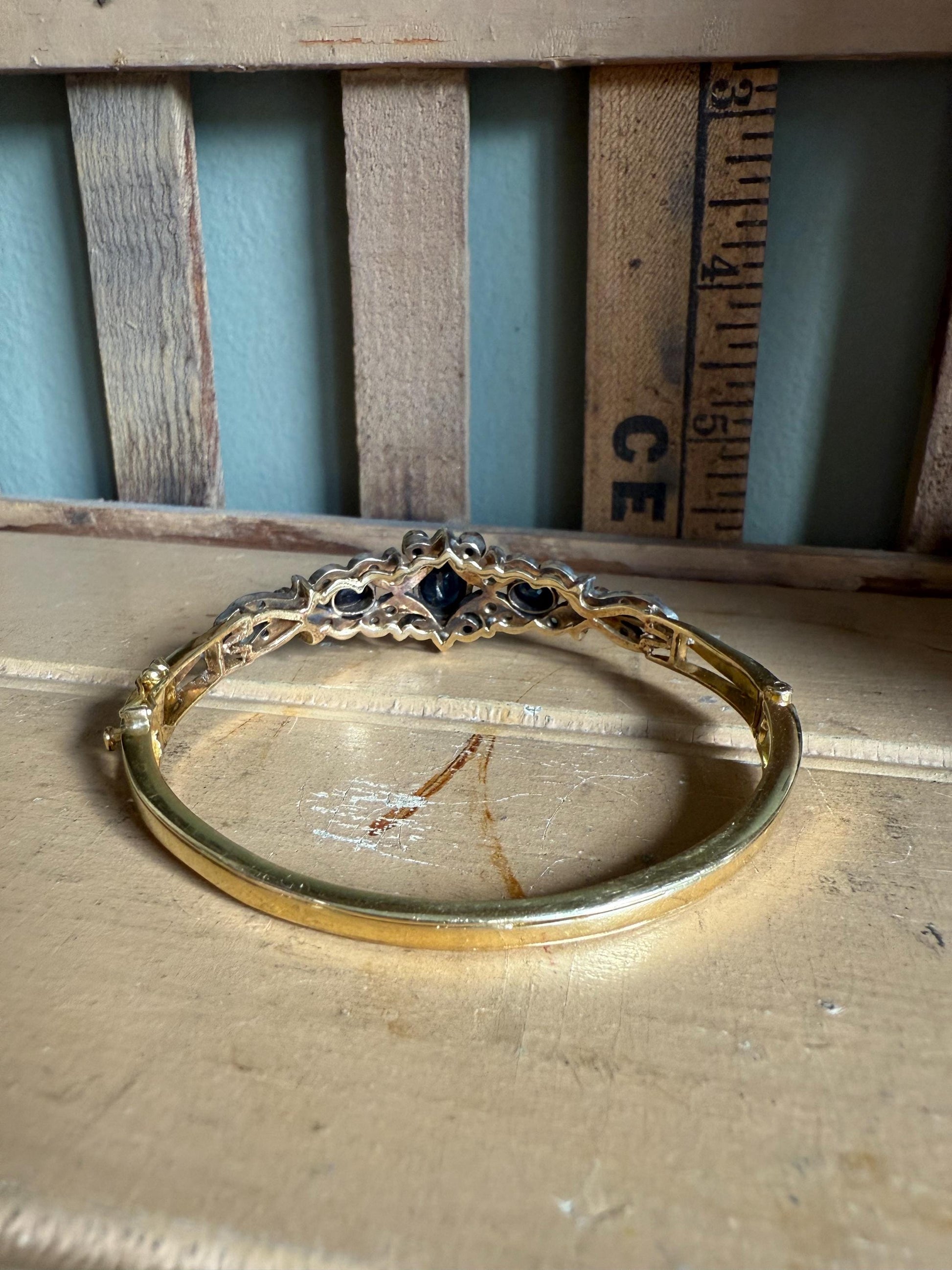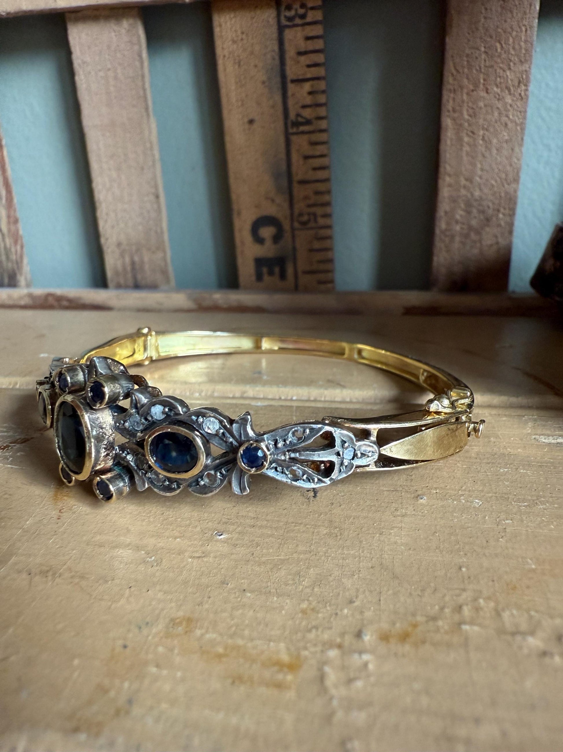 Vintage 18K yellow gold and sterling silver topped diamond bangle. The bracelet is stamped 750 (partially showing but confirmed as 18K) with makers mark. The style is Victorian revival and features 9 oval and round cut natural sapphires. Under magnification on a few there are angular growth color banding pointing to natural sapphires. The center oval cut sapphire measures approx. 8.6 x 4.5 mm bezel set, estimating around 2 cts, the two oval side sapphires are estimated about around 1 ctw, six round accent sapphires weigh approx. .60 ct so total weight about 3.60 ctw. The front is silver topped just like the late victorian / Edwardian pieces were made. In the sterling silver are native and rose cut diamonds. All gemstones are present.