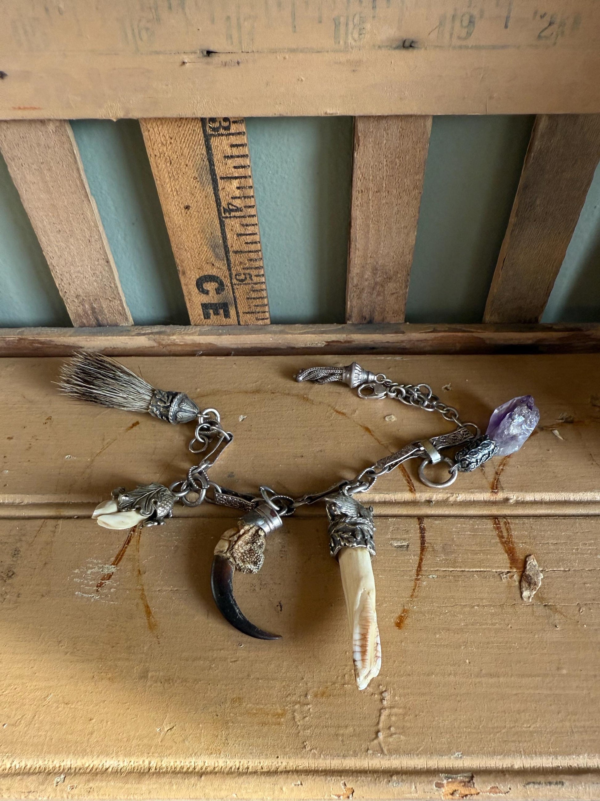 The trophies include a boar topped claw, 2 1/4" length, wild boar teeth, bird claw, amethyst crystal, boar head tassel and silver tassel. 7 1/4" length.