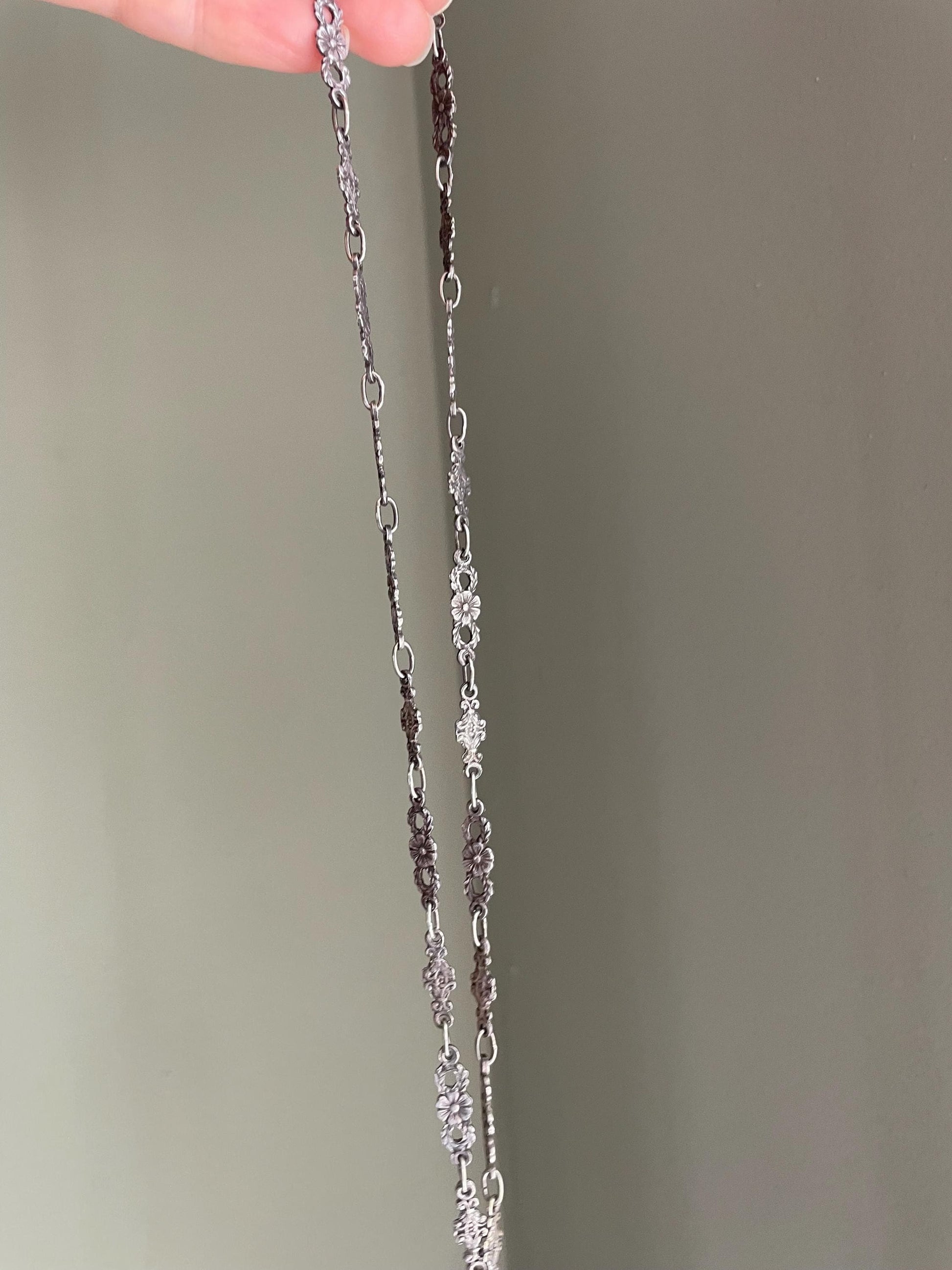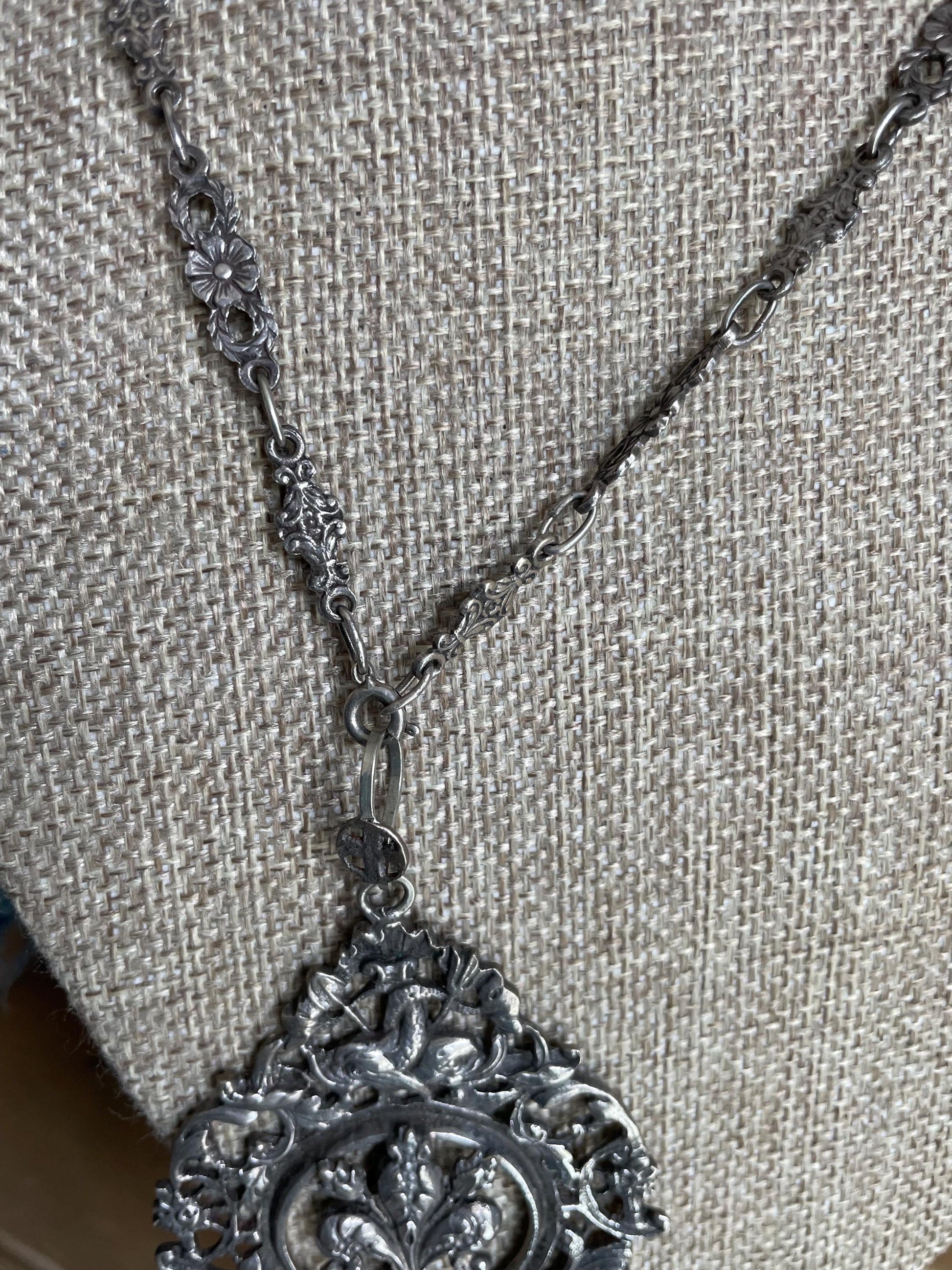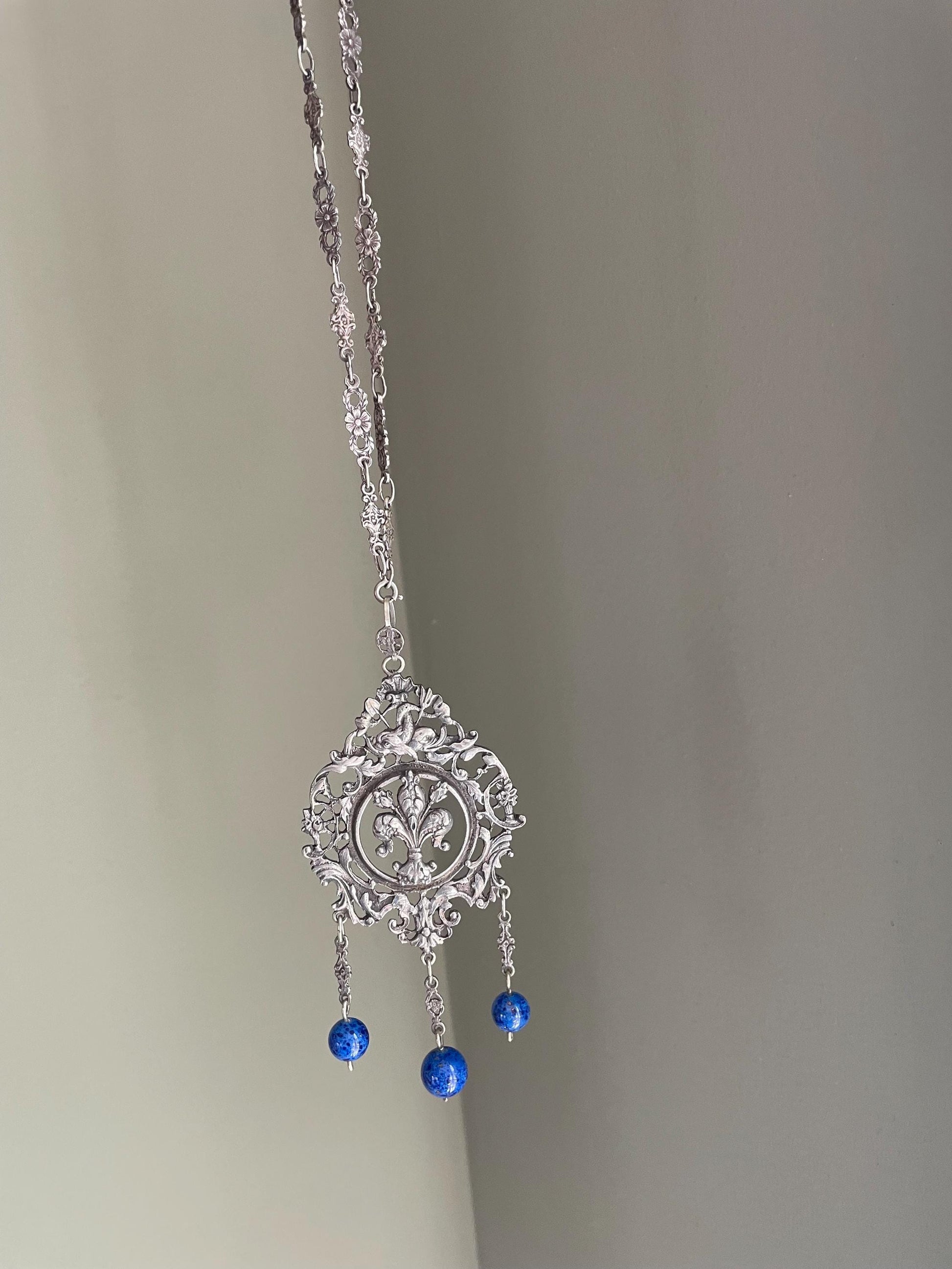 Vintage silver (mostly likely around 800) chain and pendant by Peruzzi, Italy. Could not locate any stamps. The Peruzzi family has made beautiful silver jewelry since the 1880's. The pendant is 4.75 inches long (top of bale to bottom) and 2.25 inches wide. There is a fleur de lis motif centered with antique motif sea monsters at top, flowers, shell and beautiful scrolling. The bale is large and the chain can go through it. Dangling are glass beads mimicking lapis lazuli. The chain has flower links, spring ring. 20" length x 1/4 inches wide.
