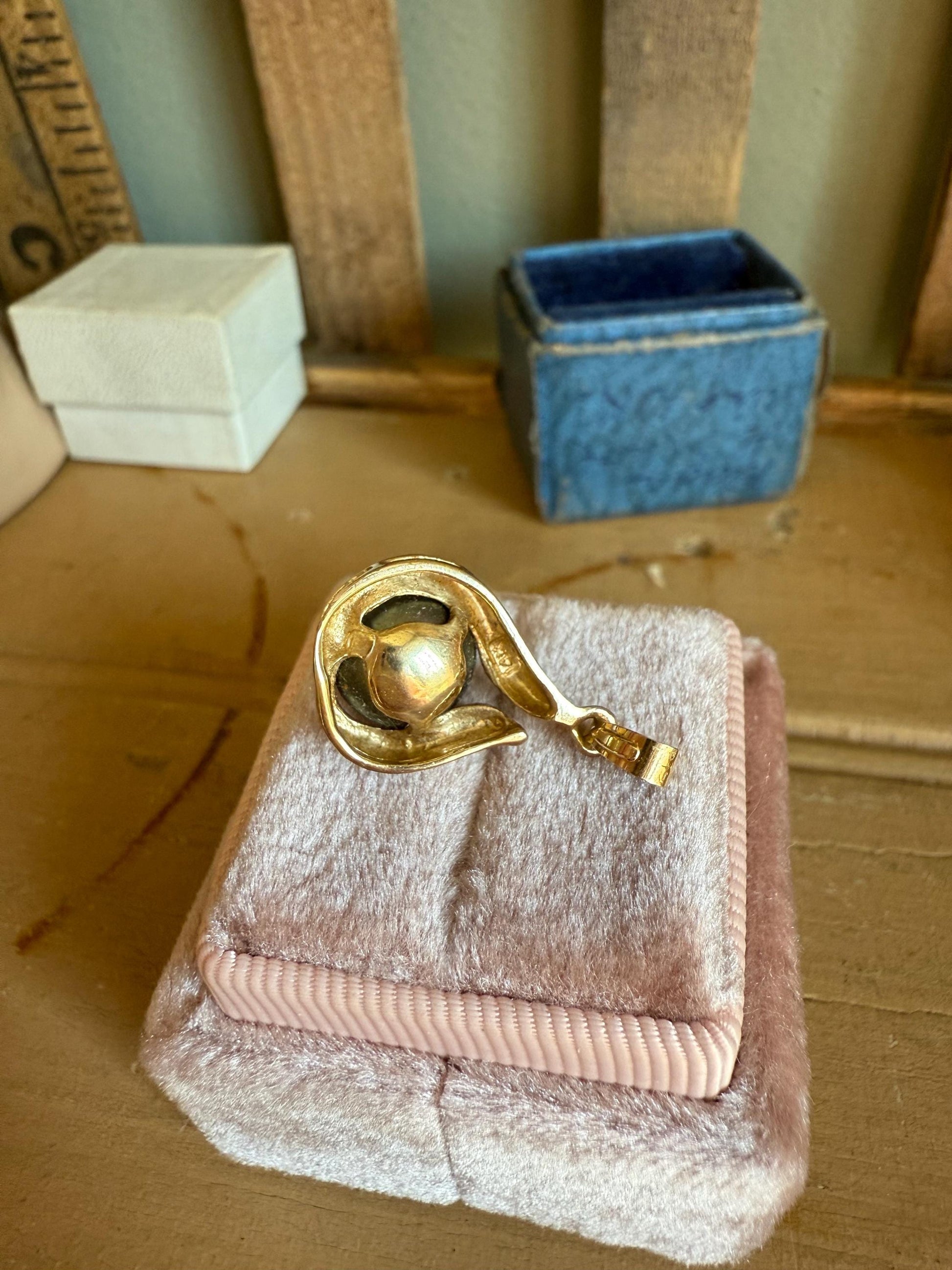 So hard to capture the color of this pretty Tahitian pearl. It is brownish/grayish with pinkish overtones. It is appro. 9.86 mm diameter and is post set on a tear drop shaped 14K yellow gold pendant. Stamped on back 14K and verified. The bale has makers marks that I can't make out. 1" tall x 9/16" wide.