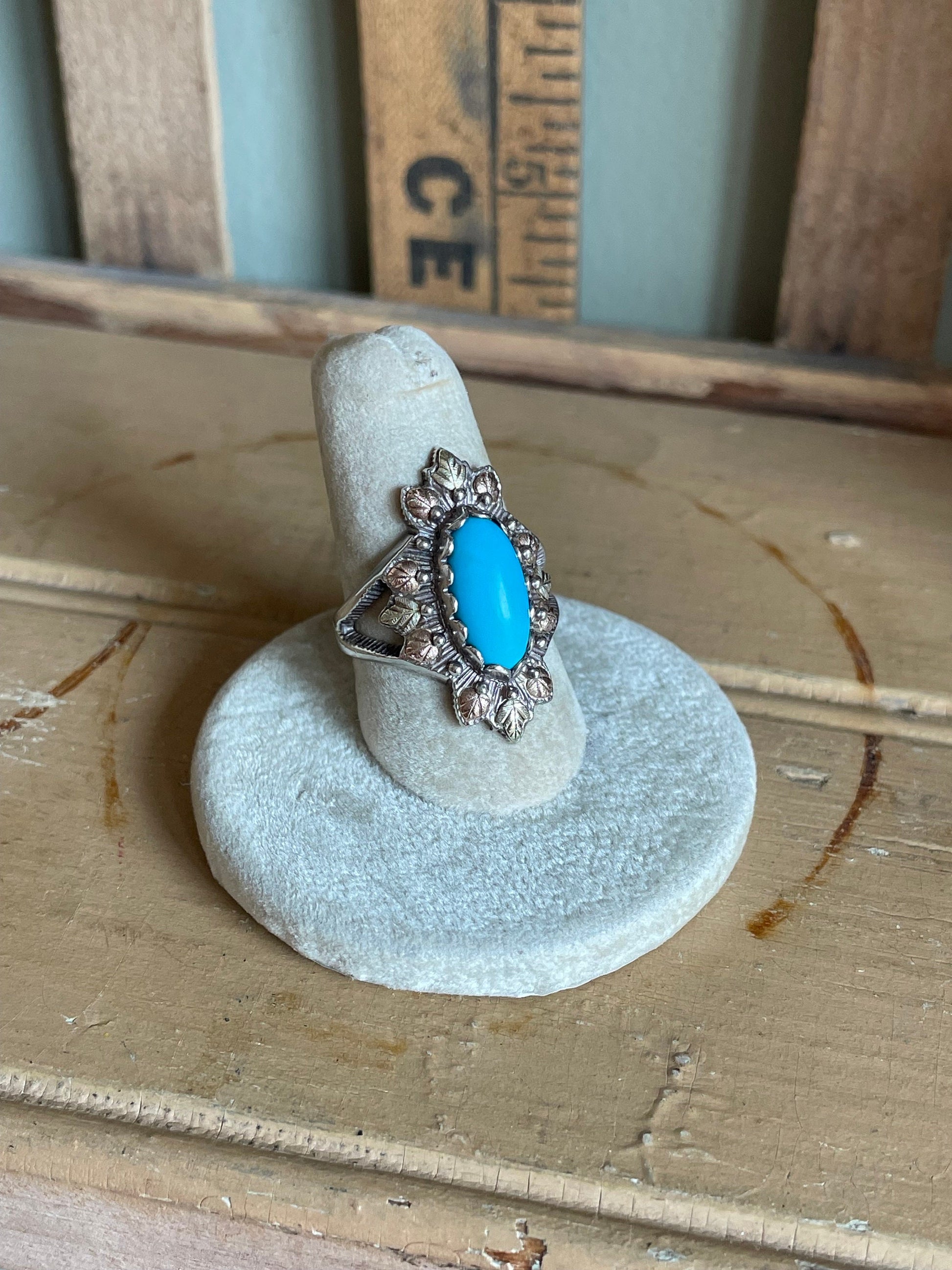 Sterling and 12k green and rose gold ring featuring a marquise cut turquoise measuring approx. 1/2" length. Prong set with green and rose gold leaf design, ball motifs and engraving. Currently a size 7 but sizable reach out for an estimate.
