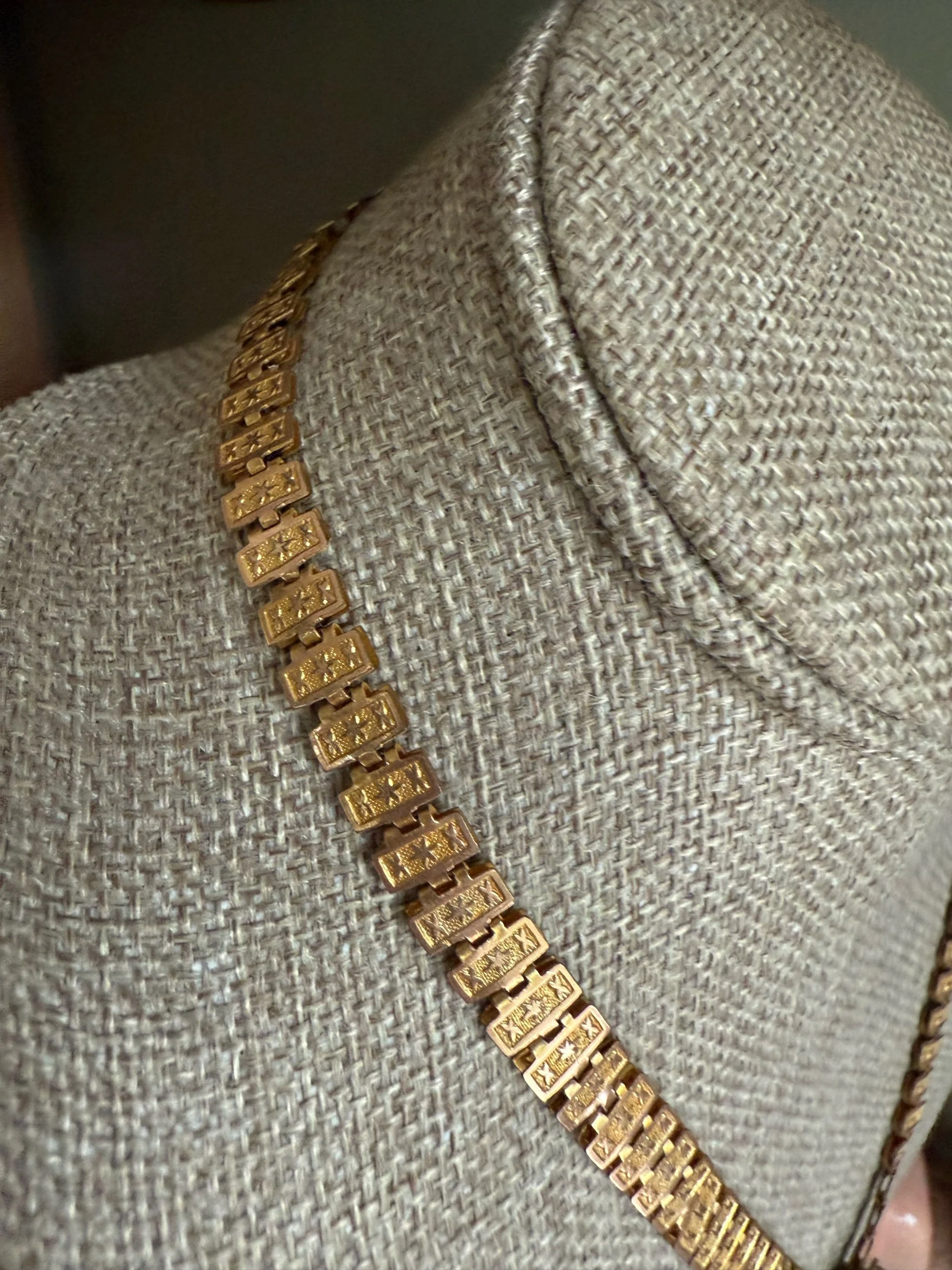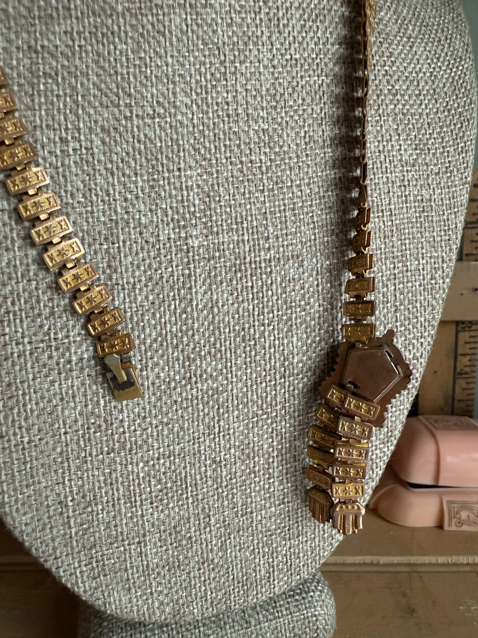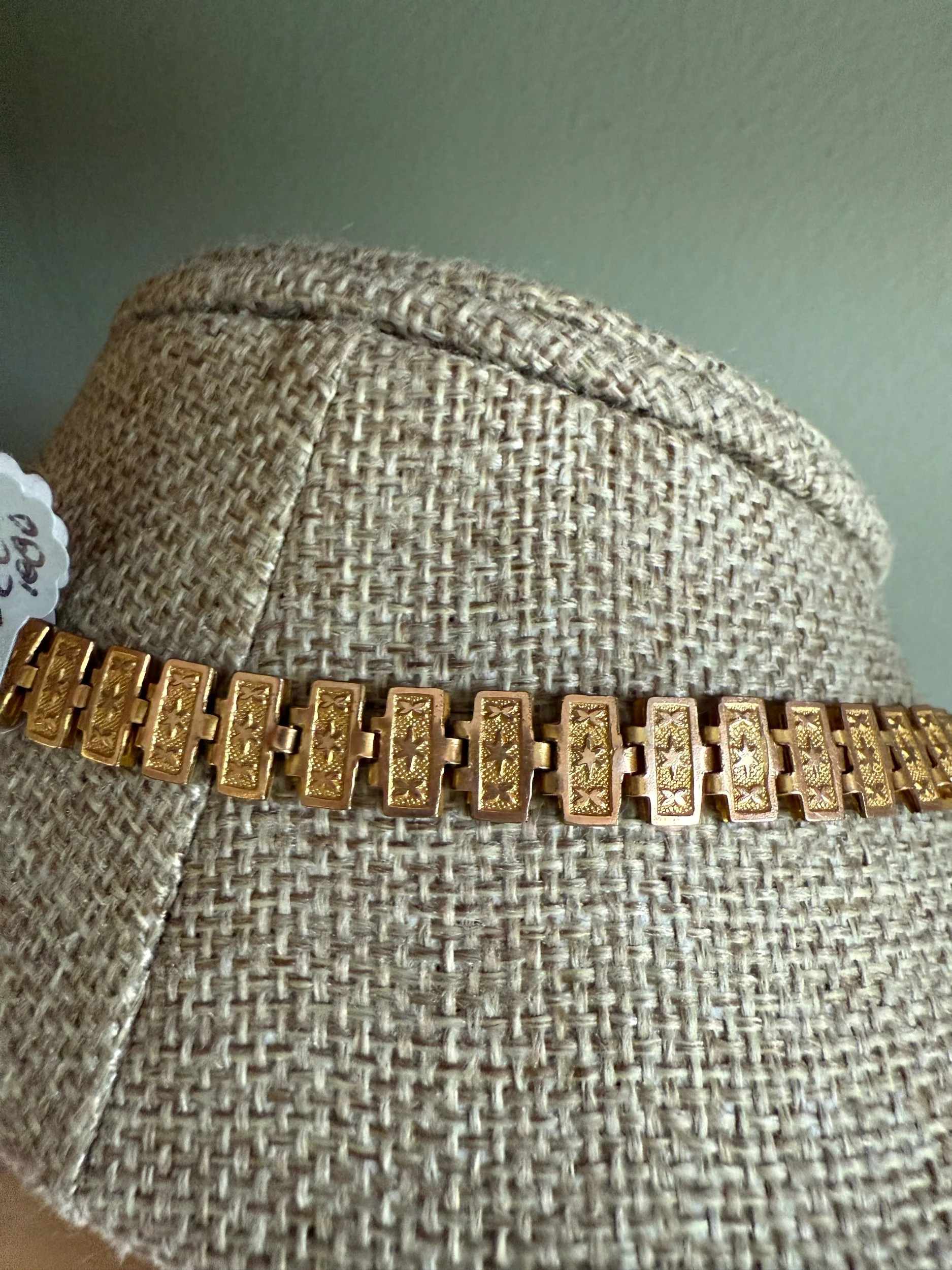 Antique gold filled bookchain necklace dating to the Victorian era featuring a cameo of a lady in profile hand carved from banded agate. The clasp is hidden behind the cameo. A great example in very good condition. The bookchain measures 5/16" wide and folds over mimic the look of a book. There are three stars stamped in the links. The cameo on engraved plaque measures approx. 7/8" x 3/4". The two dangles with tassels measure 1 1/4" in length. 18" length around the neck.
