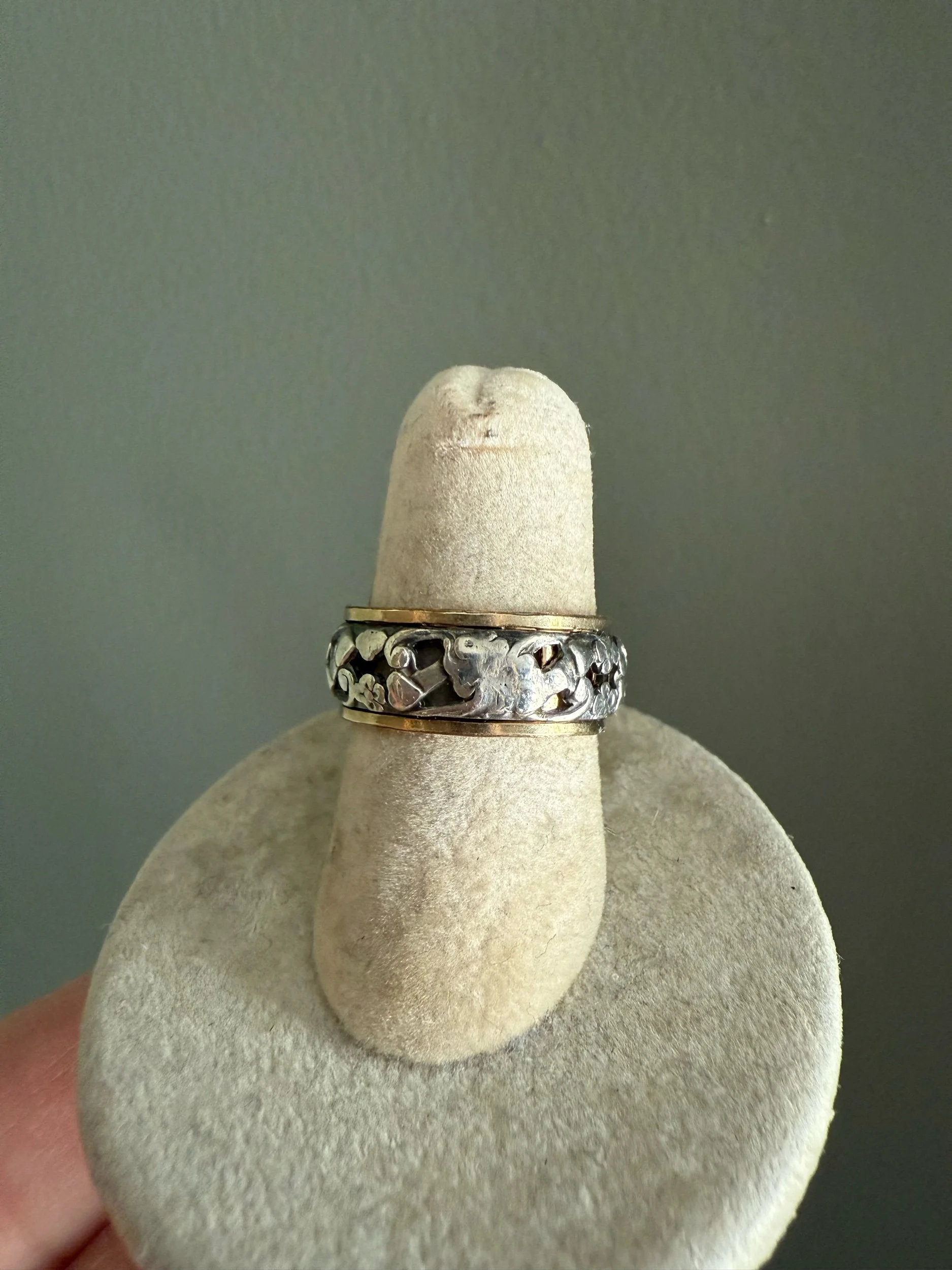 c1940 Sterling and 10K Gold Filled sweetheart eternity band. The center features a floral motif with gold filled edges. 1/2" wide. Being a wider band it will fit around a size 6-6.25. In very good preowned condition-so hard to find these in larger sizes. It can be sized but there will be some disruption to the pattern.