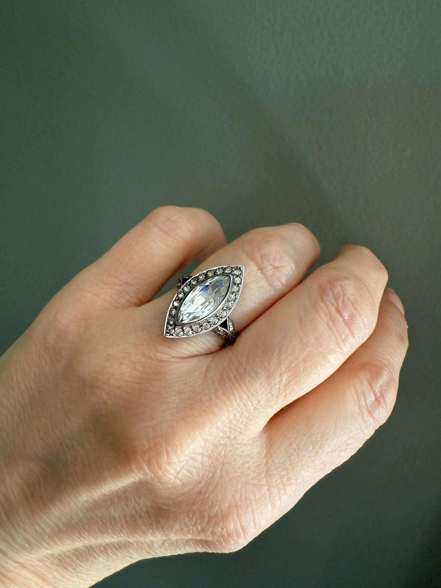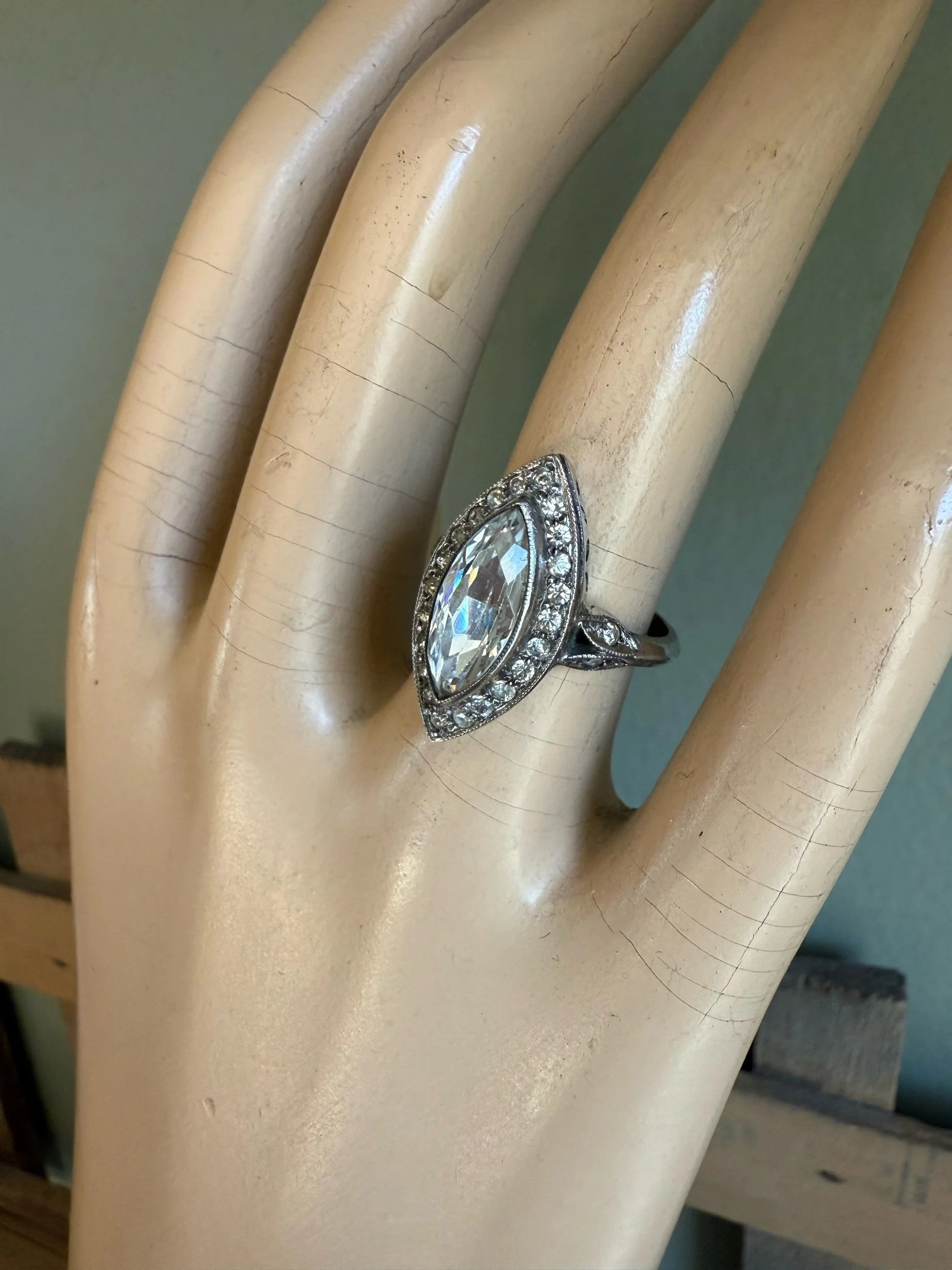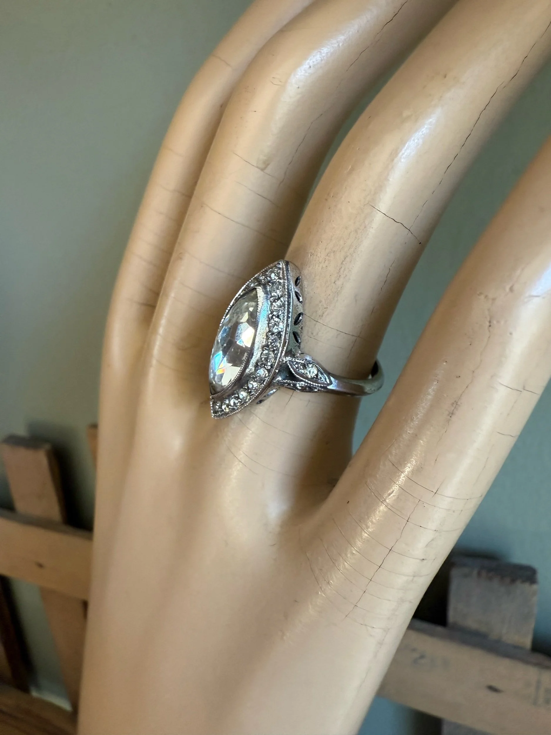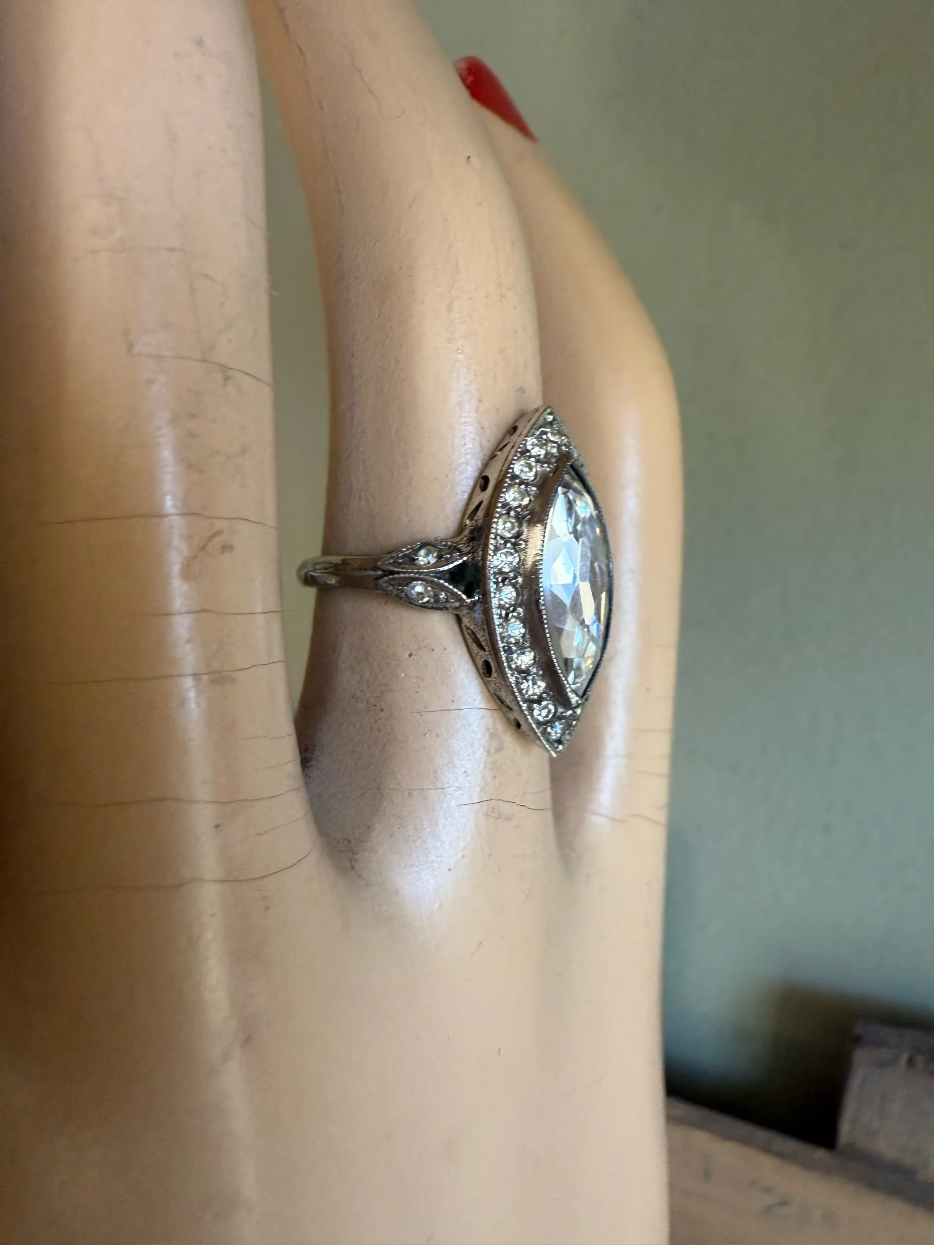 Sterling silver (stamped in shank) ring featuring a marquis cut crystal measuring approx. 14 x 7 mm in a milgrain edge bezel. Surrounded by a halo of round cut crystal and milgrain edging. Decorative cut out gallery and leaf motifs set with crystals on the shoulders.