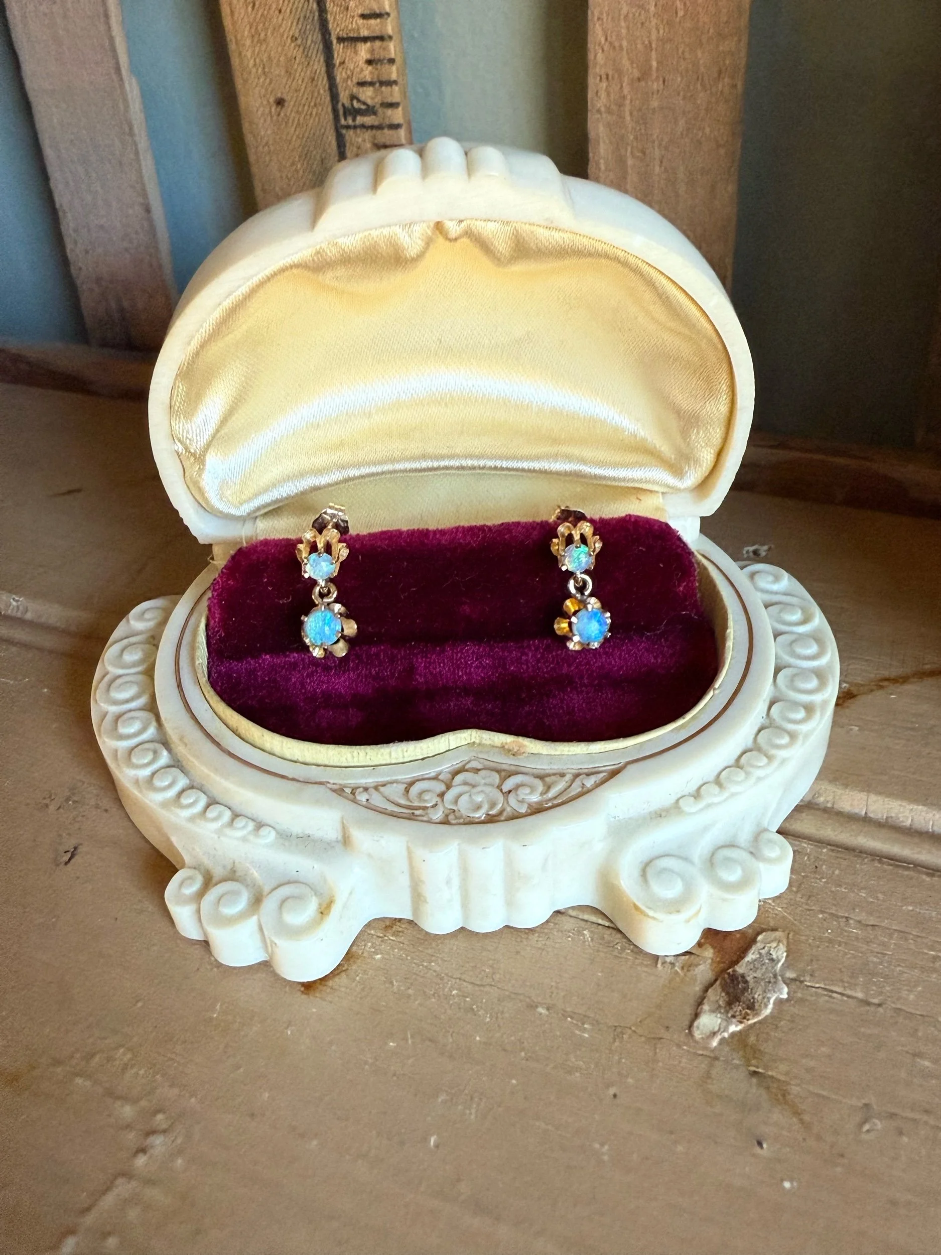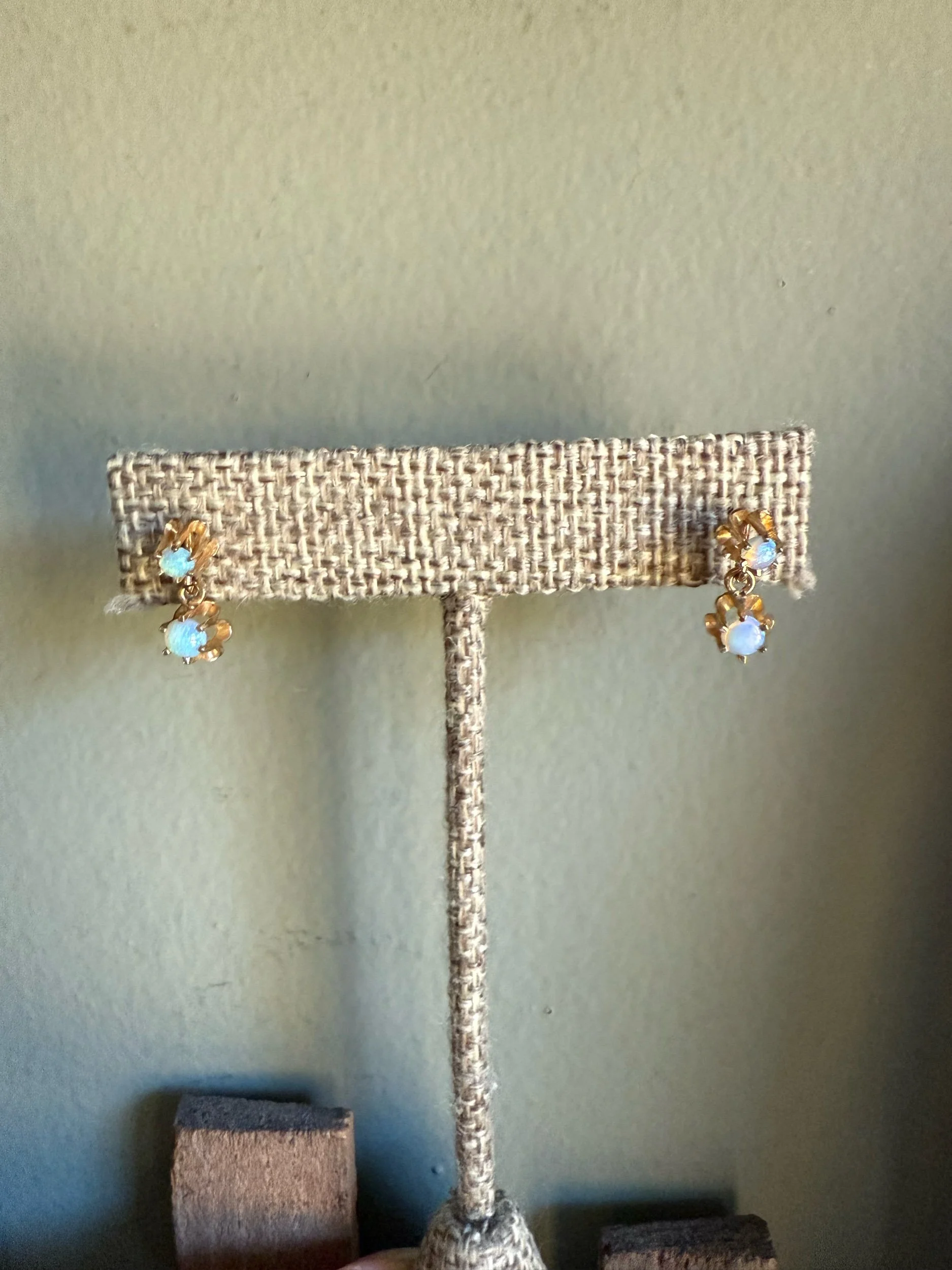 Victorian revival 14K yellow gold earrings (tested and the backs are stamped 14K) featuring cabohon round opals measuring approx. 3 mm diameter at the top and 3.77 mm diameter in the dangle. The buttercup mountings were a popular setting style in the turn of the 20th century. The are a timeless classic look.