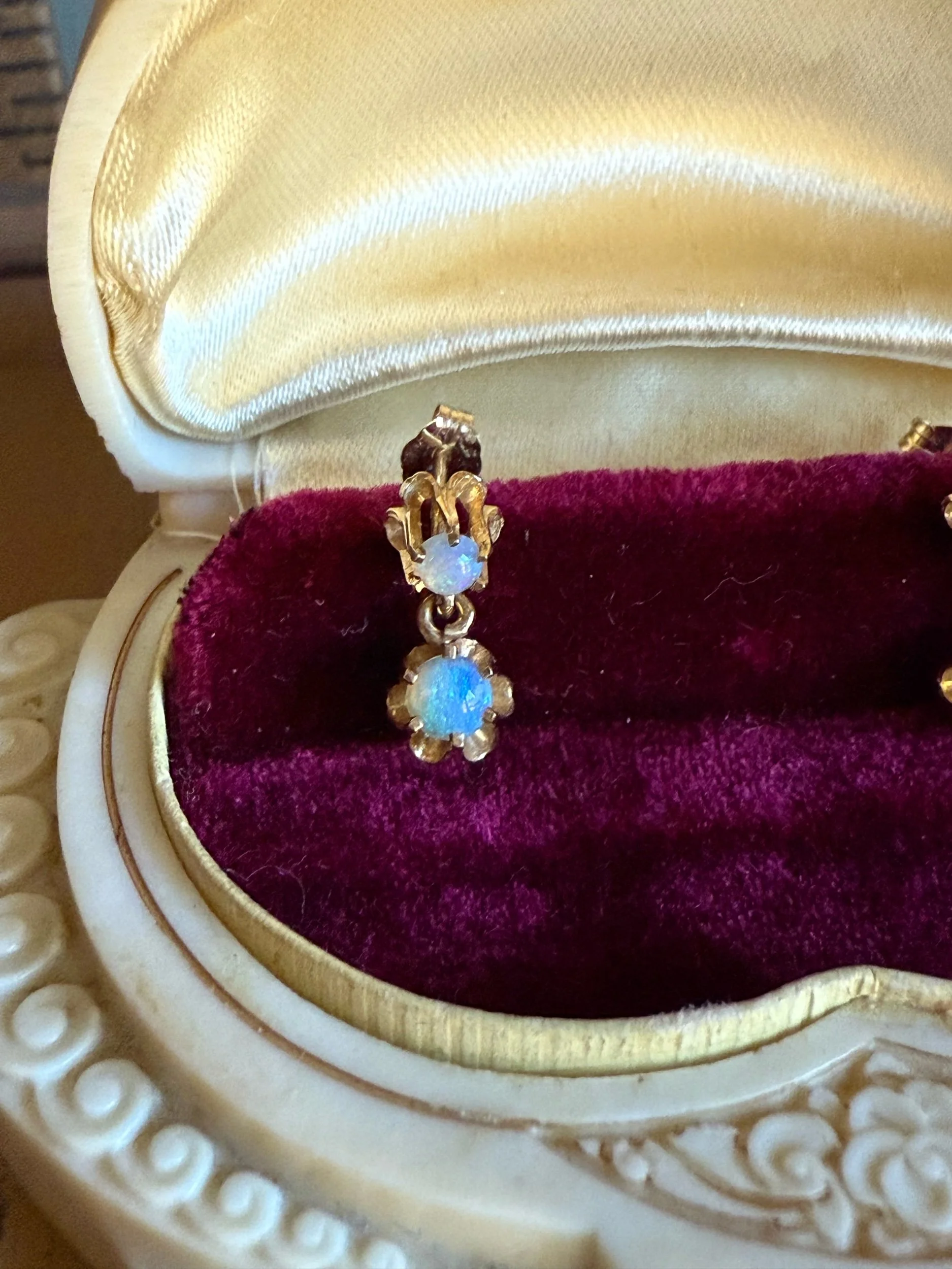 Opals have a purplish/bluish pinkish hue and are securely set in six prongs each. 9/16" top to bottom and 1/4" diameter. 1.6 grams tw