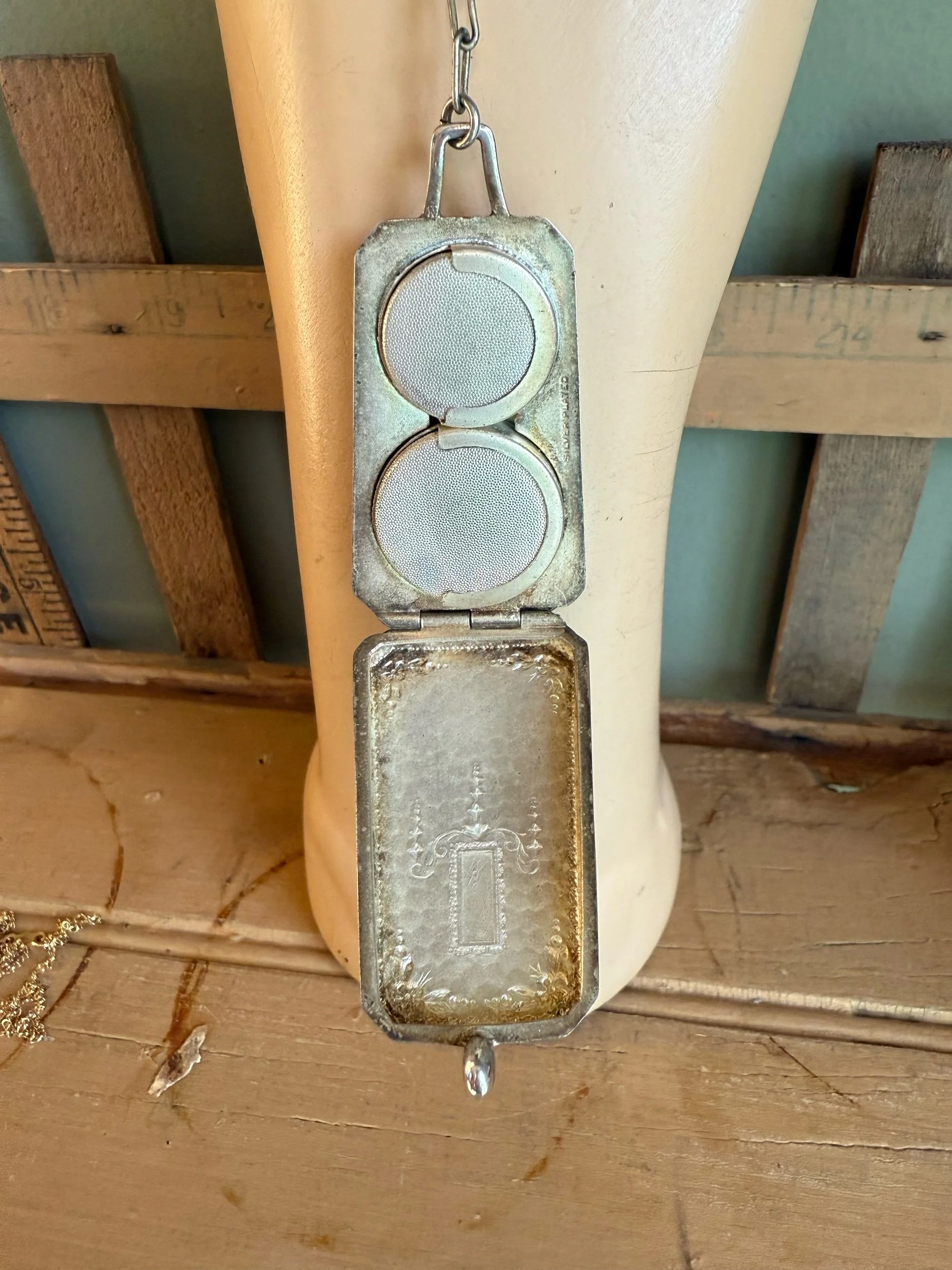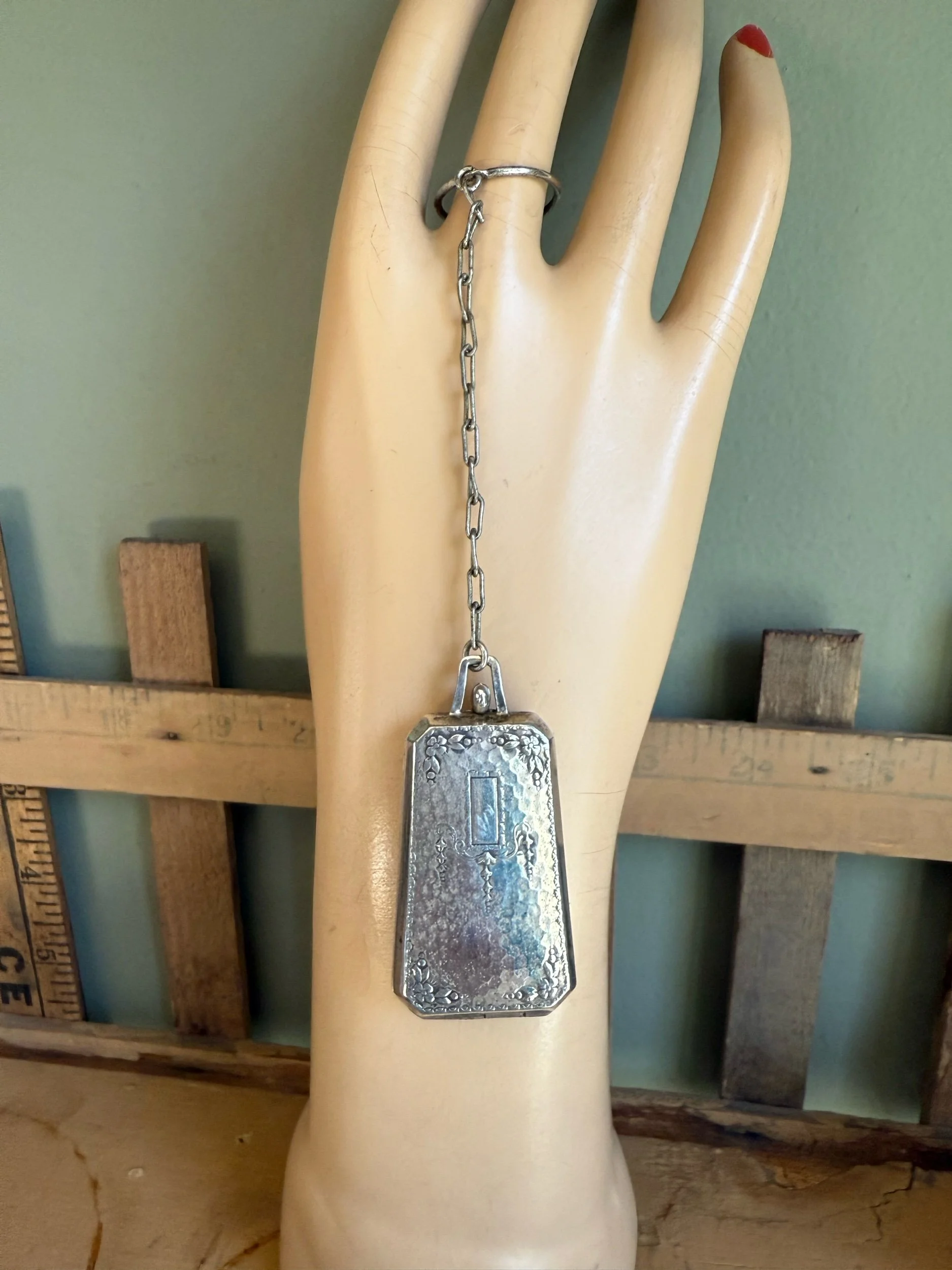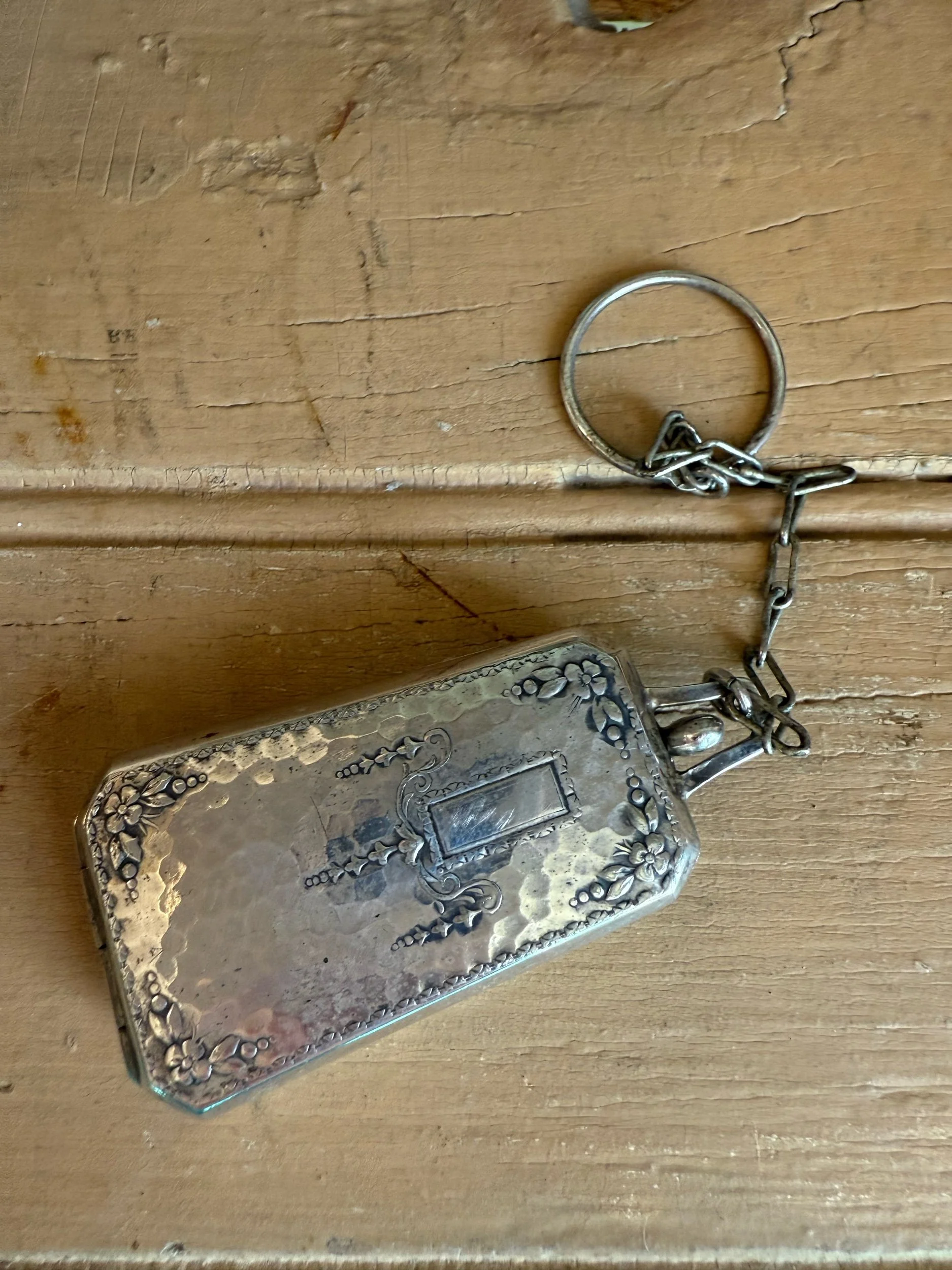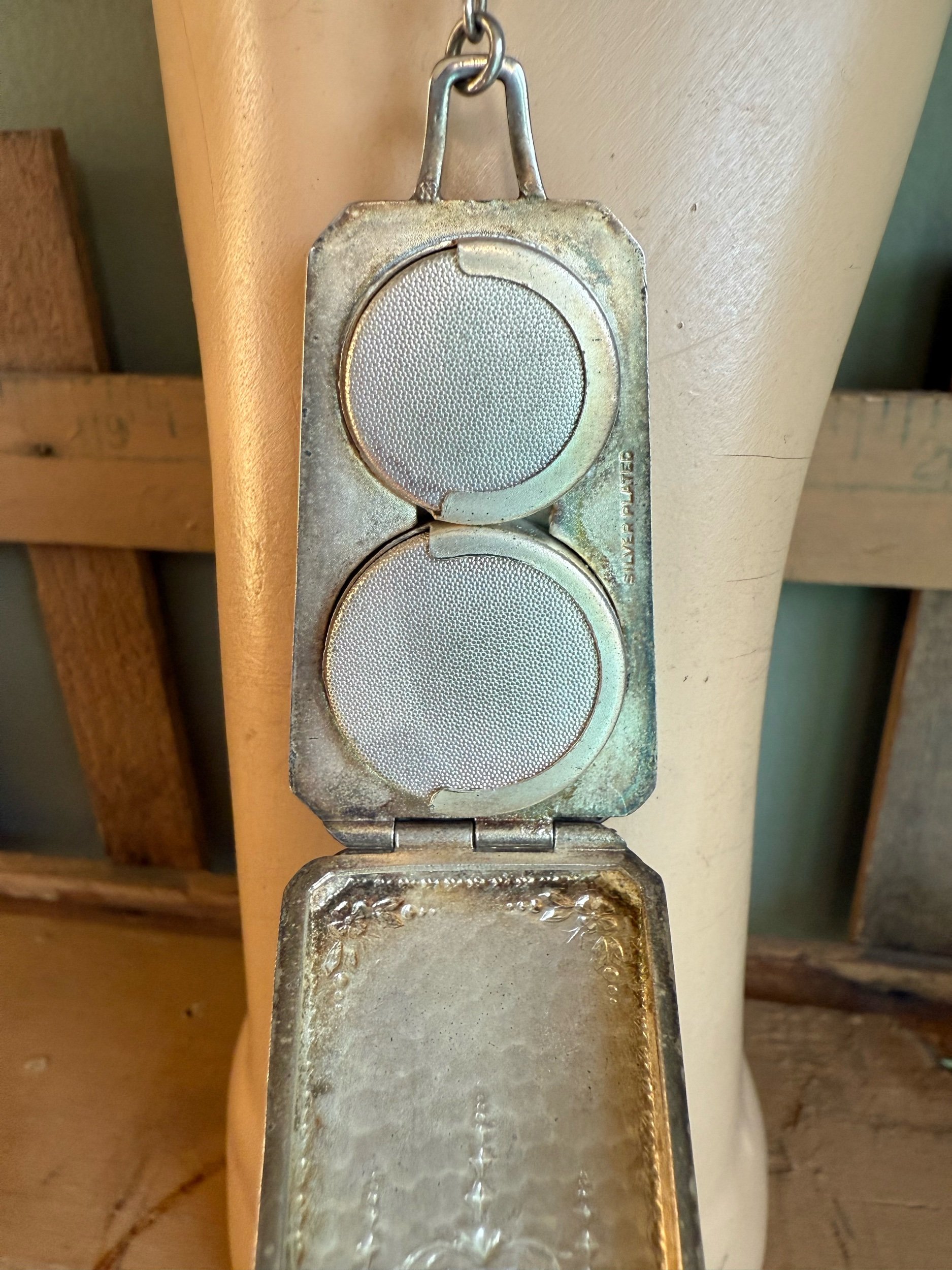 Silverplated coin compact. 2 1/4" length x 1 1/8" wide. Total length with finger ring 6 1/8". Both sides are decorative with garland, flowers and monogram plaque (unused), snaps shut and stays closed, springs in coin slots in very good condition. The front and back have a hand hammered finish.