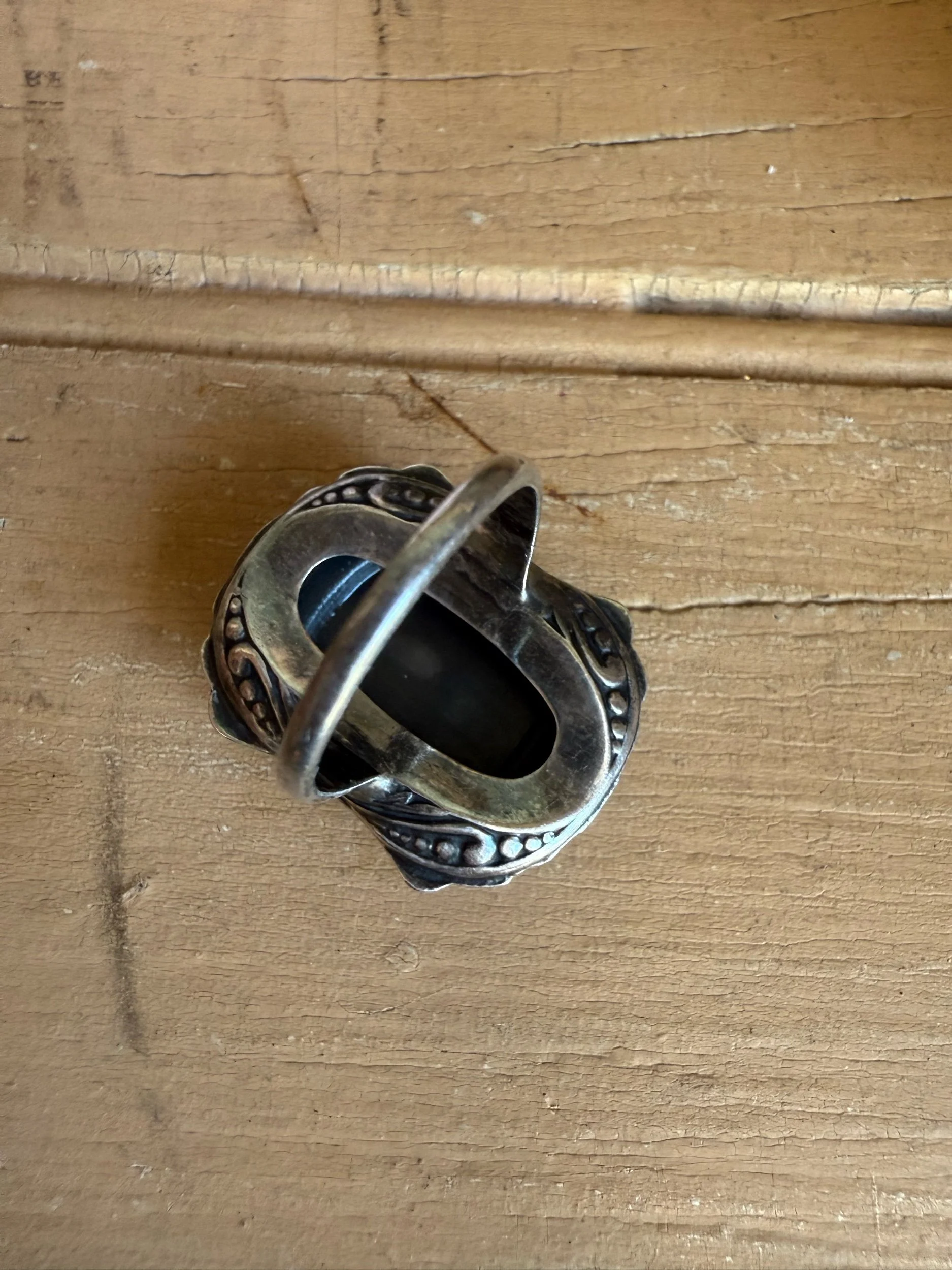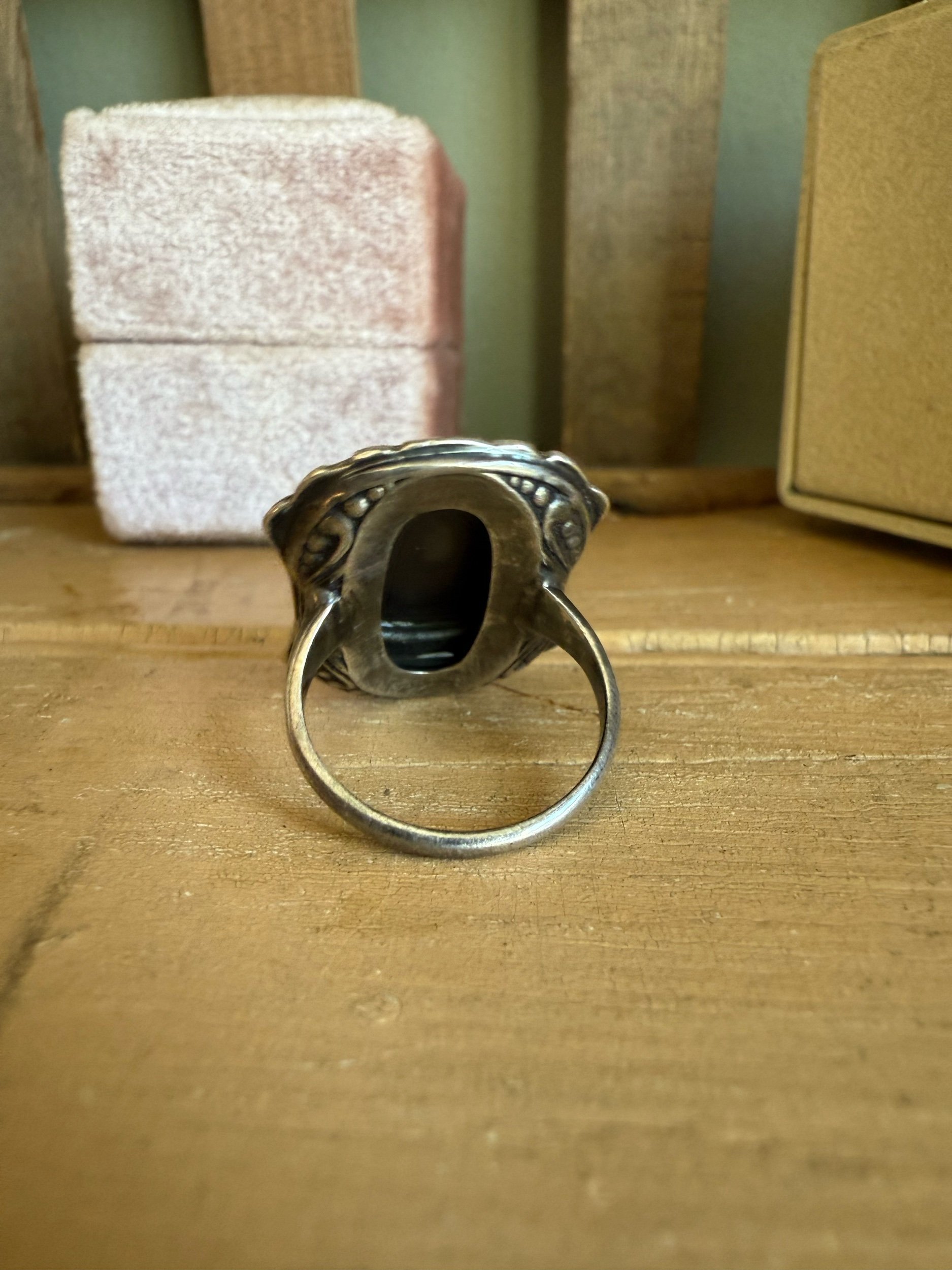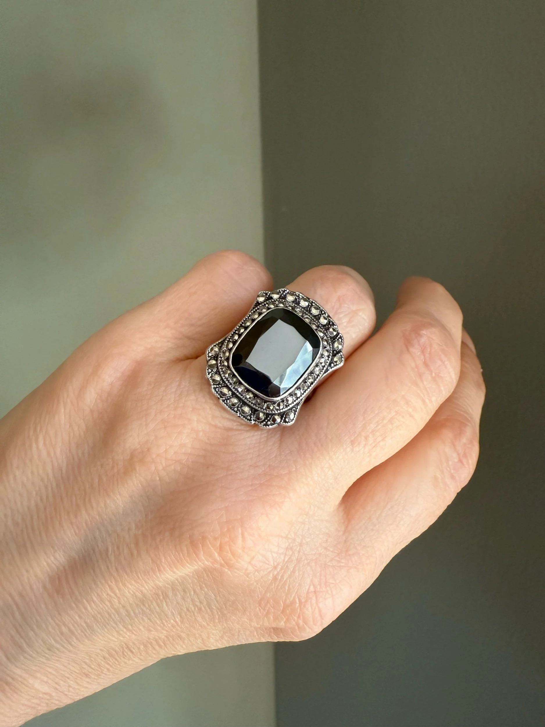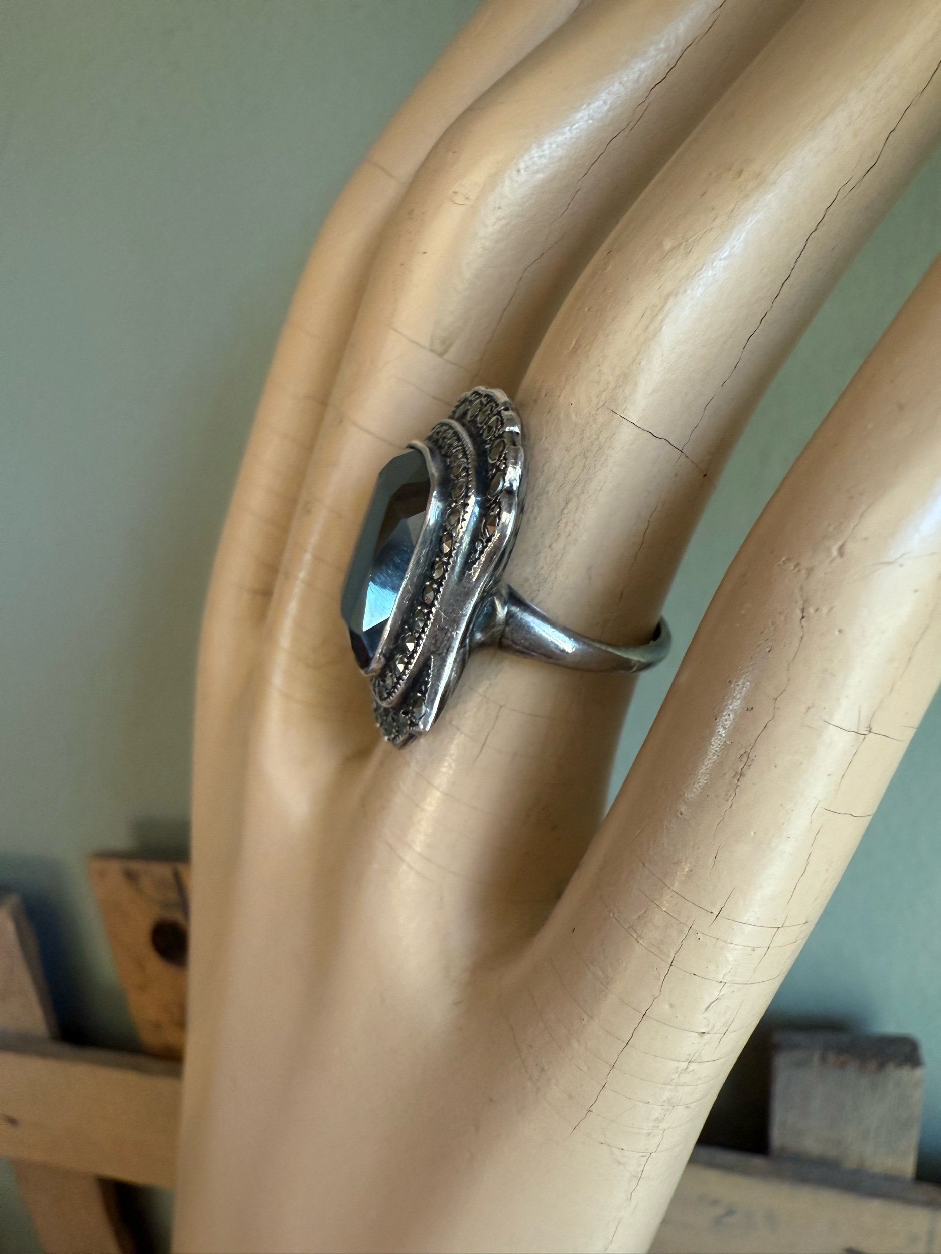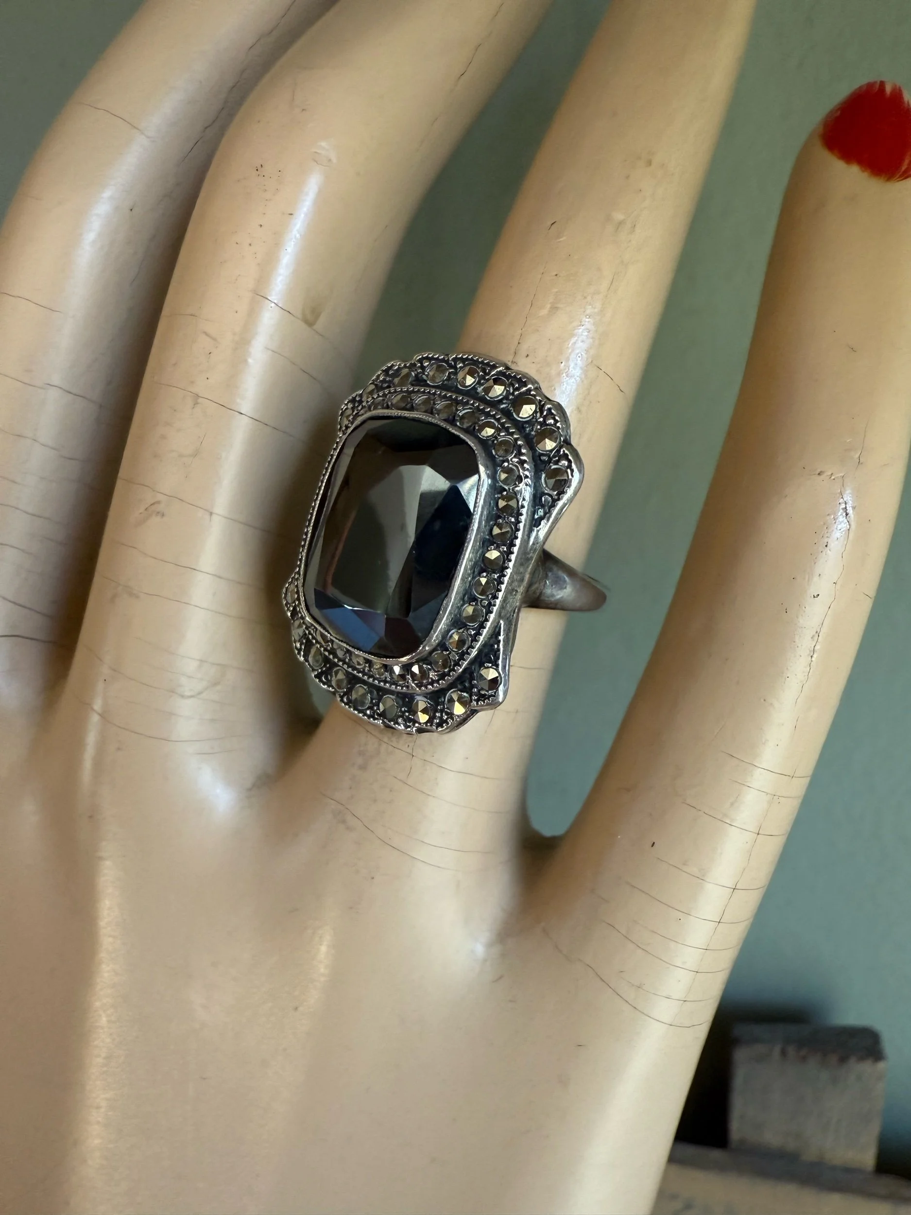 Excellent preowned condition. Sterling silver ring by Uncas. This Art Deco ring features a rectangle cut hemitite surrounded by two tiers of set round cut marcasite (hemitite). Even the back is beautiful with engraving. 1" x 3/4". A big bold ring.