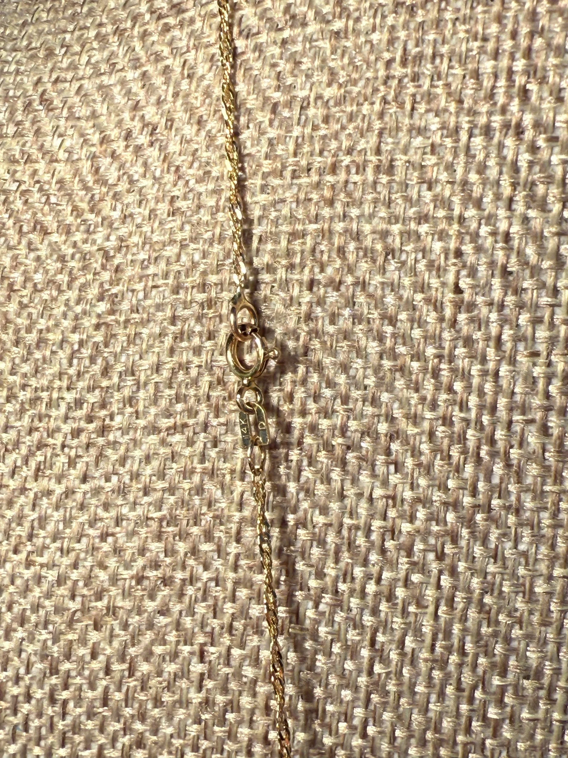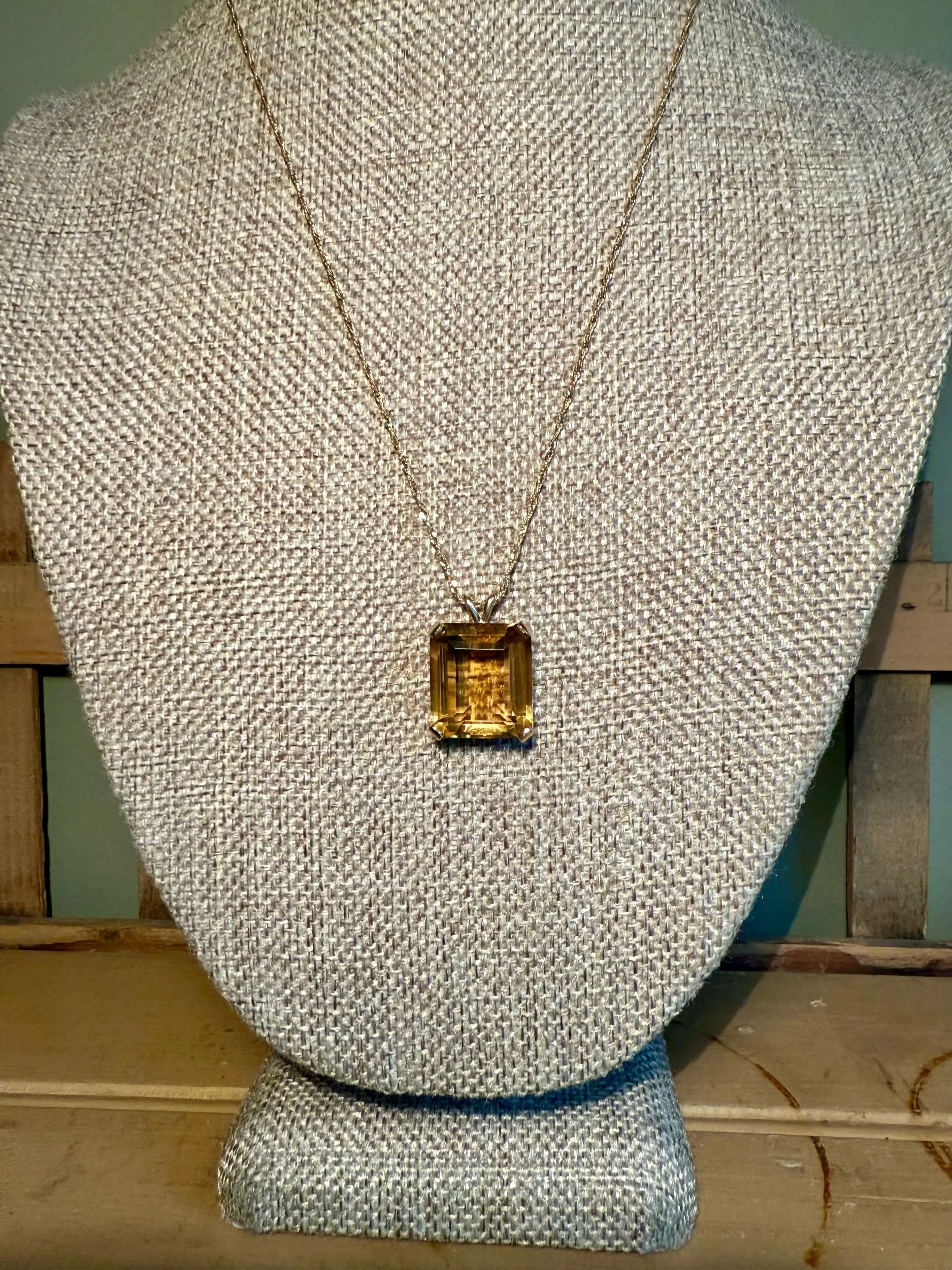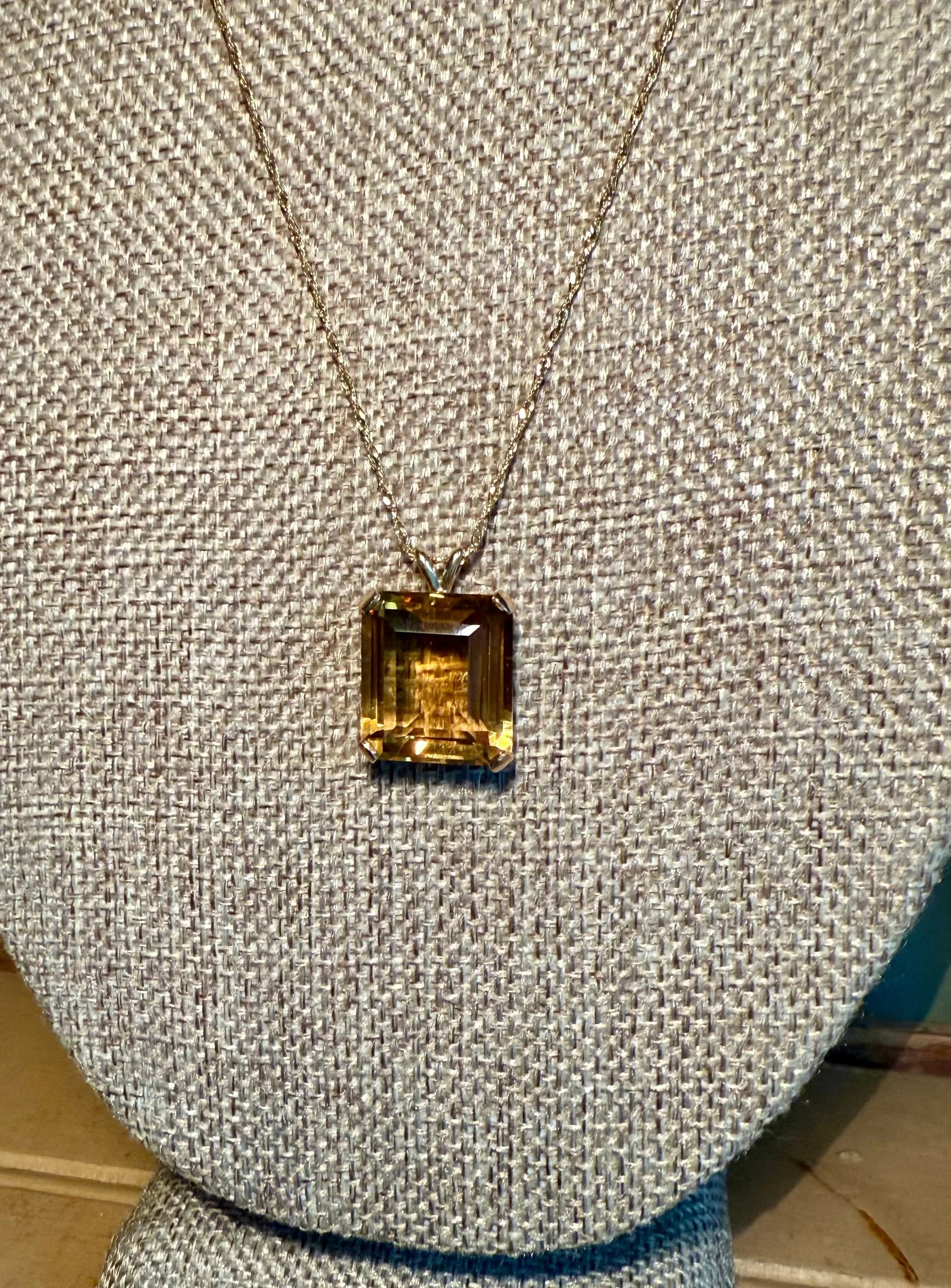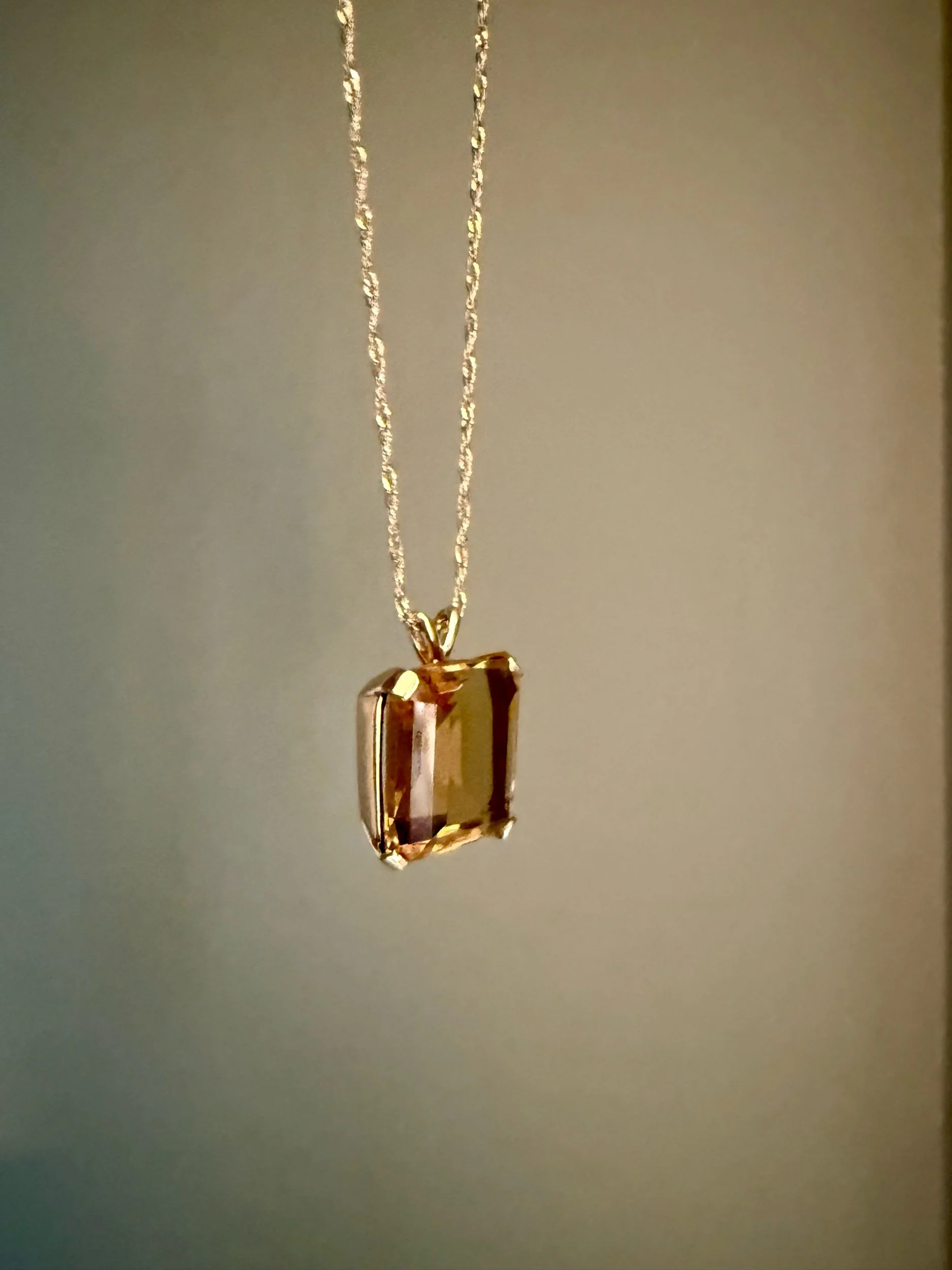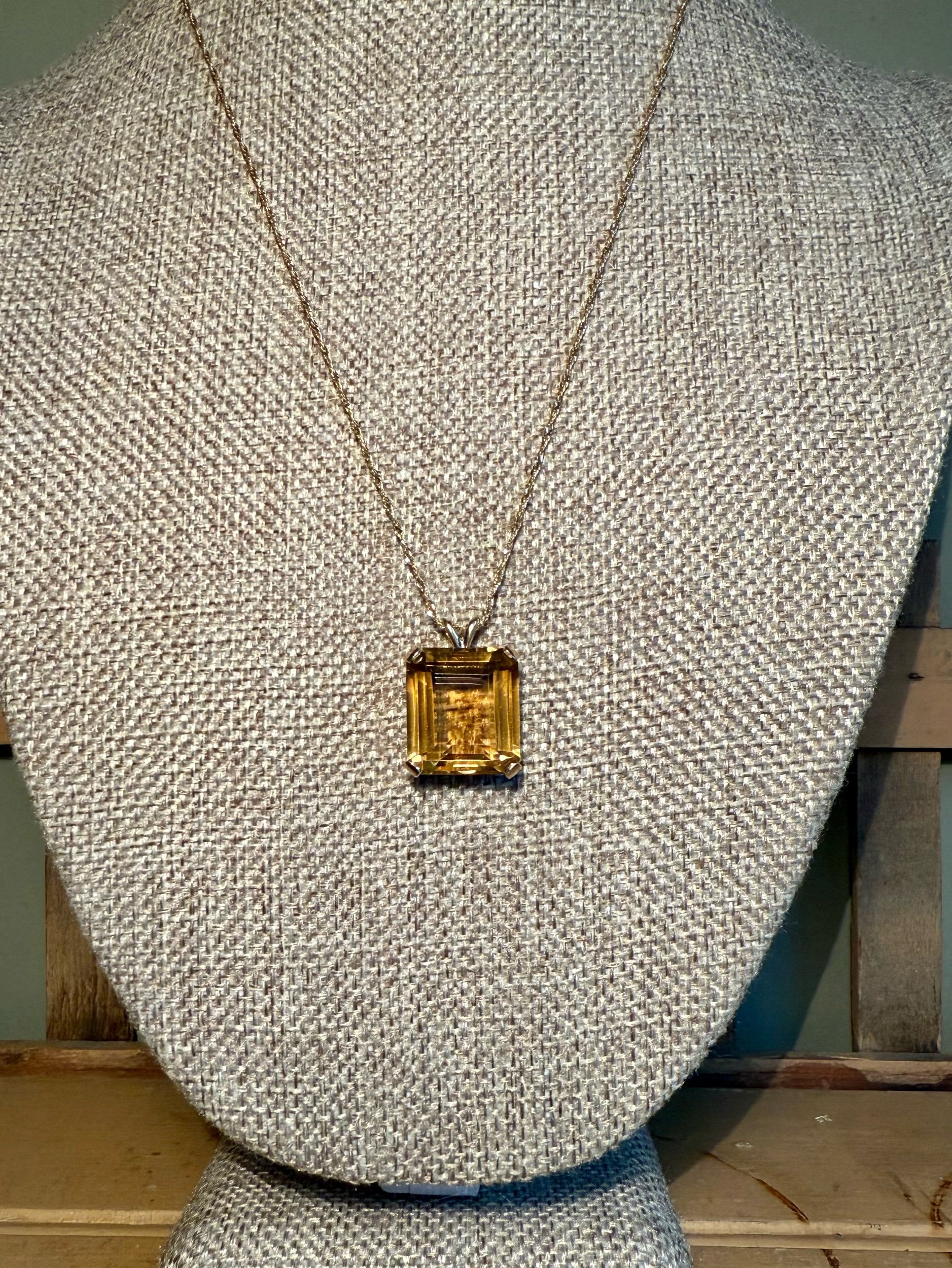 A warm slightly orangish yellow rectangle cut citrine, 15 x 16.85 mm, approx. 21 cts set in a four corner prong pendant. Hanging from a sparkling 14K yellow gold tisted rope style link chain, 18" length, spring ring closure.