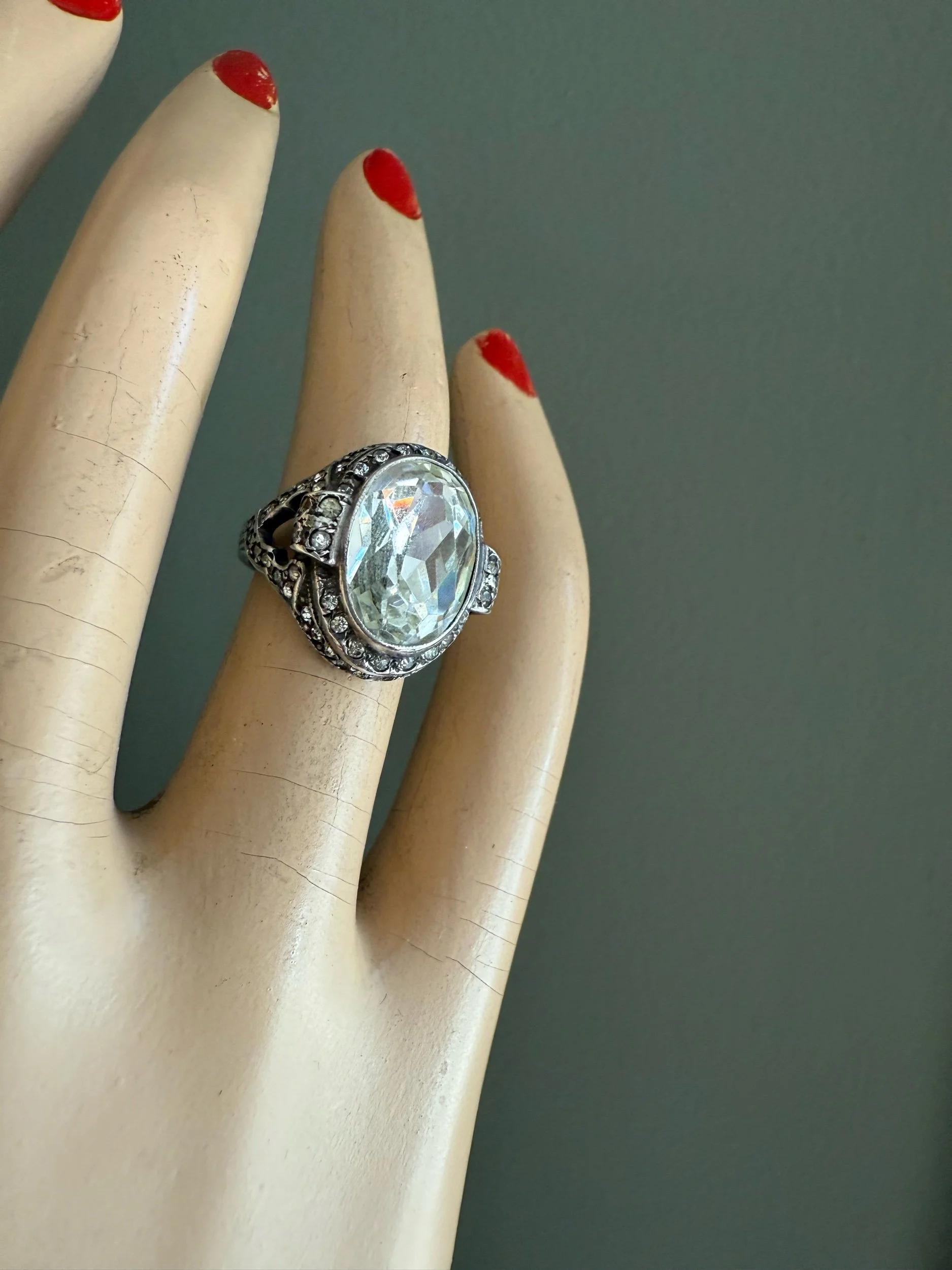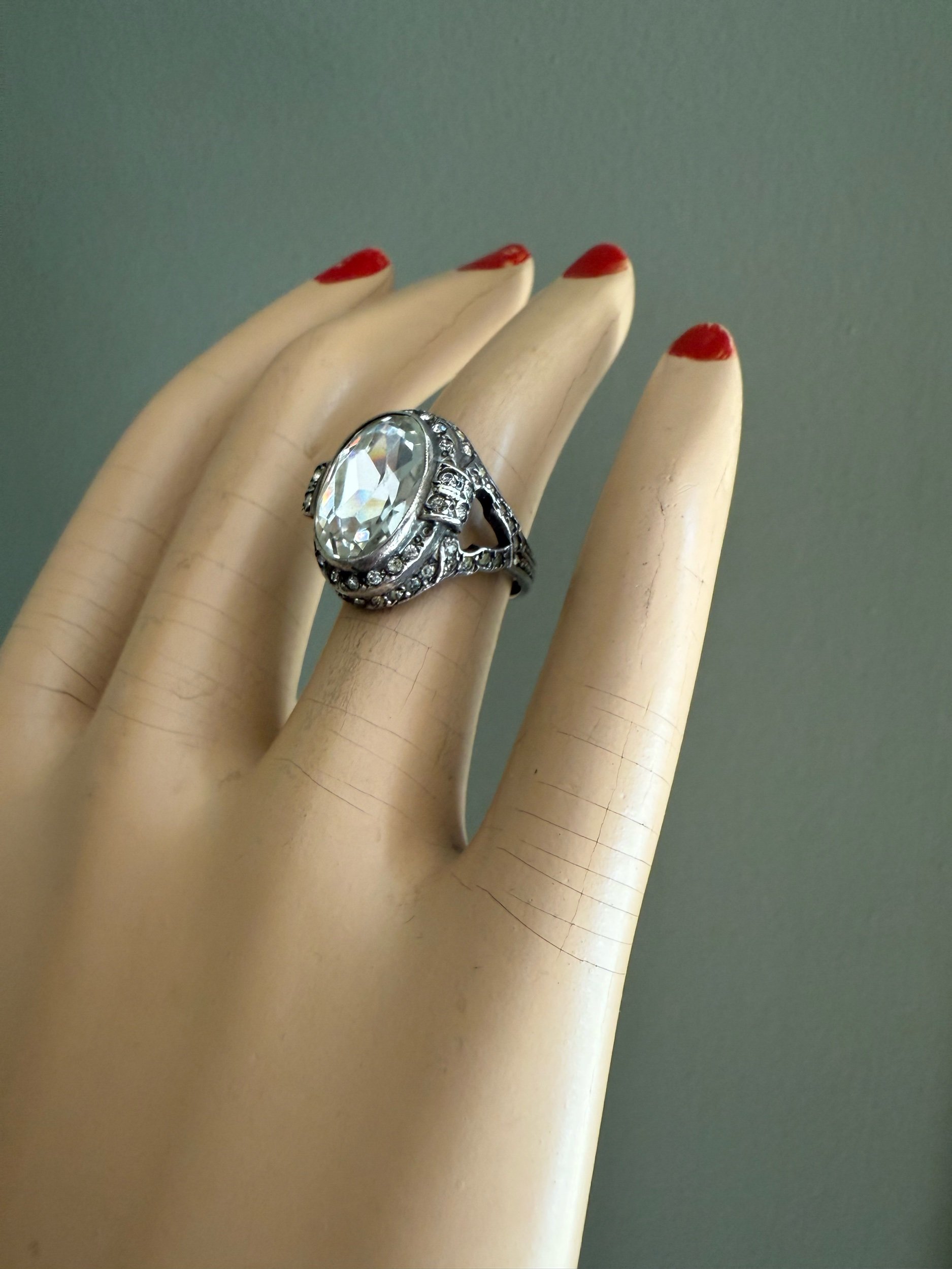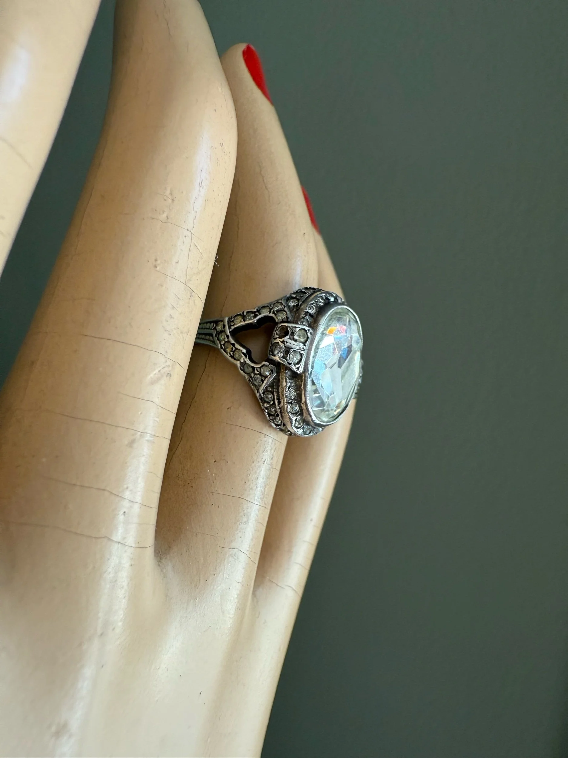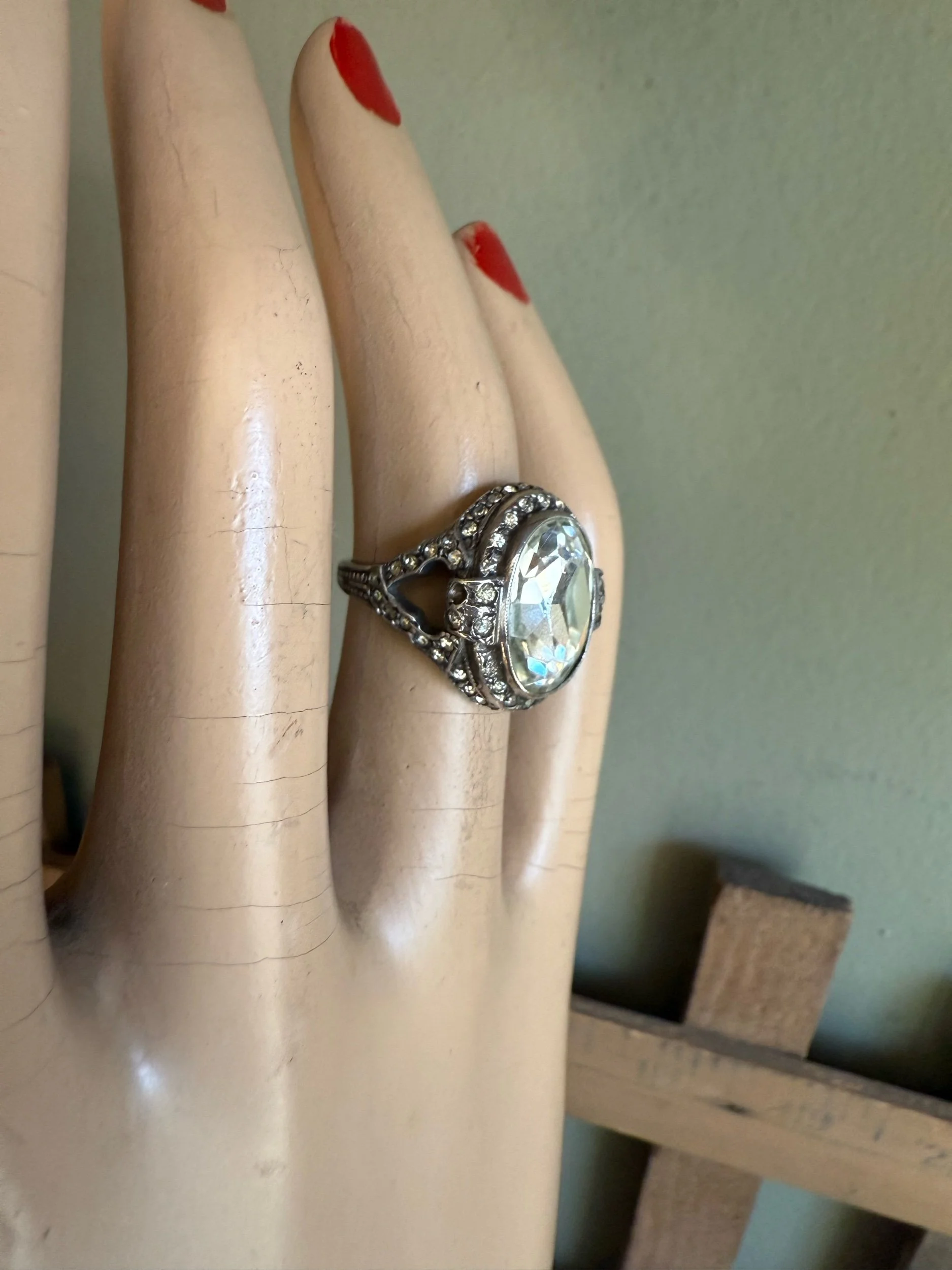 Sterling silver (stamped in shank) and tested vintage ring. Oval cut crystal measuring 14 x 10 mm bezel set. There are round cut crystals throughout the setting. Please note one is missing. I didn't polish this so it will brighten if wipes with a cloth. The condition is very good-crystal is bright and sparkling.