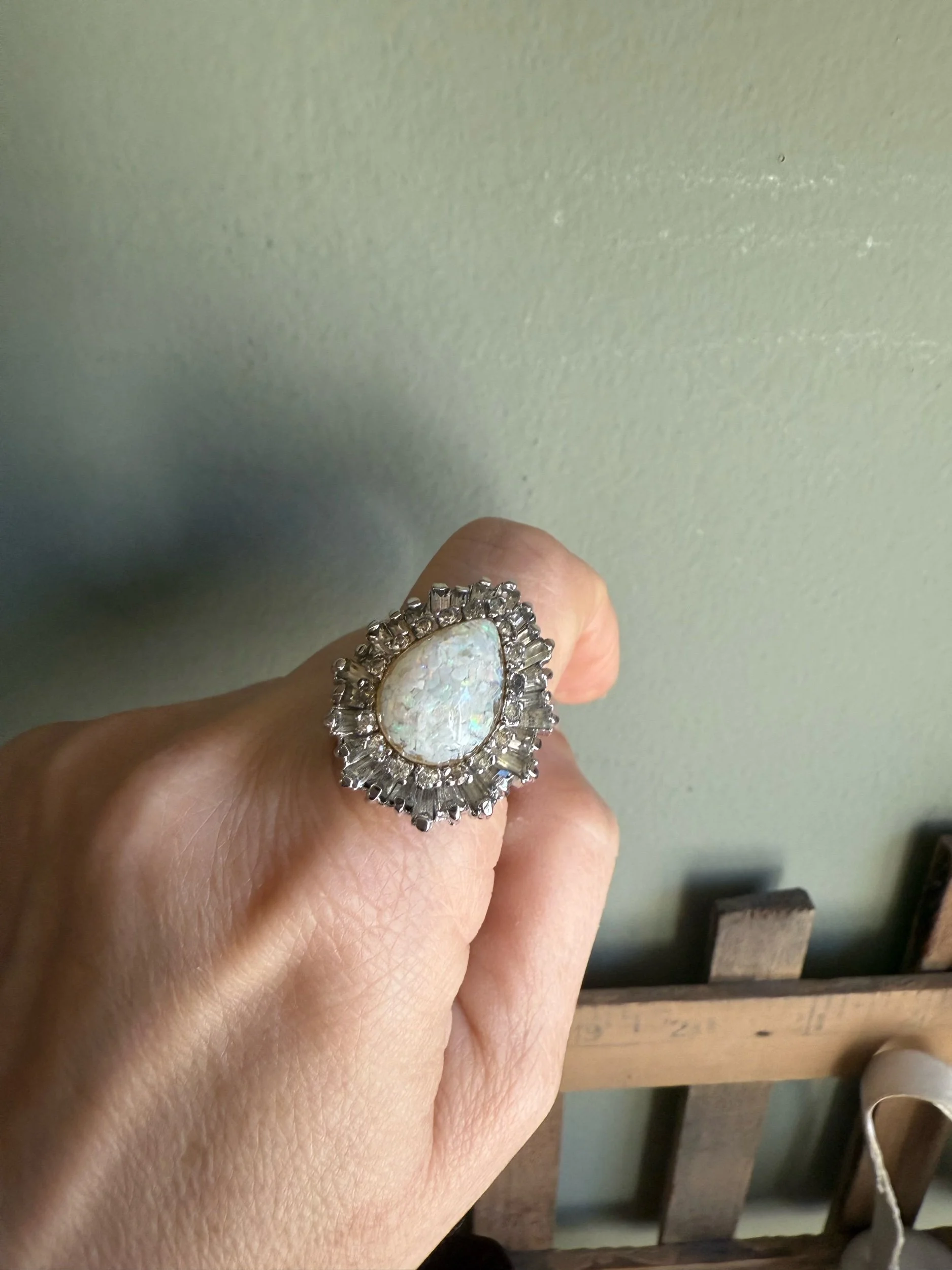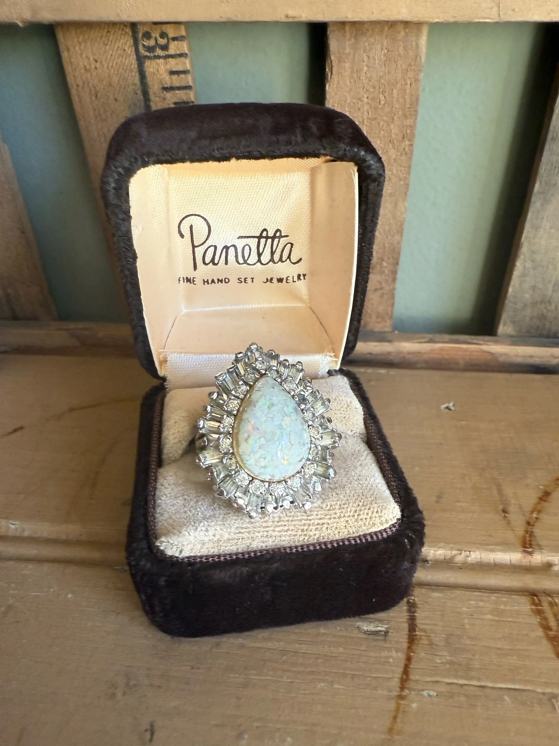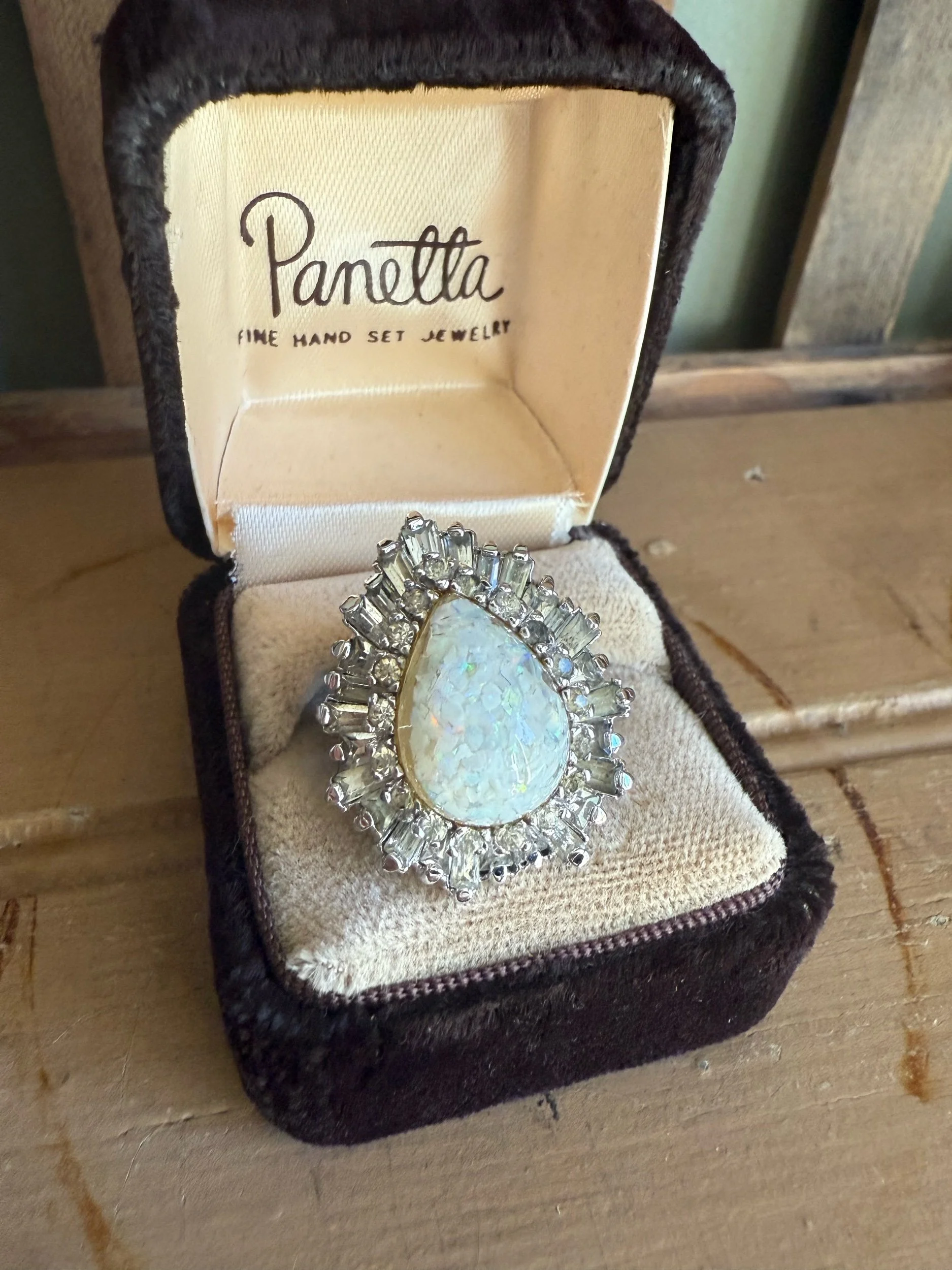 A fine costume ring by Panetta the metal is rhodium plated. The center is natural opal chips suspended in glass (reminds me of the floating opals of the time). Around the bezel set opal glass are round and baguette cut rhinestones prong set in two tiers. This piece was high end costume and hand set.
