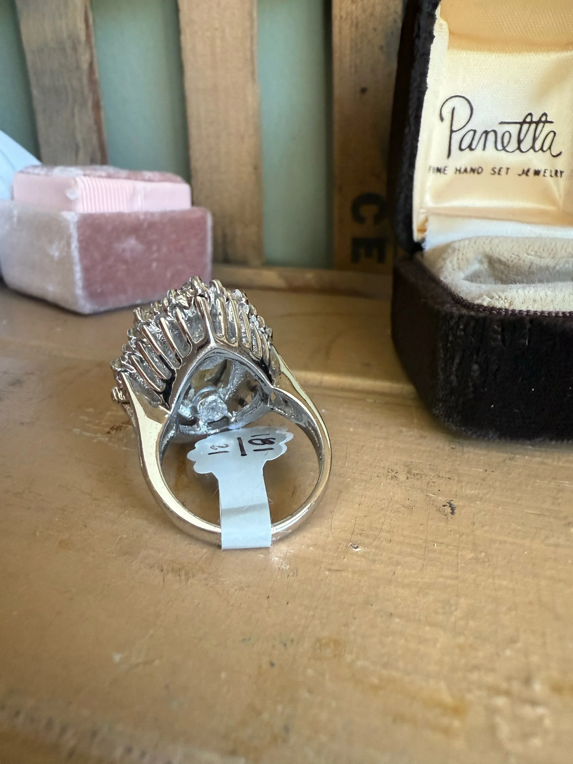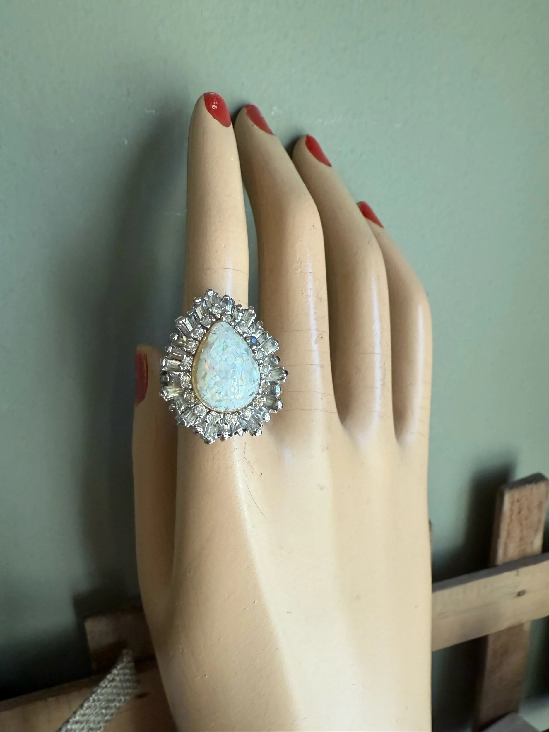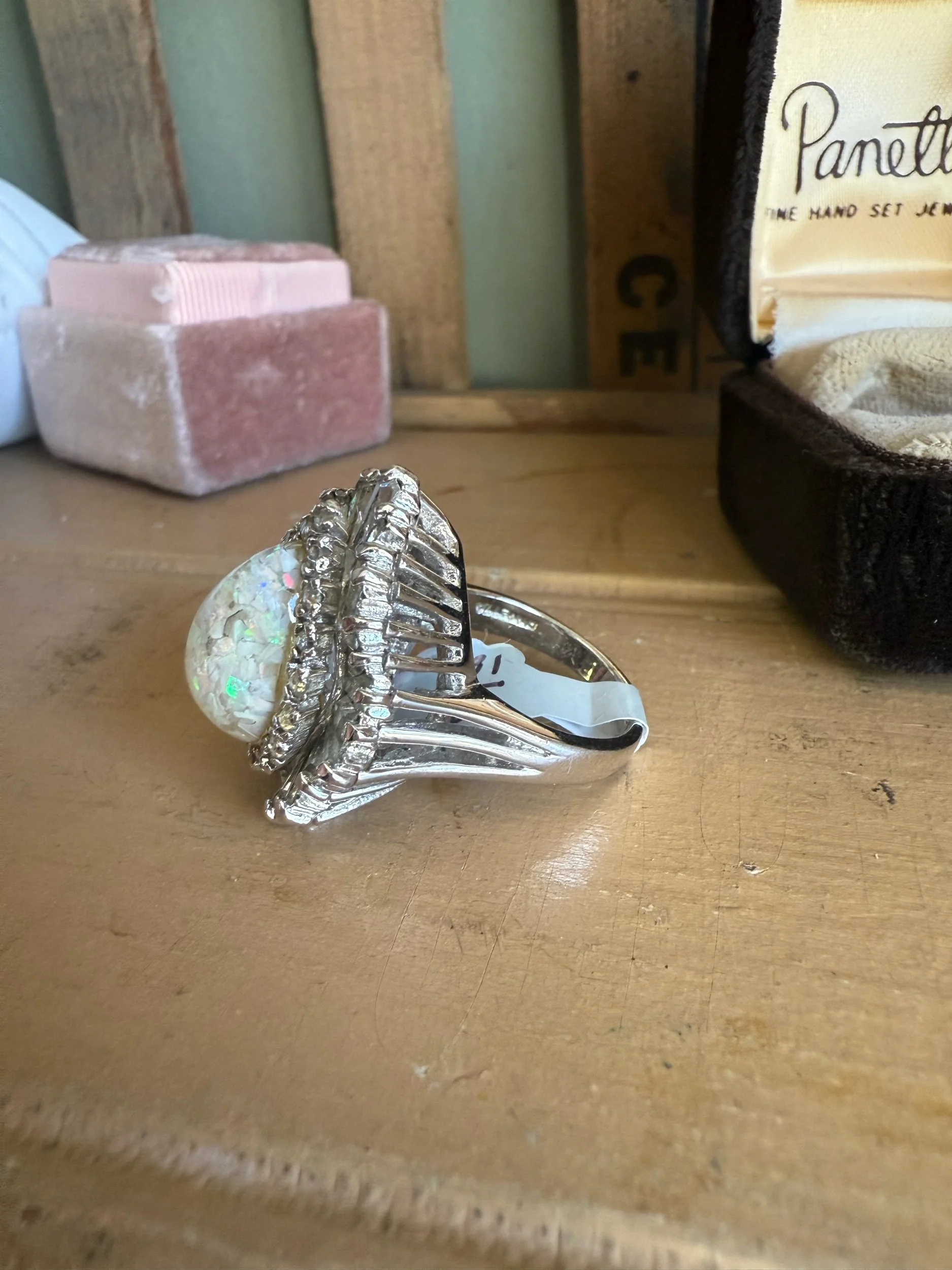 A fine costume ring by Panetta the metal is rhodium plated. The center is natural opal chips suspended in glass (reminds me of the floating opals of the time). Around the bezel set opal glass are round and baguette cut rhinestones prong set in two tiers. This piece was high end costume and hand set.