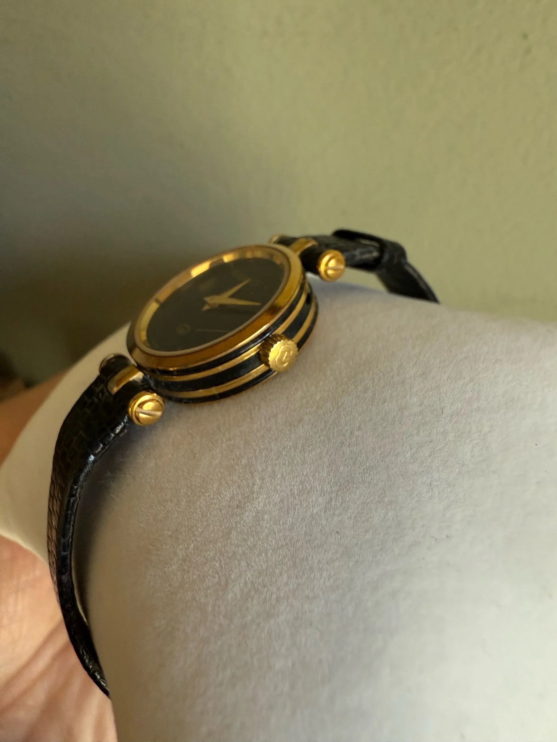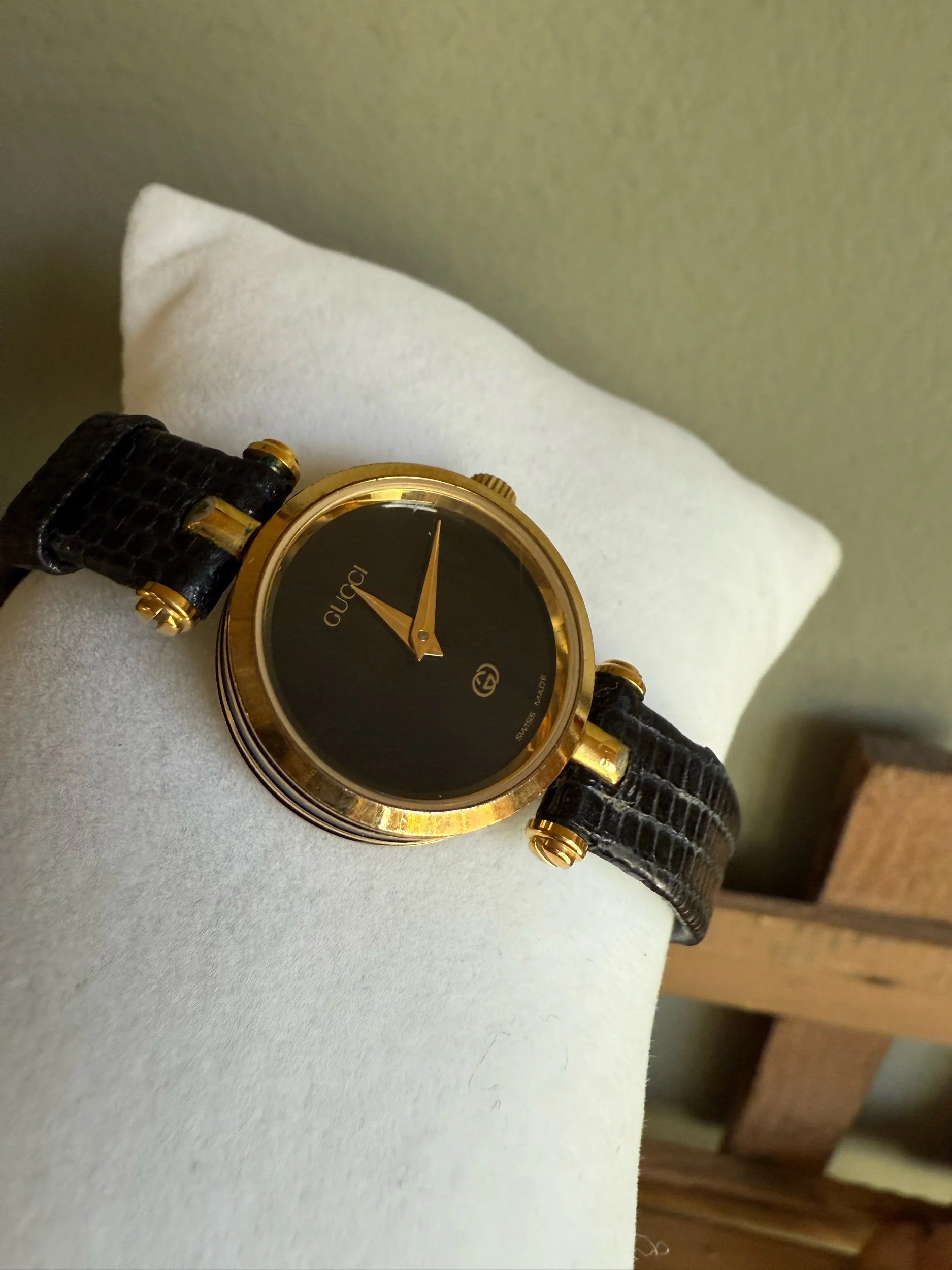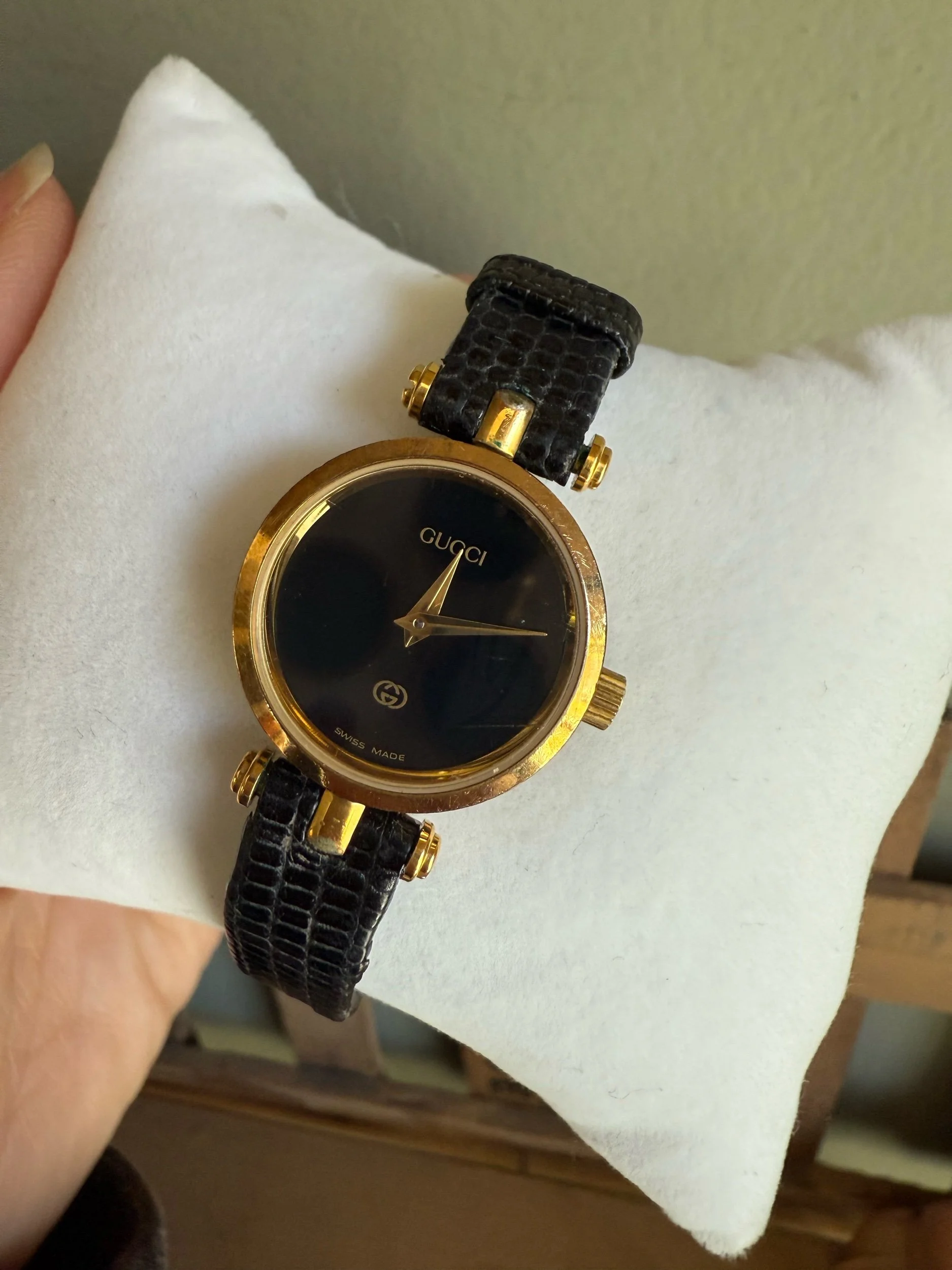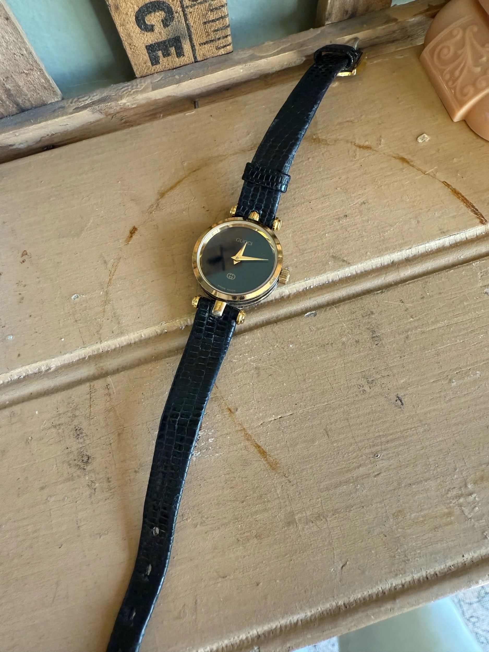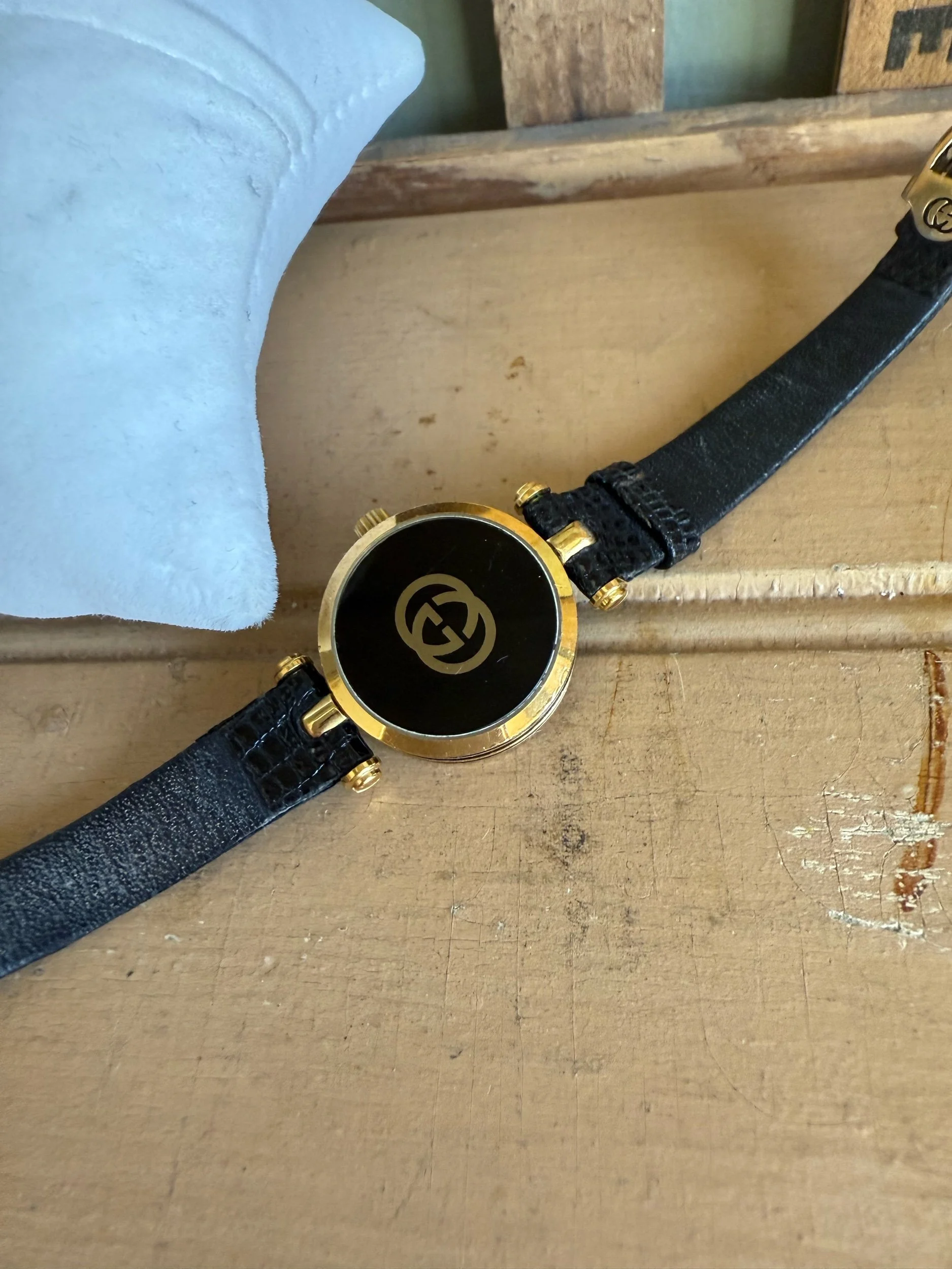 A vintage designer Gucci watch. The case is a little larger than 3/4" diameter. Have fluted sides with black enameling. Quartz movement that is working, fresh battery. This has been on my desk a week keeping good time but please note I can't always promise it will work. Quartz movements are pretty inexpensive to replace if needed.