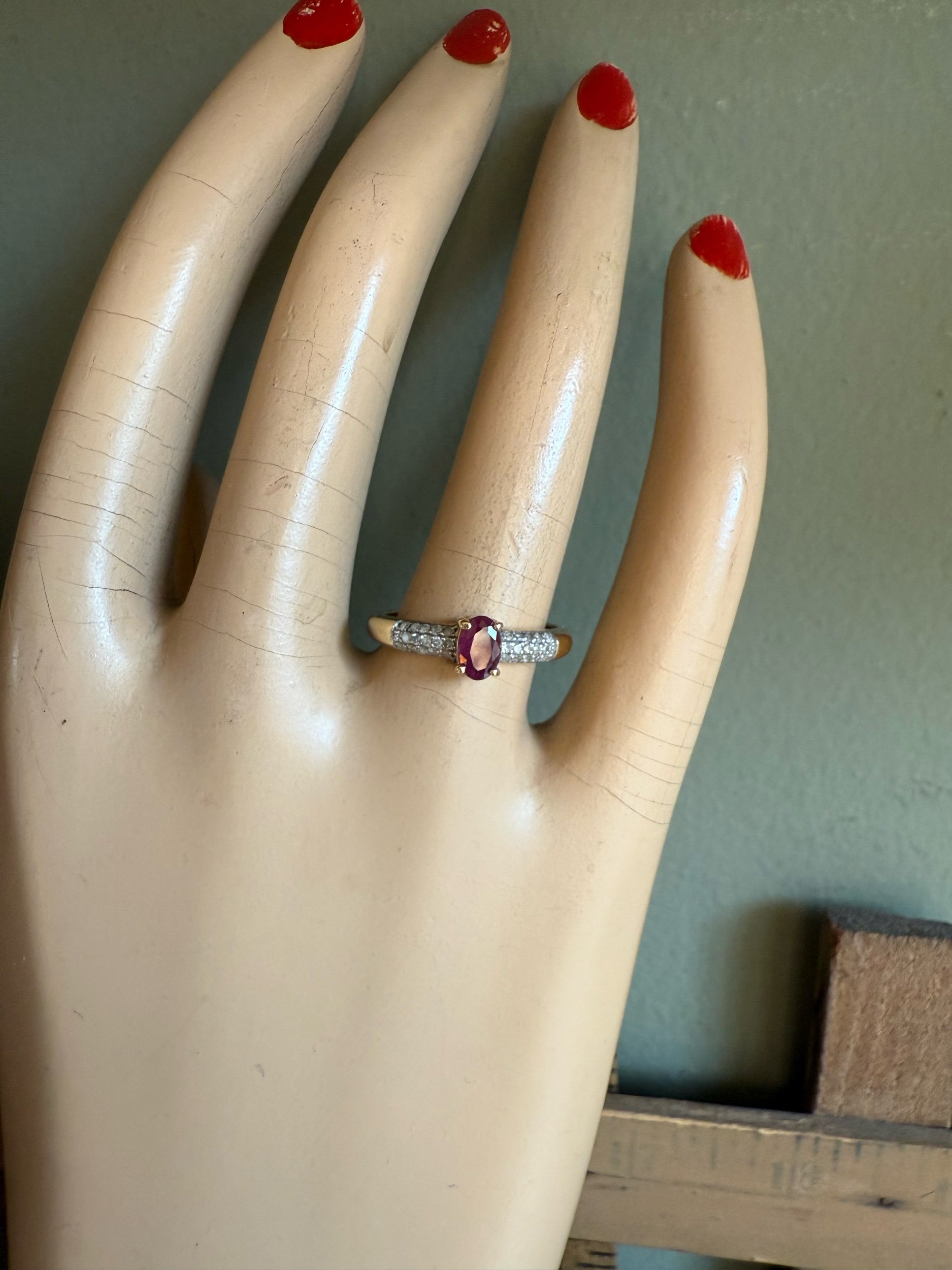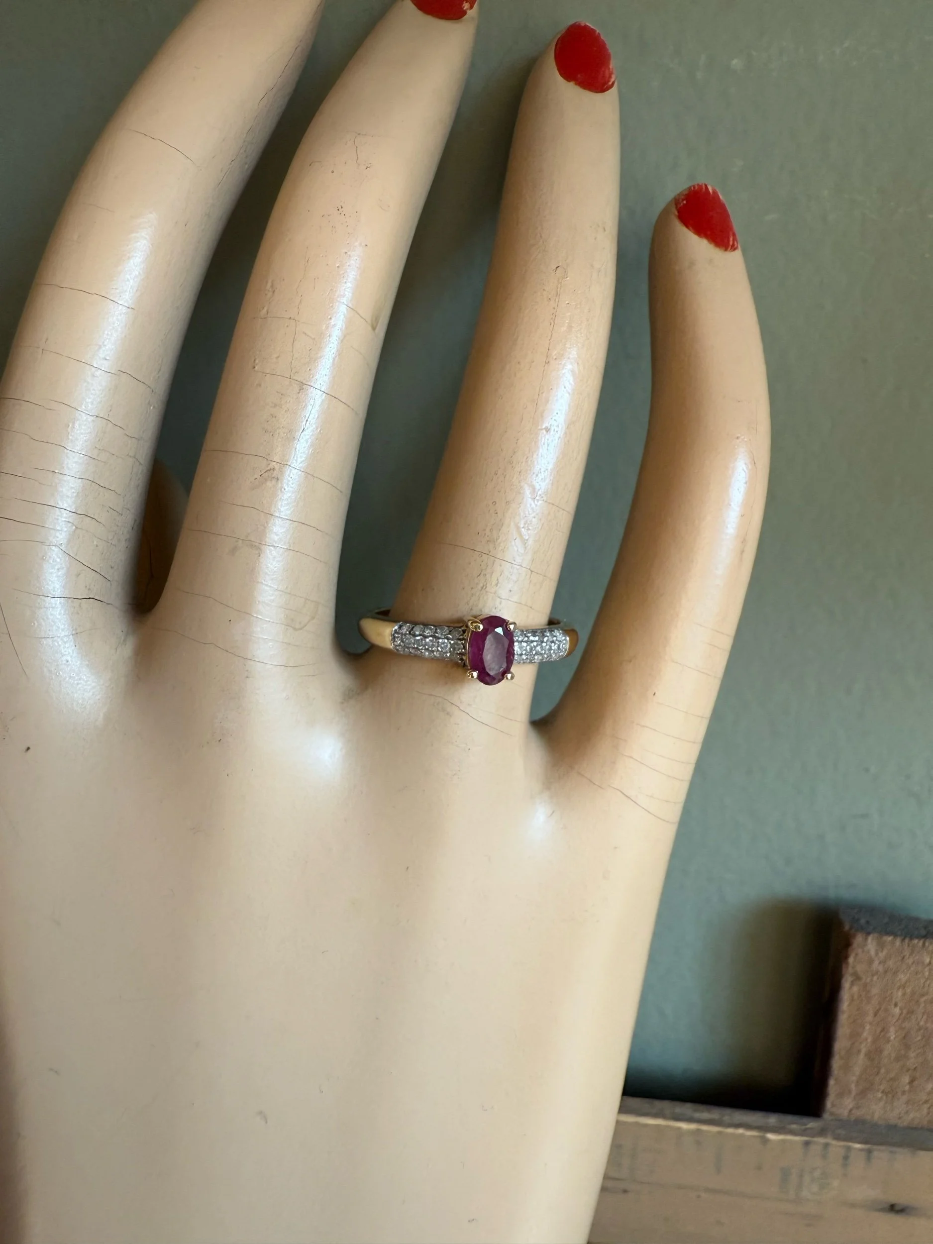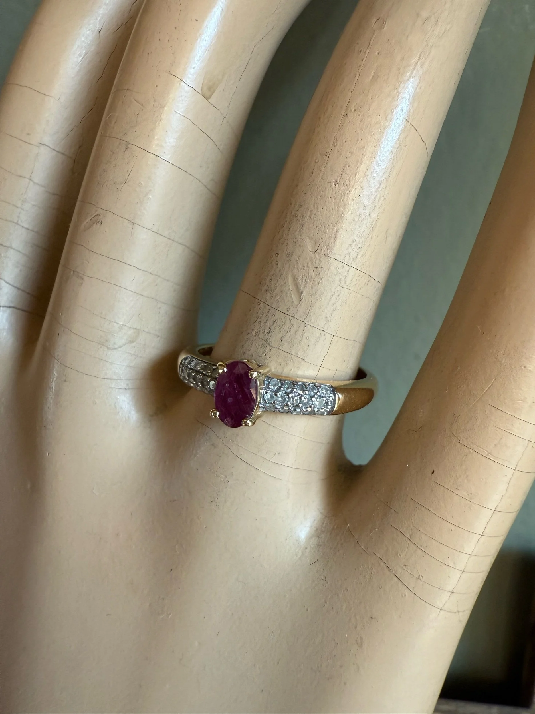 14k yellow gold ring (stamped 14K and tested) featuring a medium slightly pinkish red oval ruby measuring approx. 5.87 x 4 mm, set by four prongs. On each side are small round cut diamonds set pave style in white gold. Currently a size 8 but can be resized-reach out for details. 2.2 grams