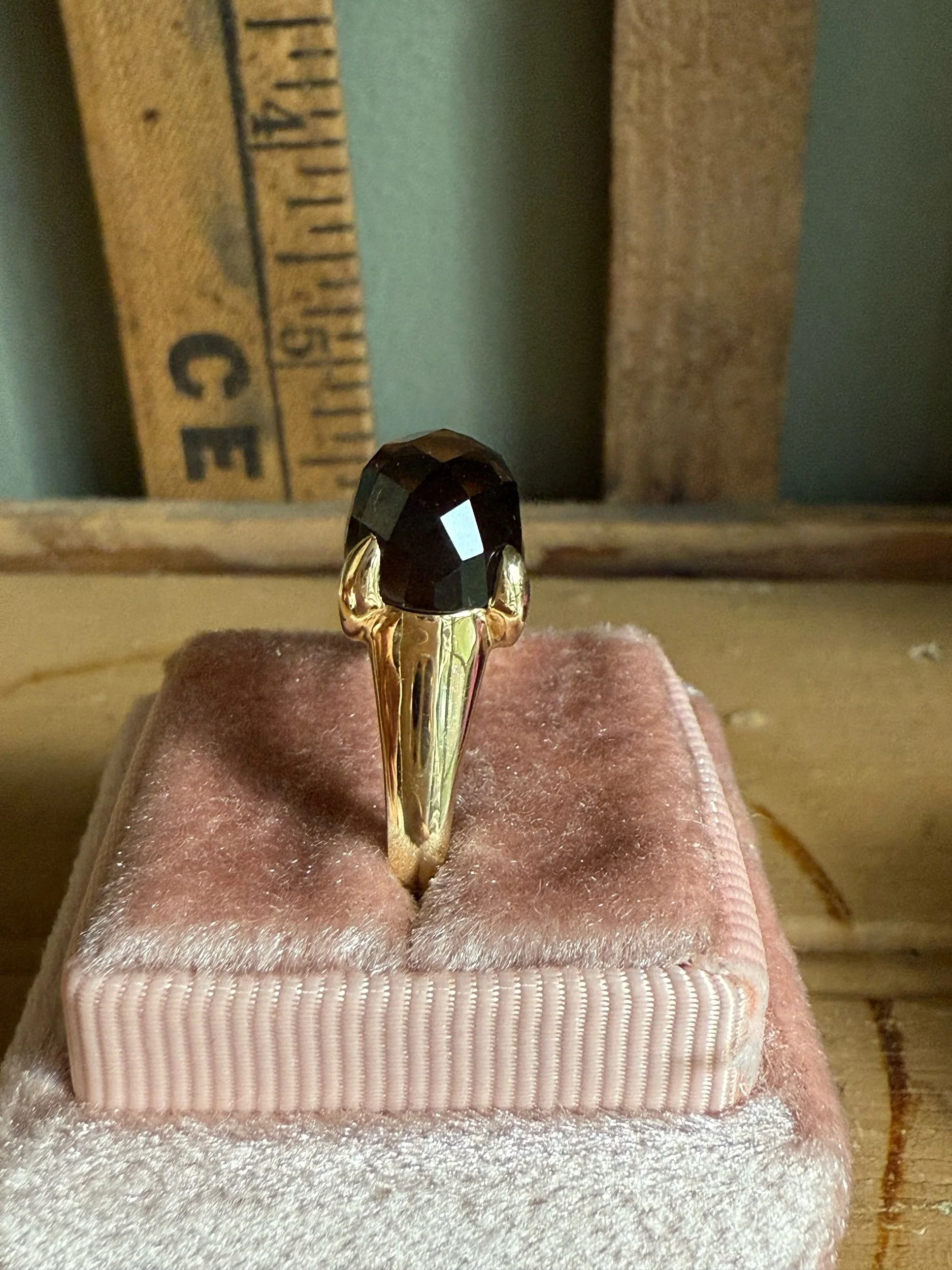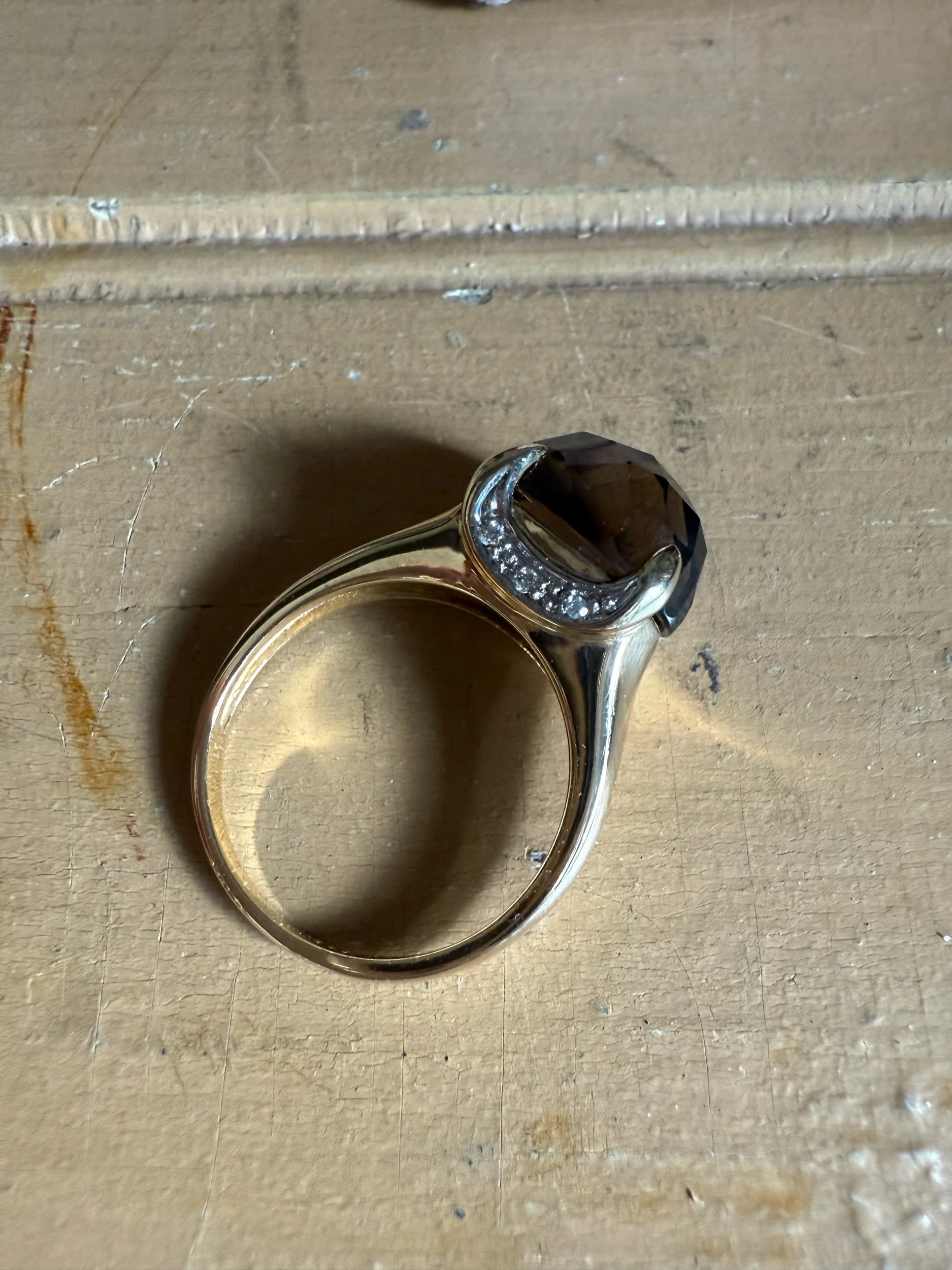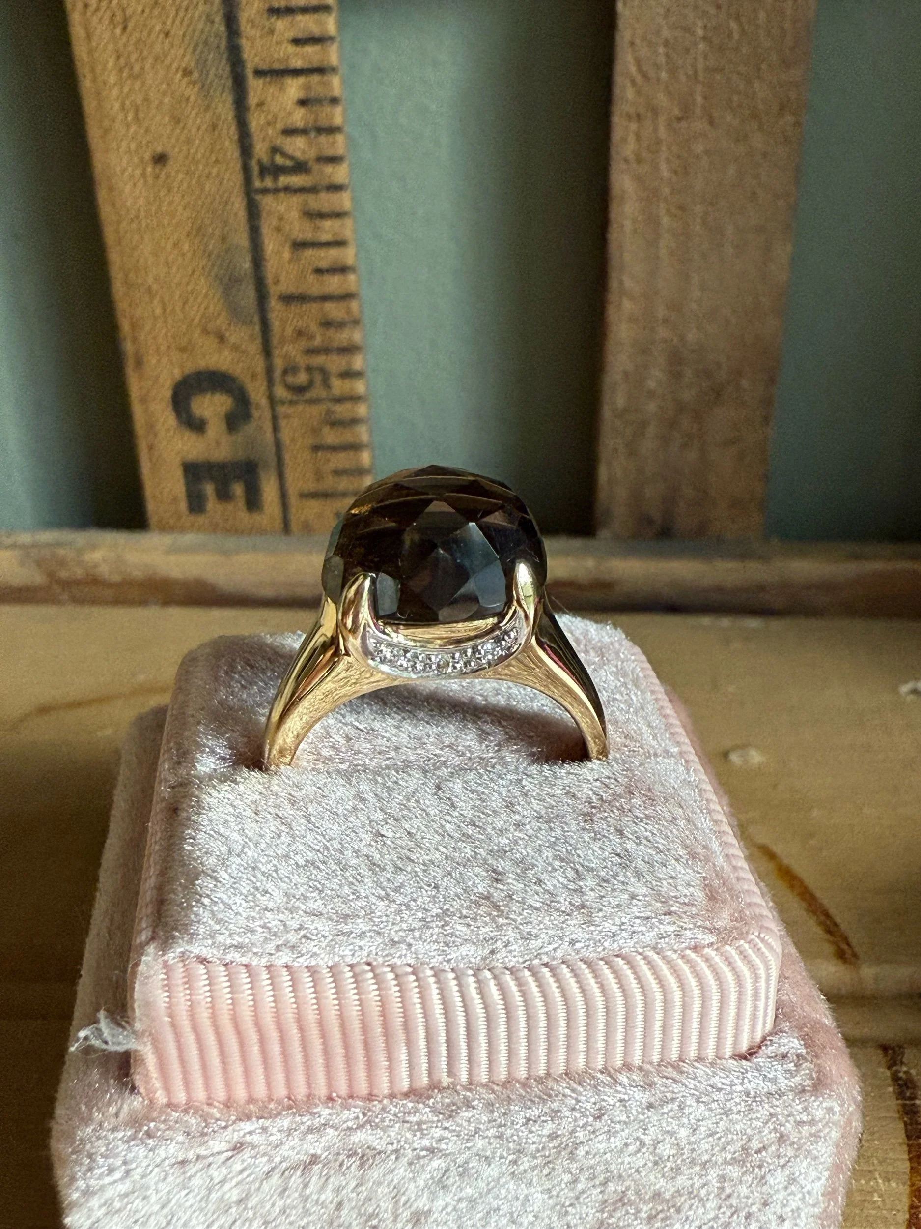 14k yellow gold (stamped and verified) ring features a checkerboard cut cabochon smoky quartz measuring approx. 12.20 x 9.10 mm set by four prongs. The top of the ring sits off the finger 10.90 mm. The galleries are set with three round cut diamonds in white gold on each side.