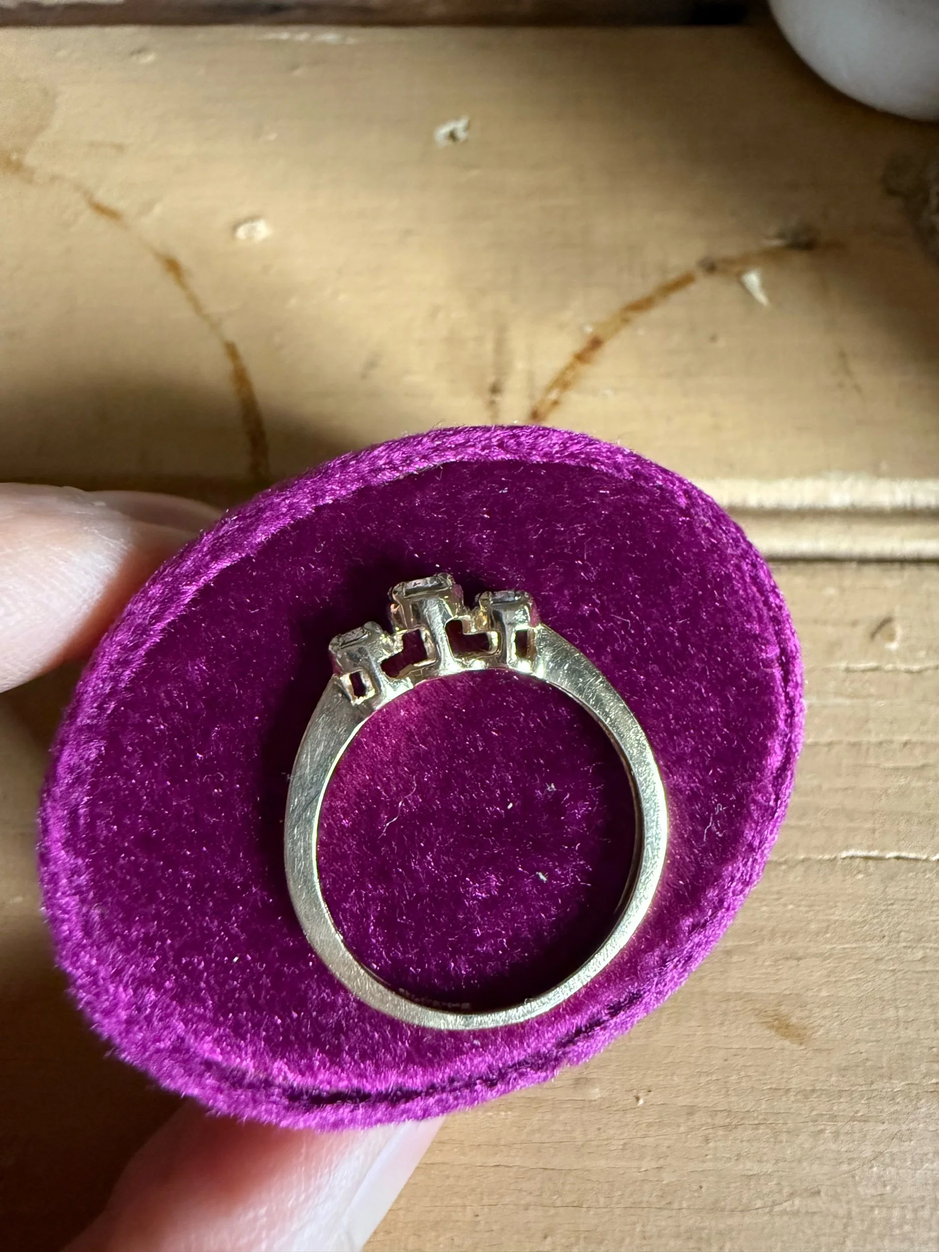 14K yellow gold ring (stamped in shank and tested) featuring three round cut natural diamonds, near colorless, i clarity, center measures approx. 3.23 mm diameter, sides measure approx. 2.68 mm diameter each.