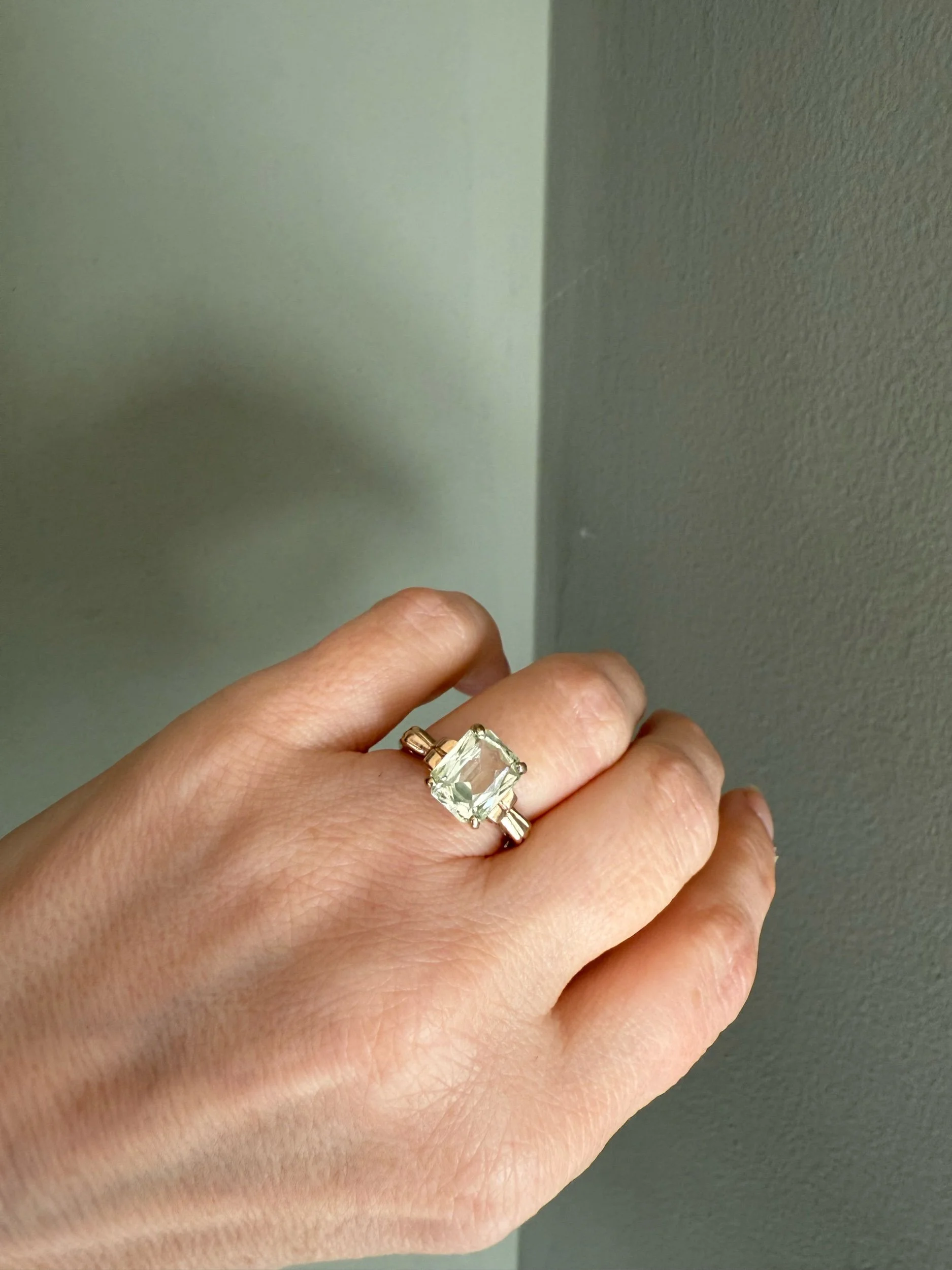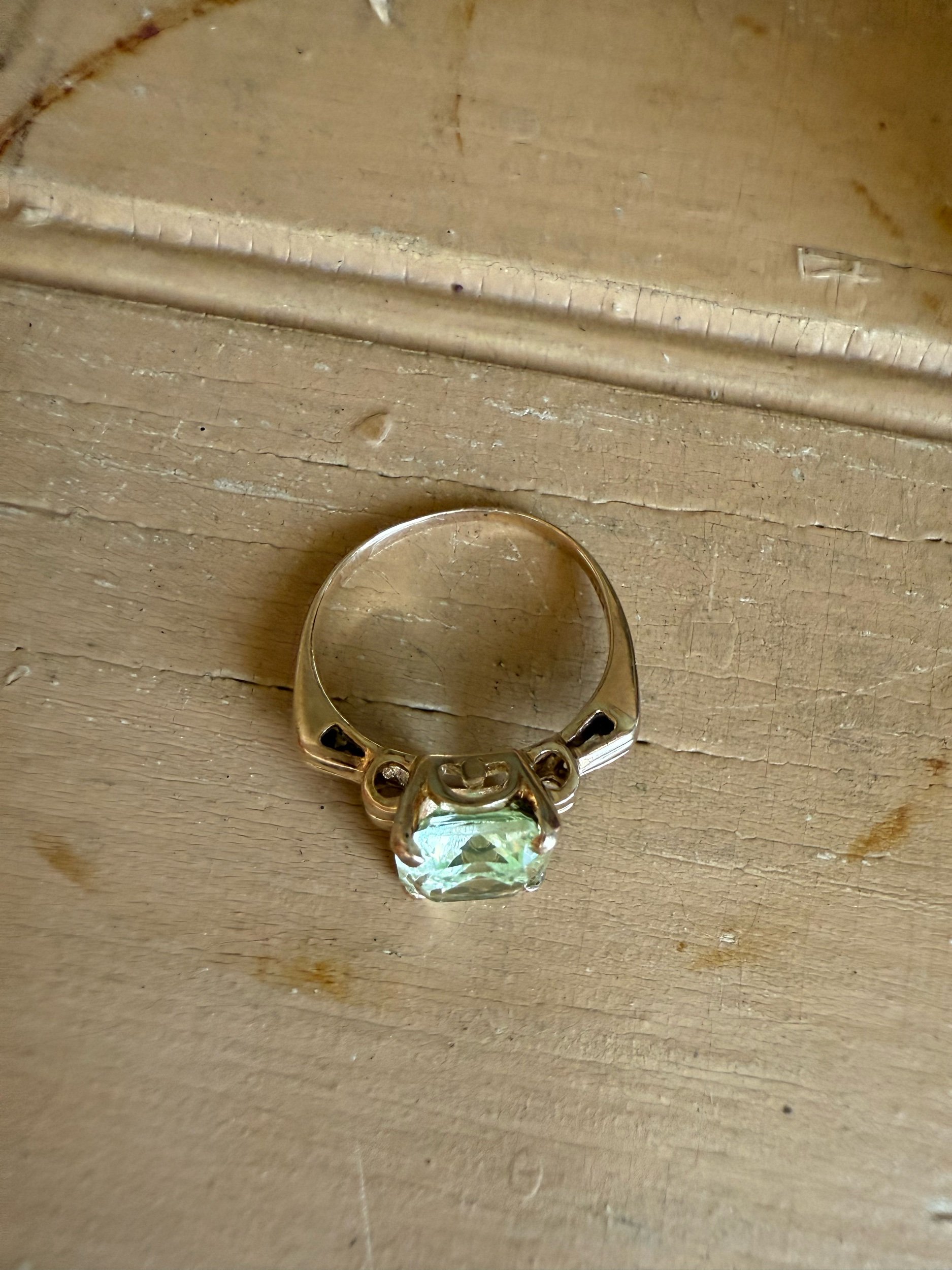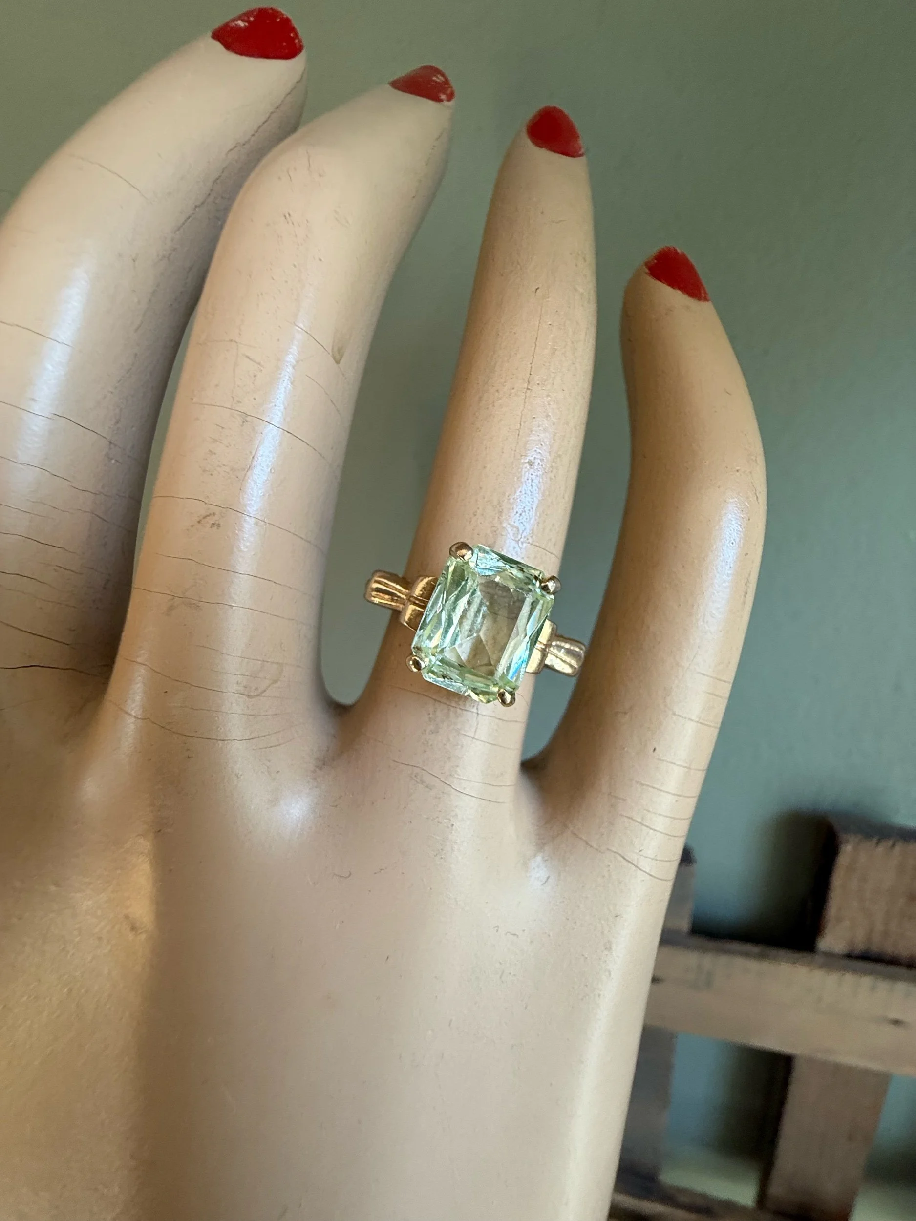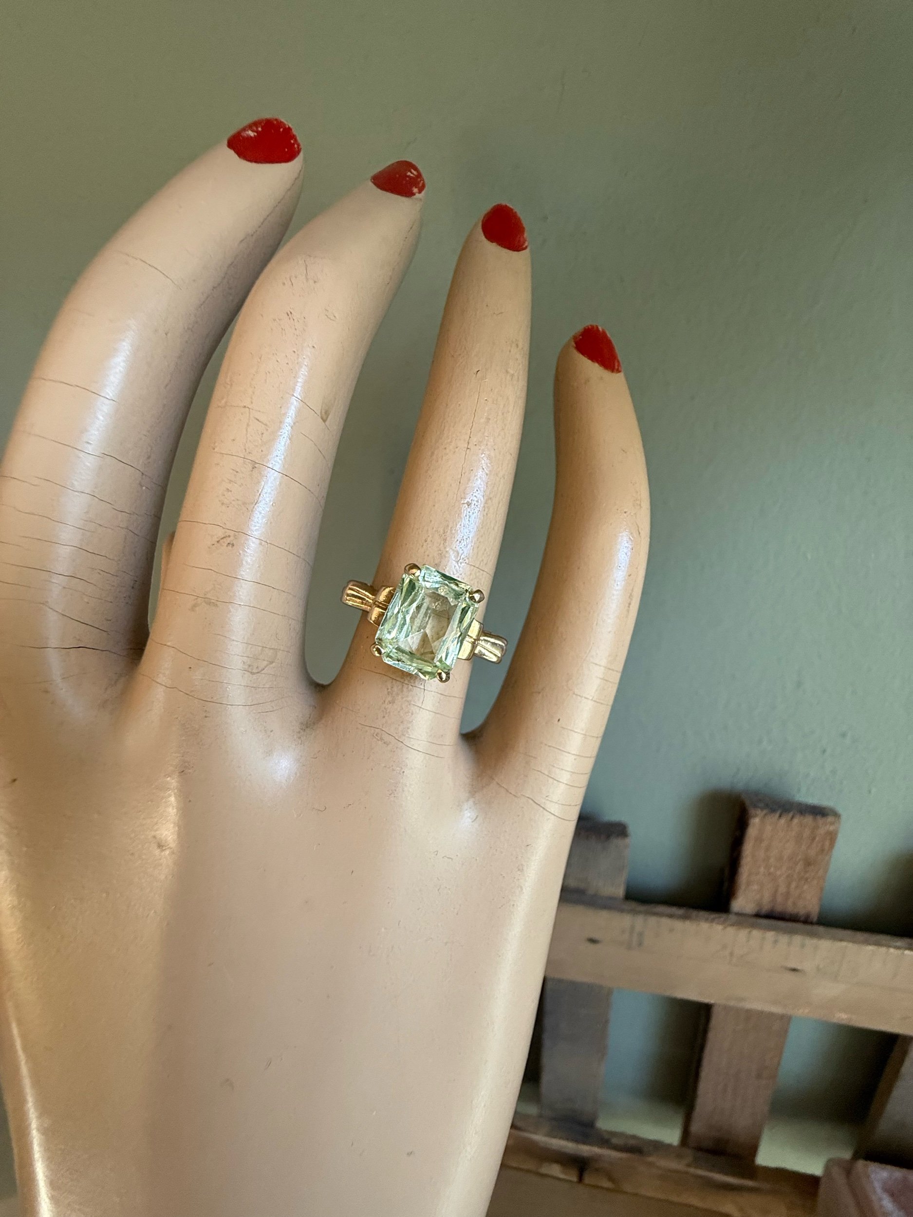 A vintage 14K yellow gold ring (stamped and verified) set with a rectangle cut green spinel measuring approx. 10 x 8 mm, approx. 3.5 cts. The color is a light limey green (pictures taken on a cloudy day next to a window/untouched). The setting is very retro with a bow motif. A very solid piece. 2.9 grams