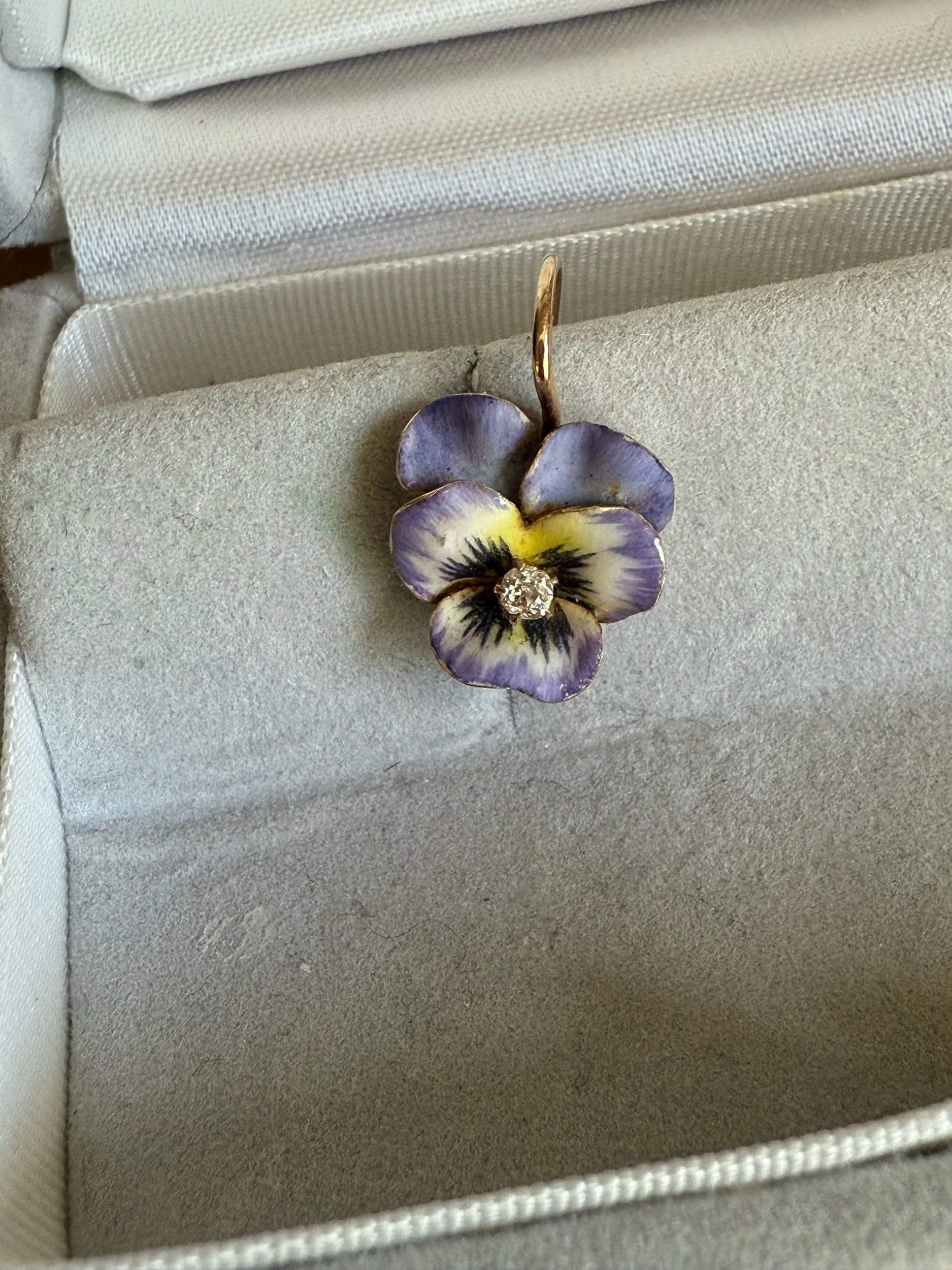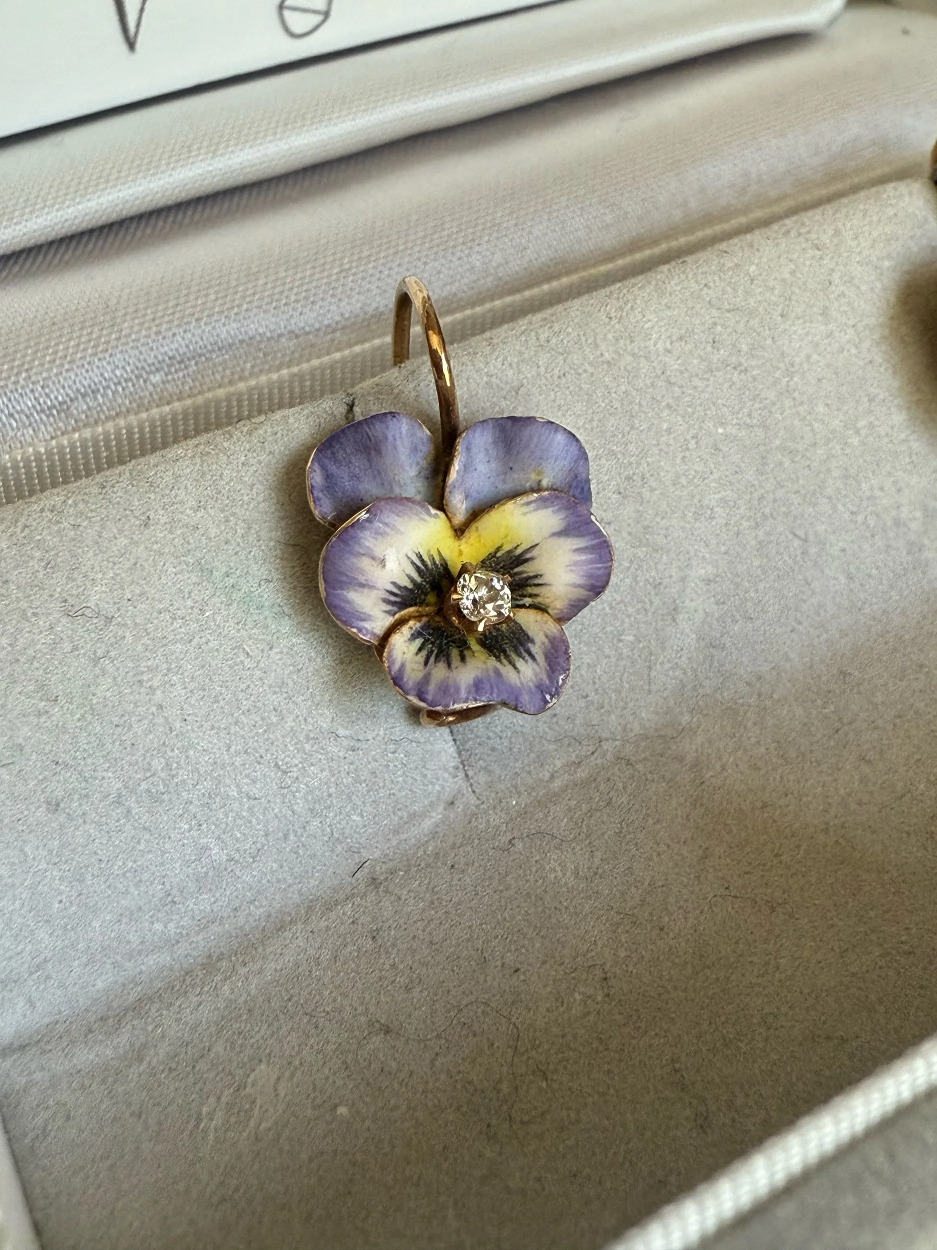 14K yellow gold antique earrings created during the Edwardian era. Gorgeous hand painted enamel pansies in very good condition -just the tiniest slightest wear to edges upon magnification with a loupe. The delicate brush strokes make these earrings look like real flowers. In the center are two prong set old mine cut diamonds measuring approx. 1.90 mm each. Top to bottom (whole earring) is approx. 3/4" x 1/2".