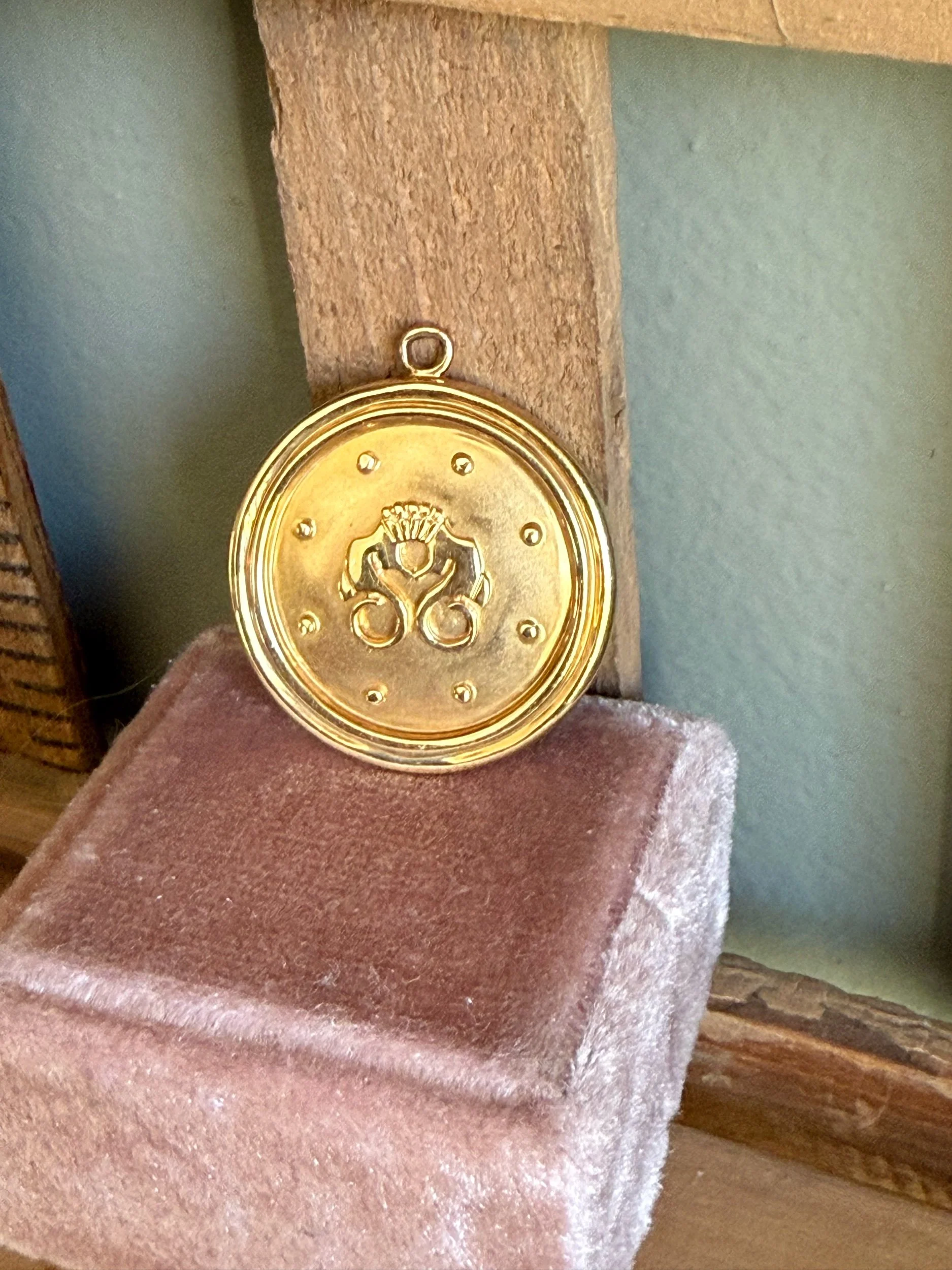 18K yellow gold charm/pendant (no stamp but tested) featuring two facing seahorses. Unusual motif. 1" diameter. 5.1 grams