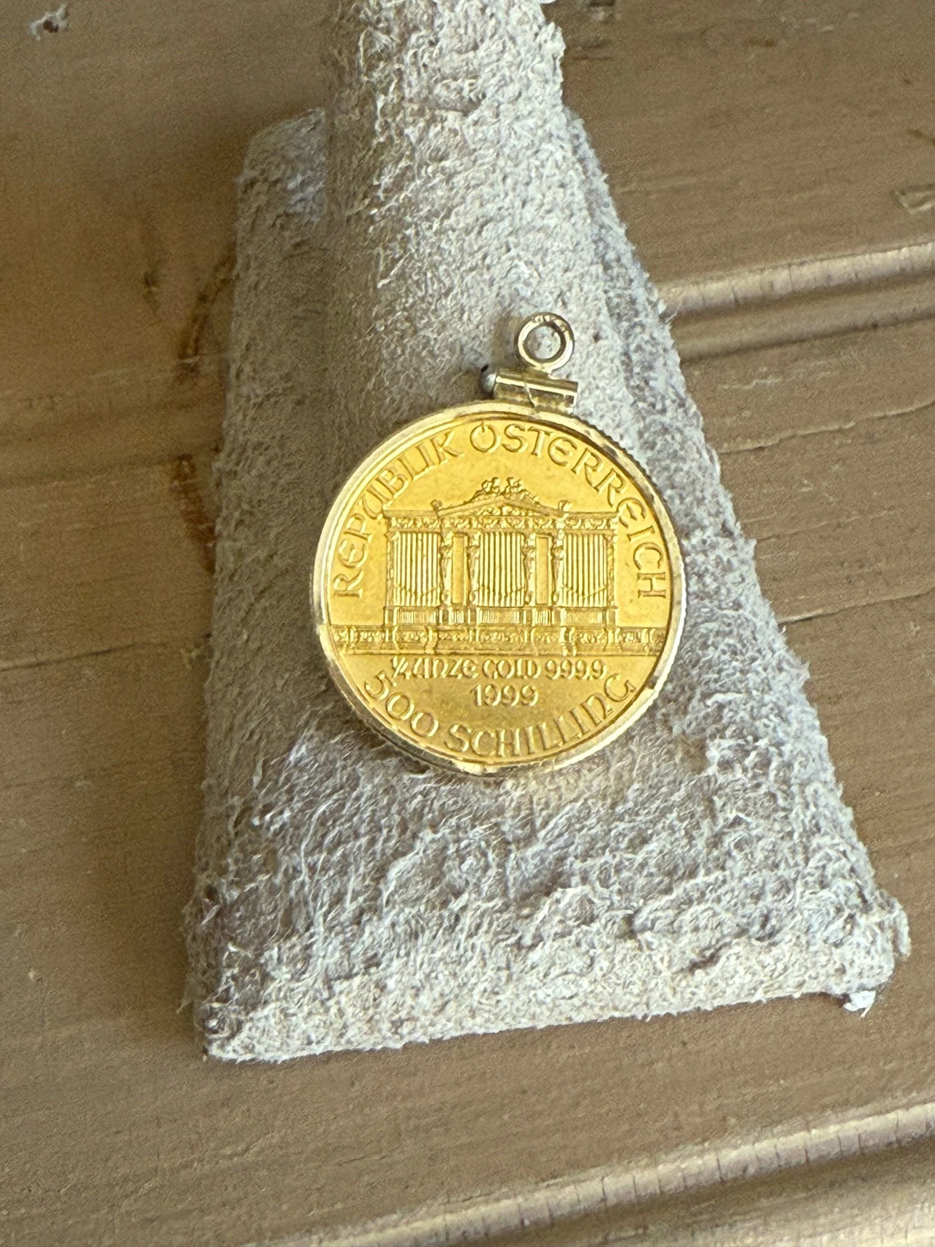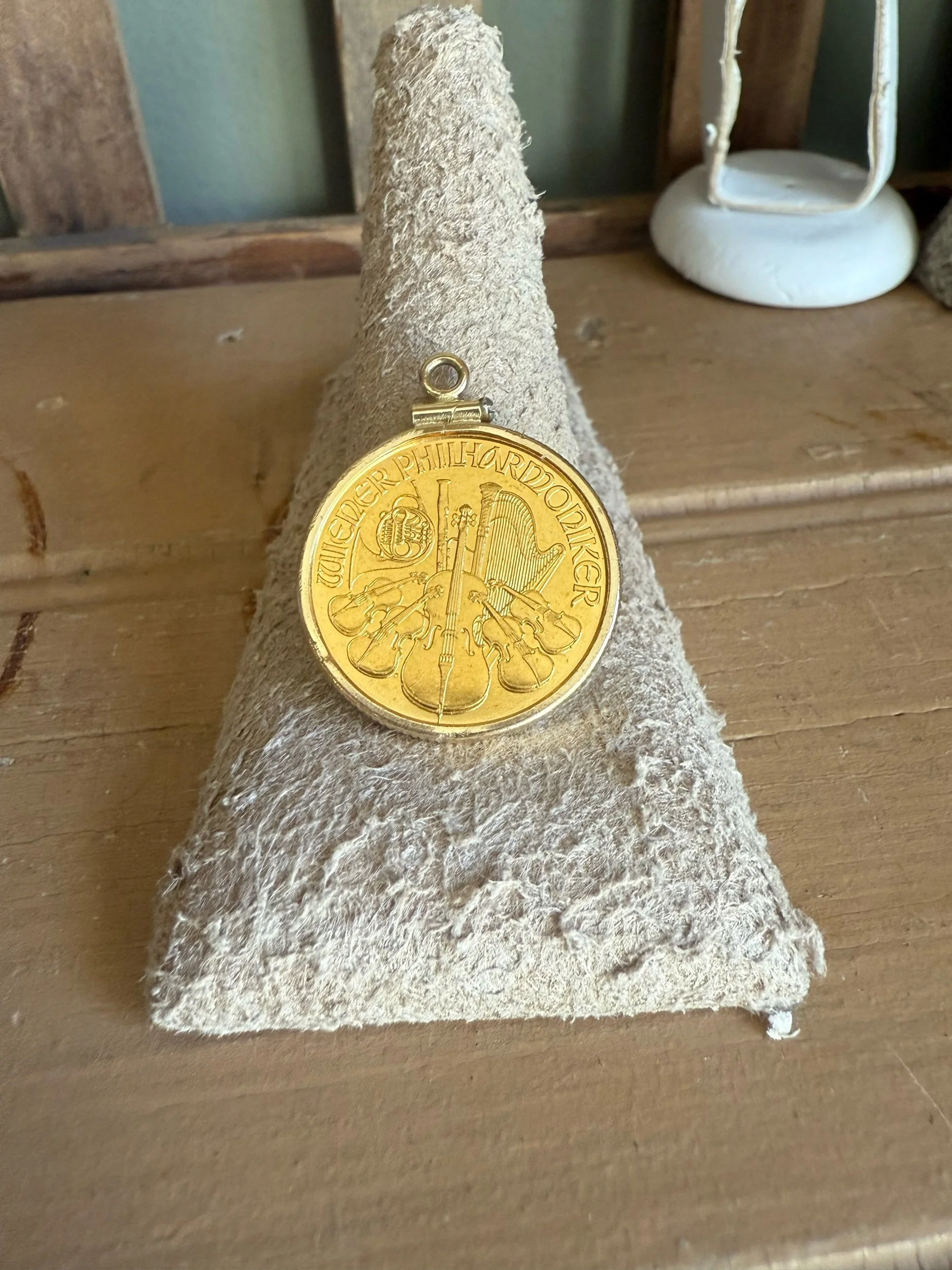 A beautiful Austrian Philharmonic quarter ounce 24 Carat gold coin from 1999 set in a 14K Yellow Gold Pendant. These coins feature instruments used by the Vienna Philharmonic on the reverse and an image of the Vienna Concert Hall on the obverse. The face value on this coin is 500 Schillings.