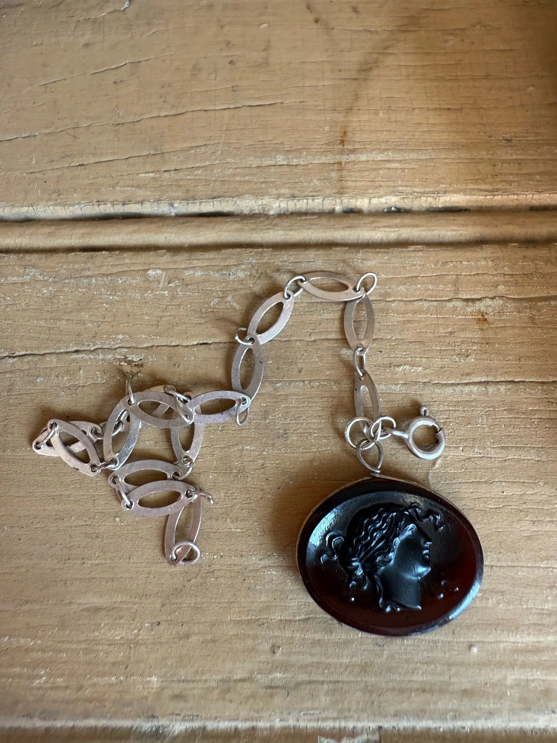 Hangin from a vintage oval link sterling silver bracelet 7 1/8" length. Spring ring clasp.