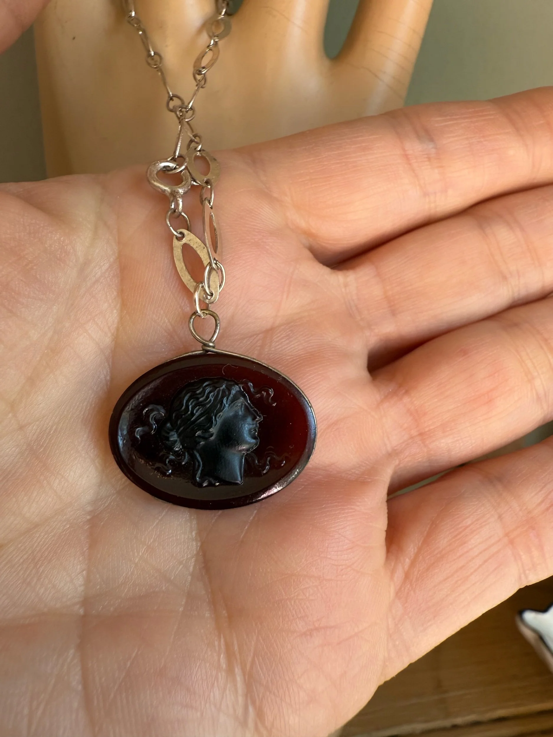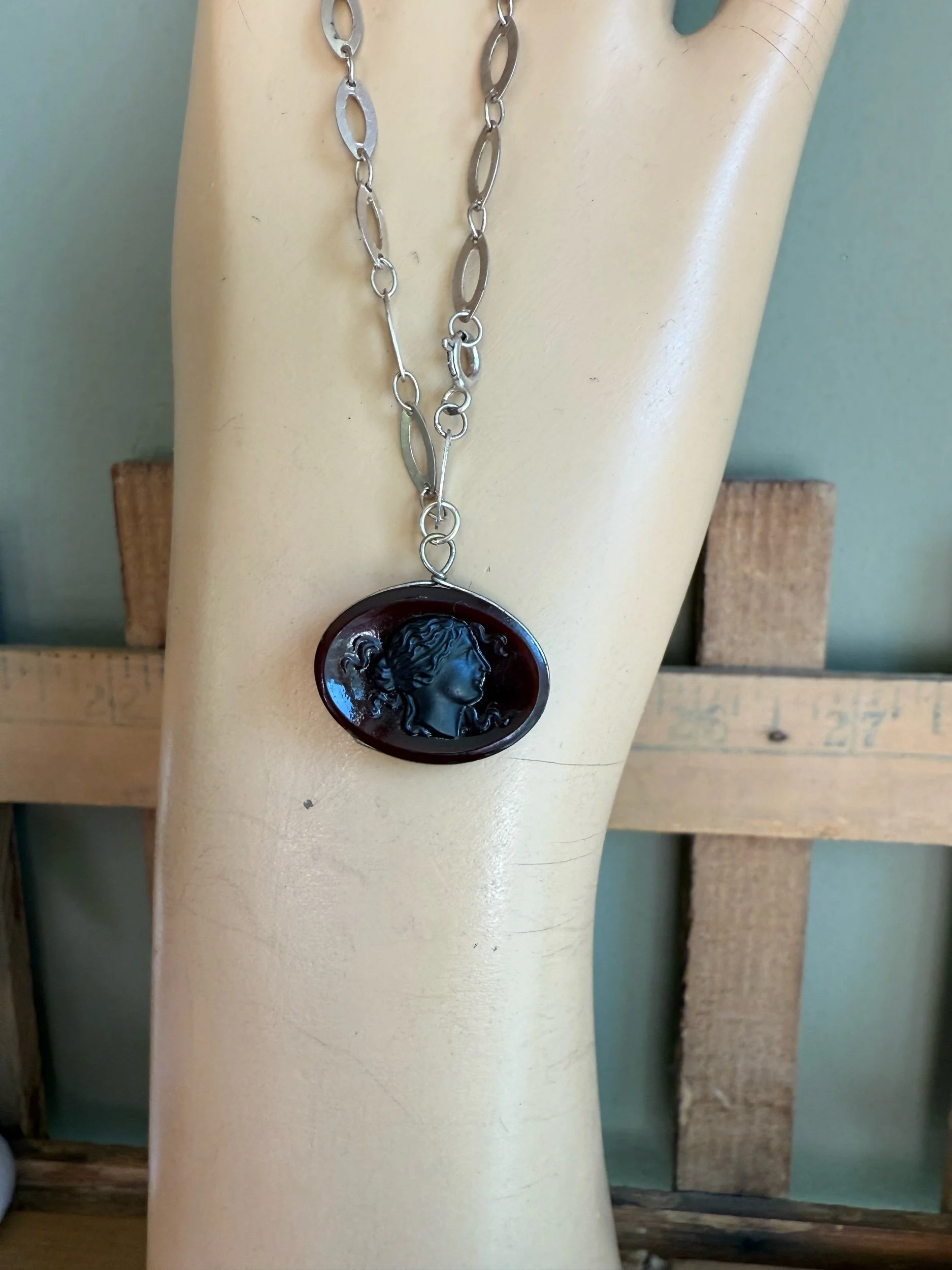 A turn of the 20th century dark brown glass tassie intaglio of a lady in profile with curls of hair framing her face. She is frosted and the frame around her is shiny. 7/8" length x 3/4" width.