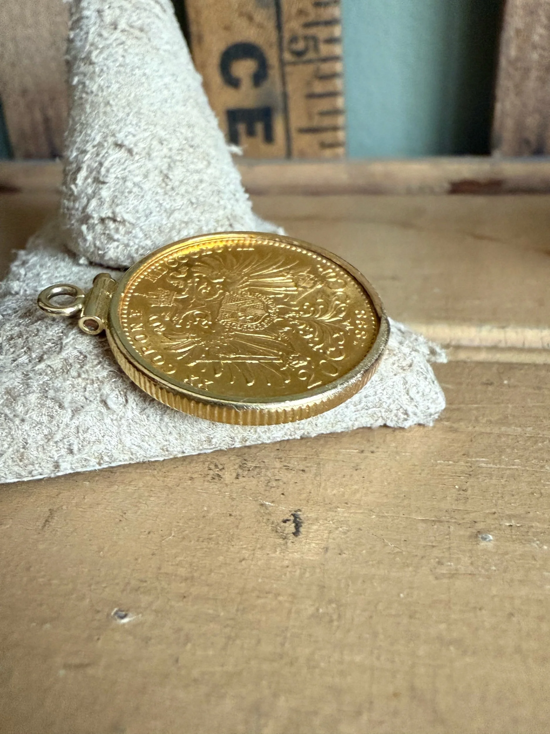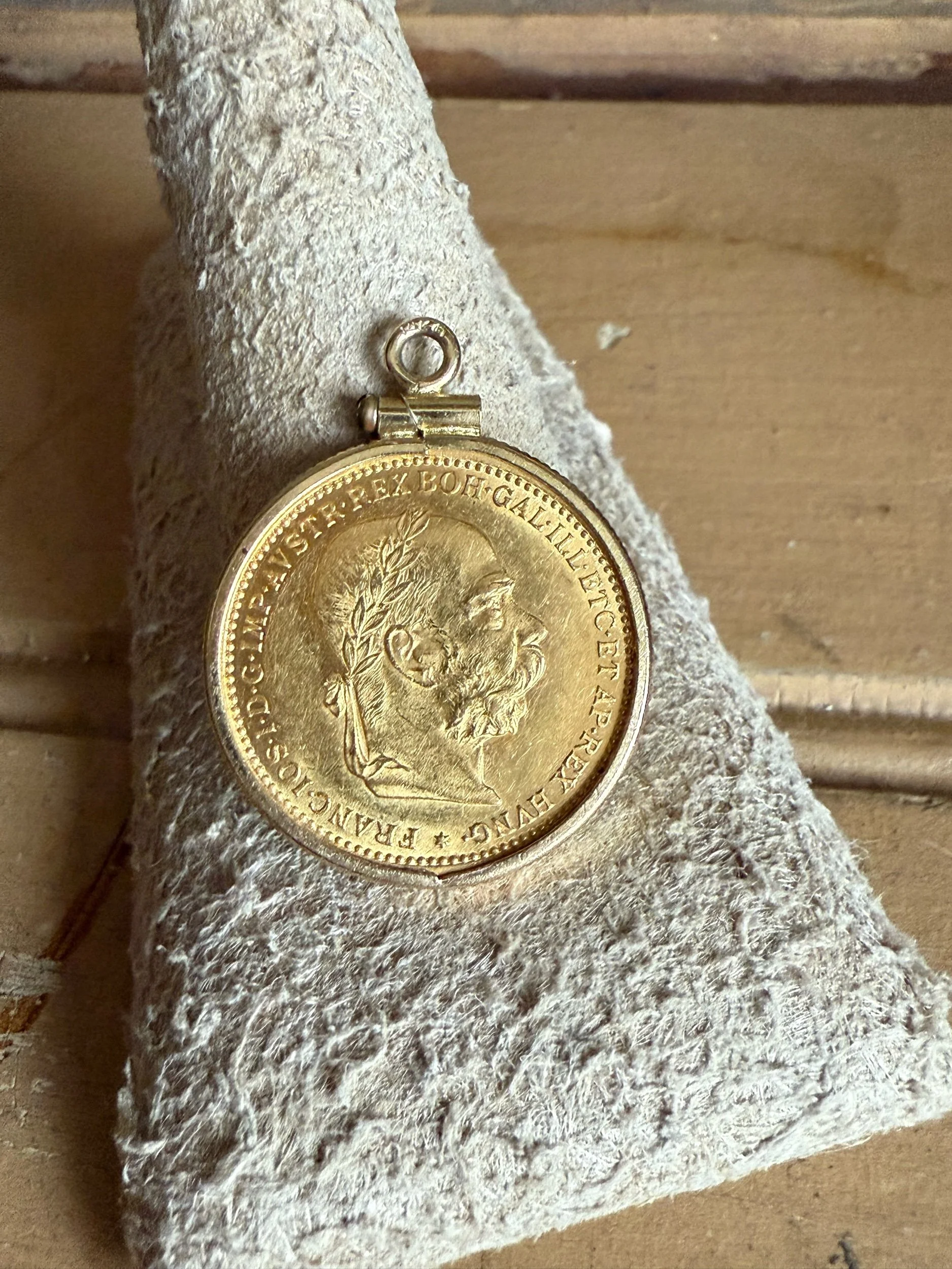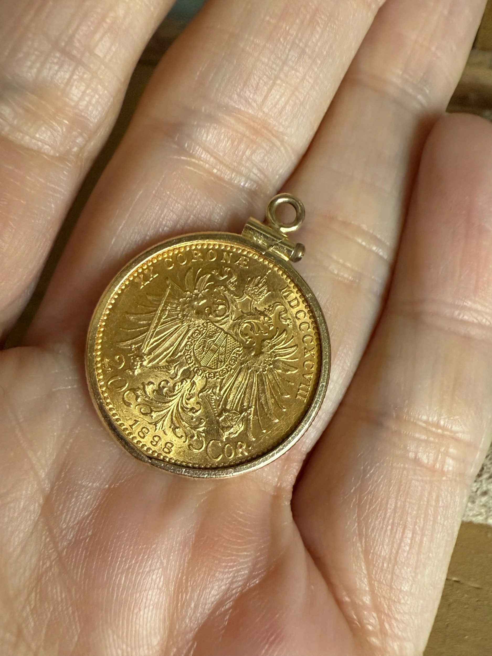 Antique Austro-Hungarian 20 Corona solid gold coin pendant. Crafted in 1898 under the reign of Emperor Franz Joseph I.