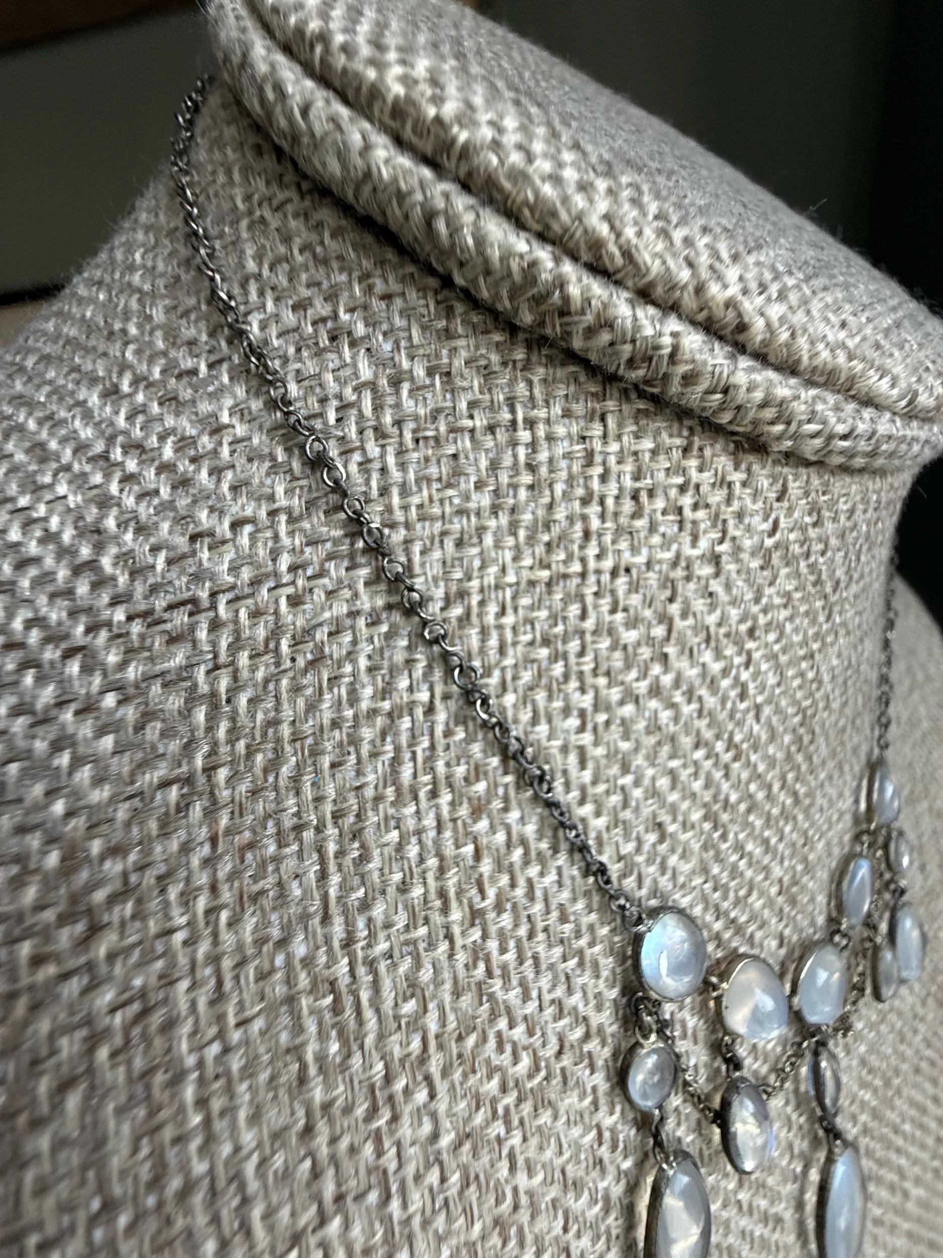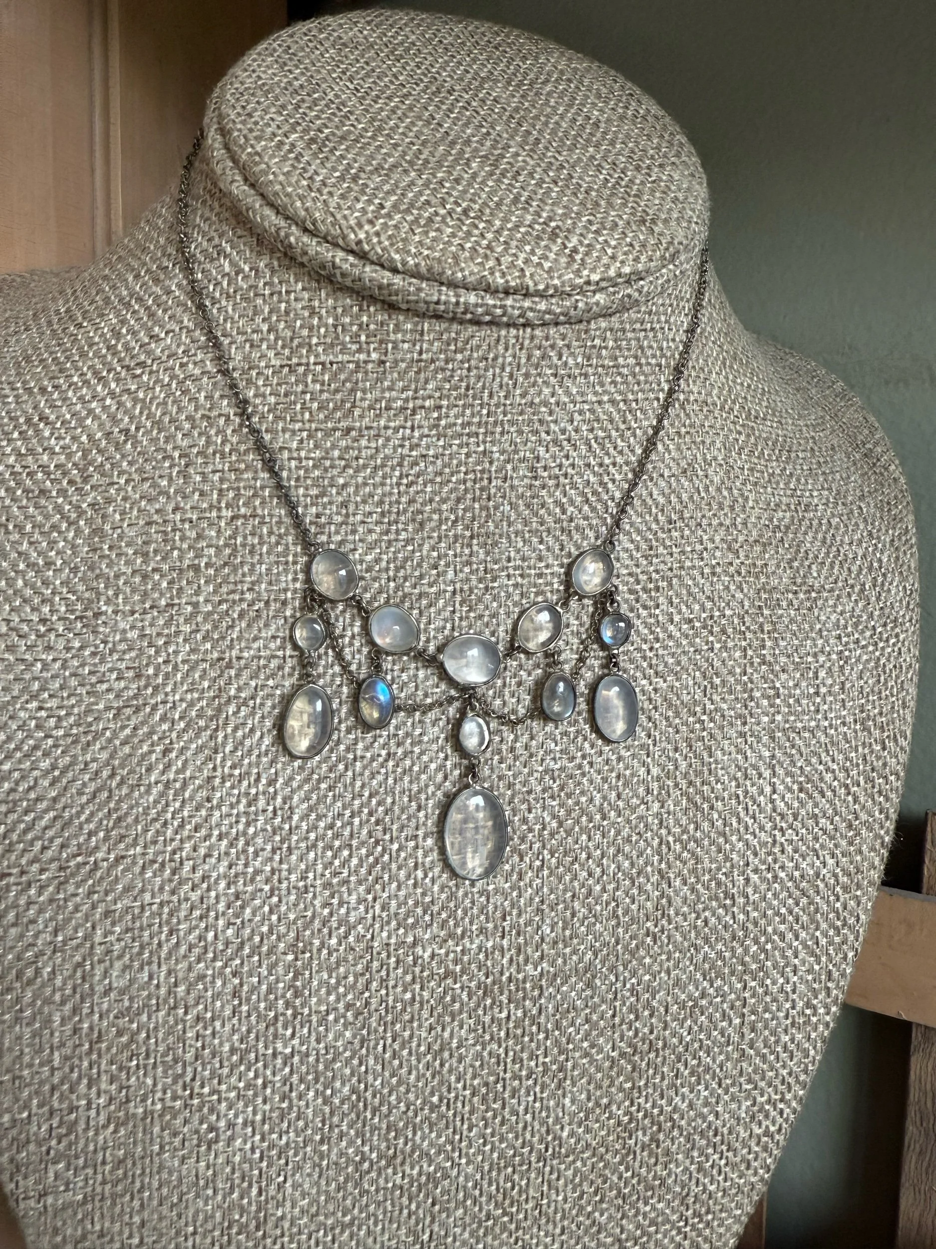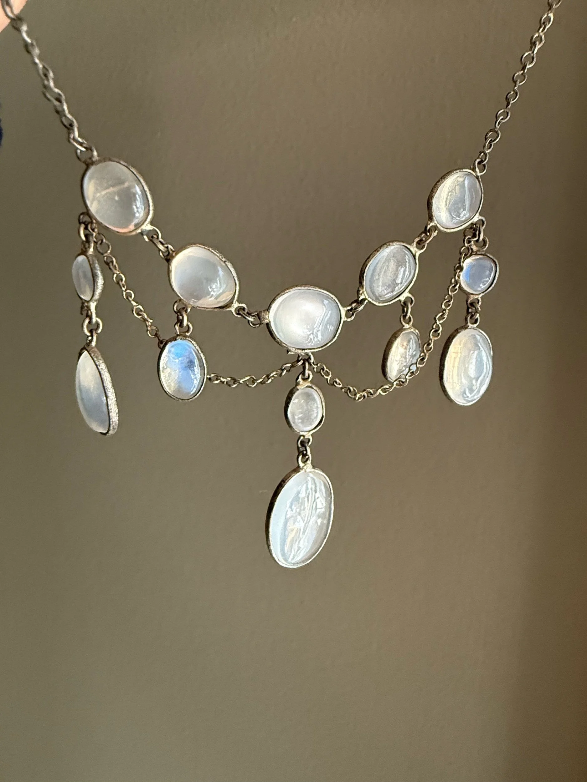 Metal tested as low grade silver. The necklace measures oval shaped moonstone measuring between 5 x 4.2-13.37 x 8.96 mm. All moonstones are securely bezel set. The front measures 2.24 " wide and drops 1 1/2". These are natural moonstones some with inclusions. Love how each one is unique. The chain is handmade and there have been old repairs done to it over the years. I didn't try to polish -but kept the patina. It closes with a hook. 14" length-this would have been the true length back in 1915 but you can easily switch out the chain if you need something longer.