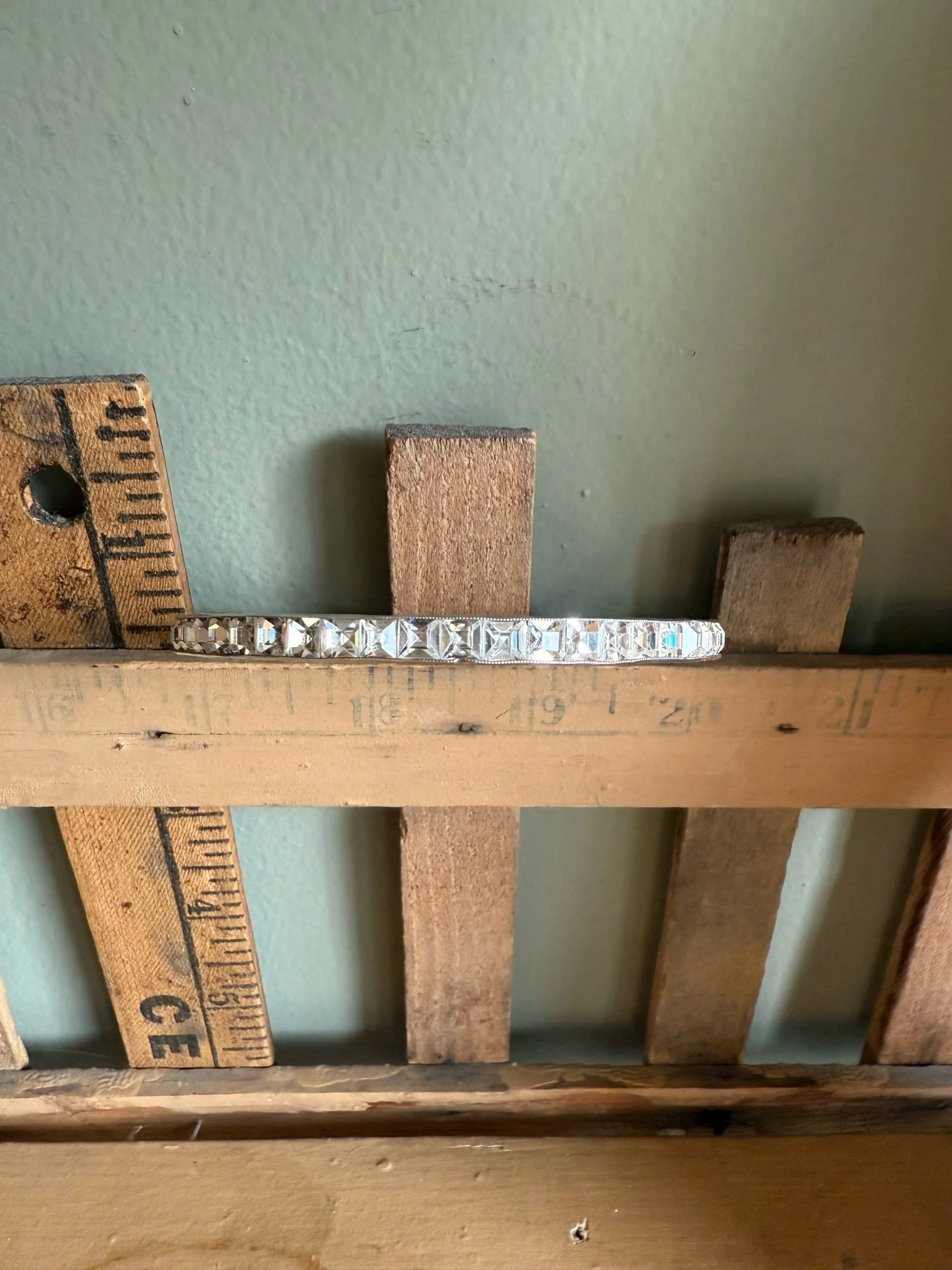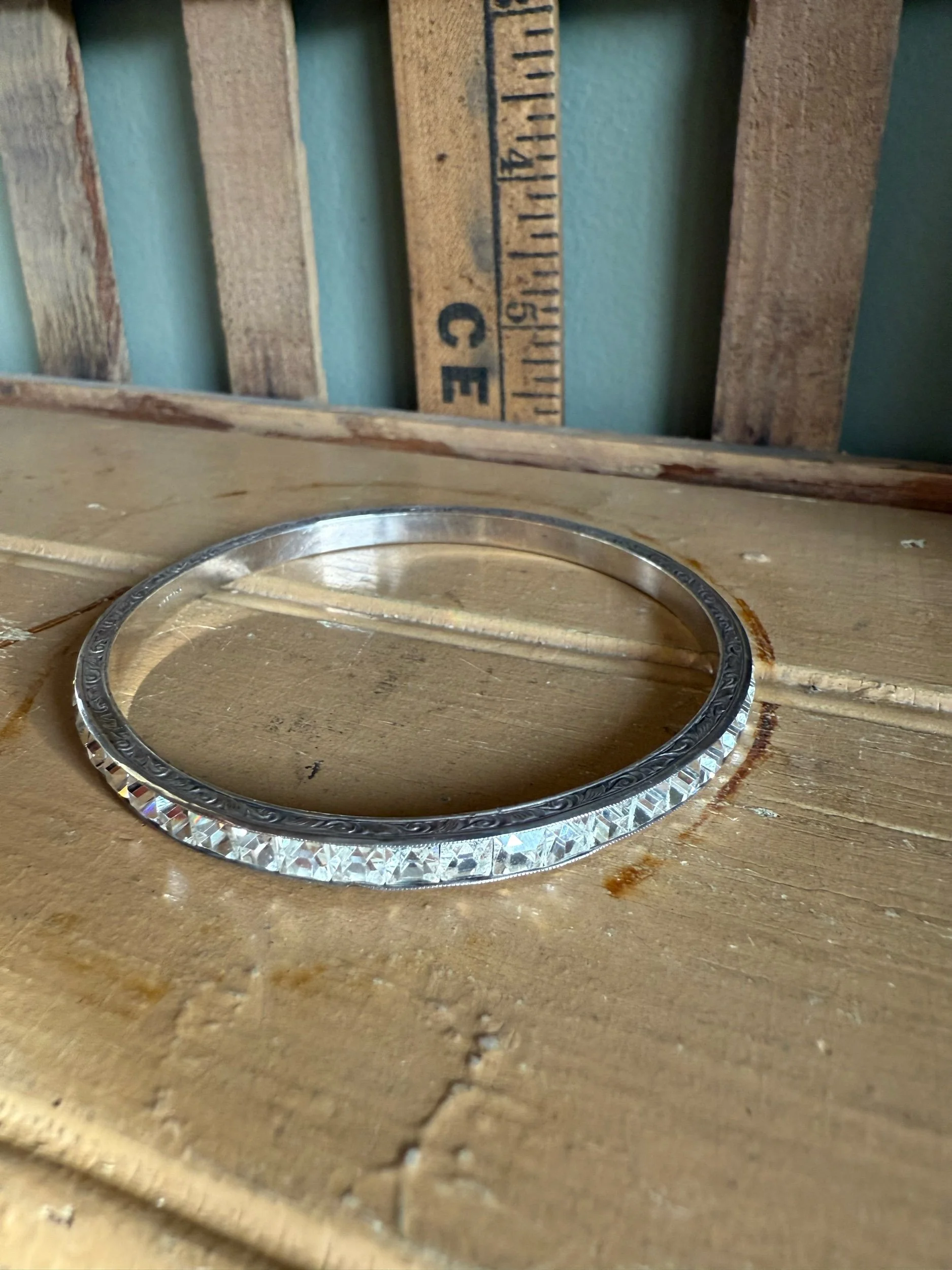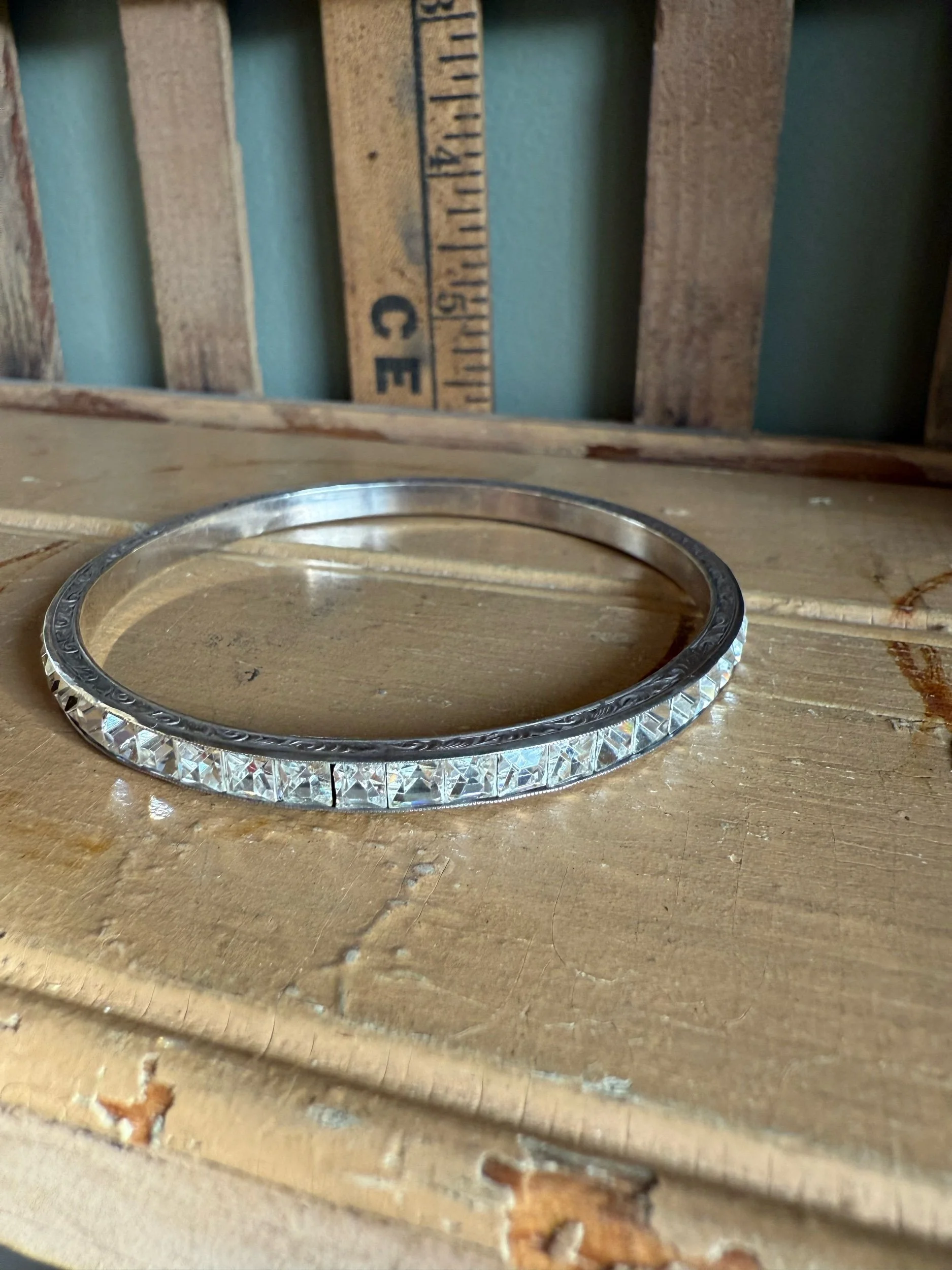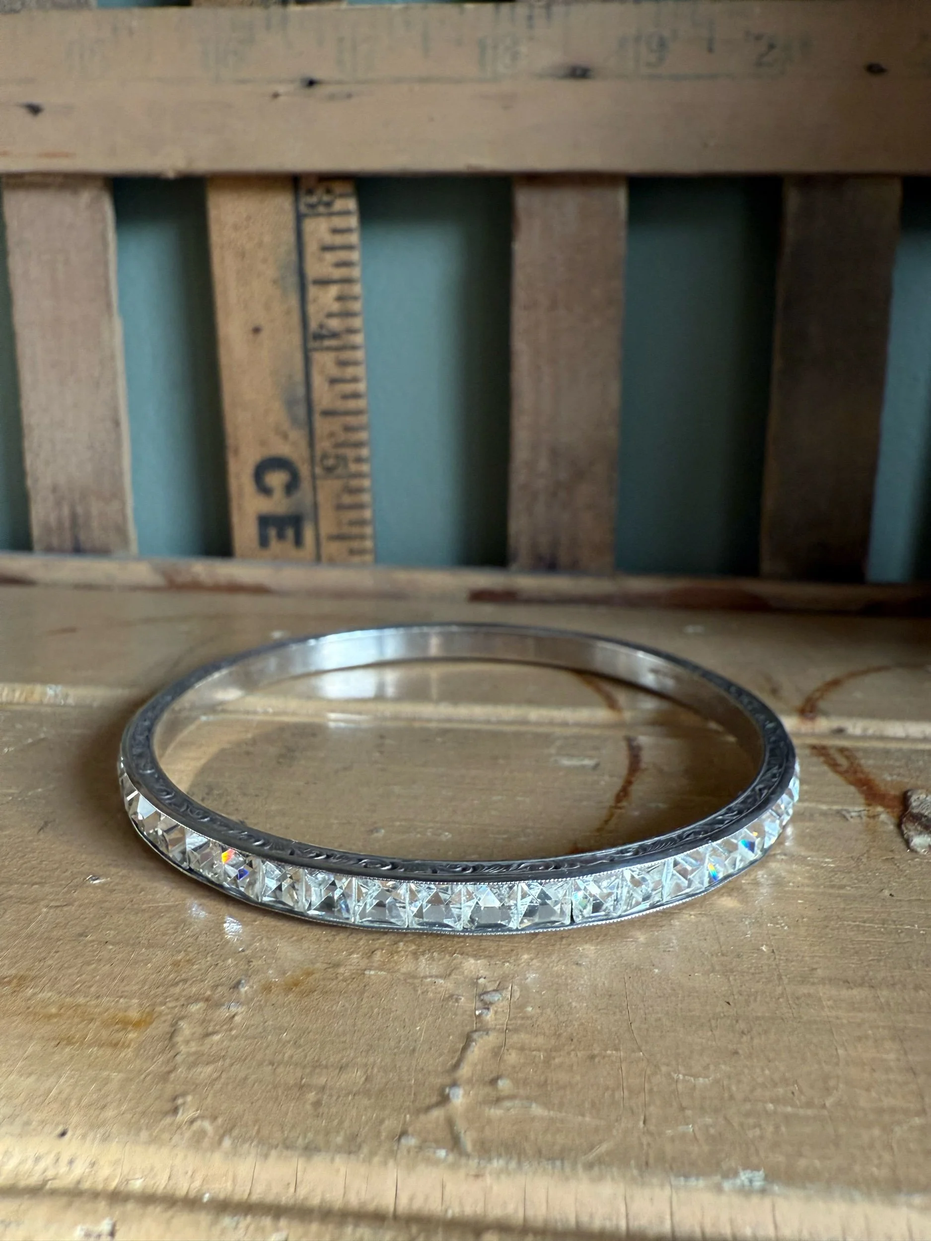 Gorgeous Art Deco (1930-1940) sterling silver bangle set with square cut crystals channel set with engraved sides. Solid back, stamped sterling. Condition is very good for a true Art Deco piece just the slightest wear on the crystals seen only by loupe.