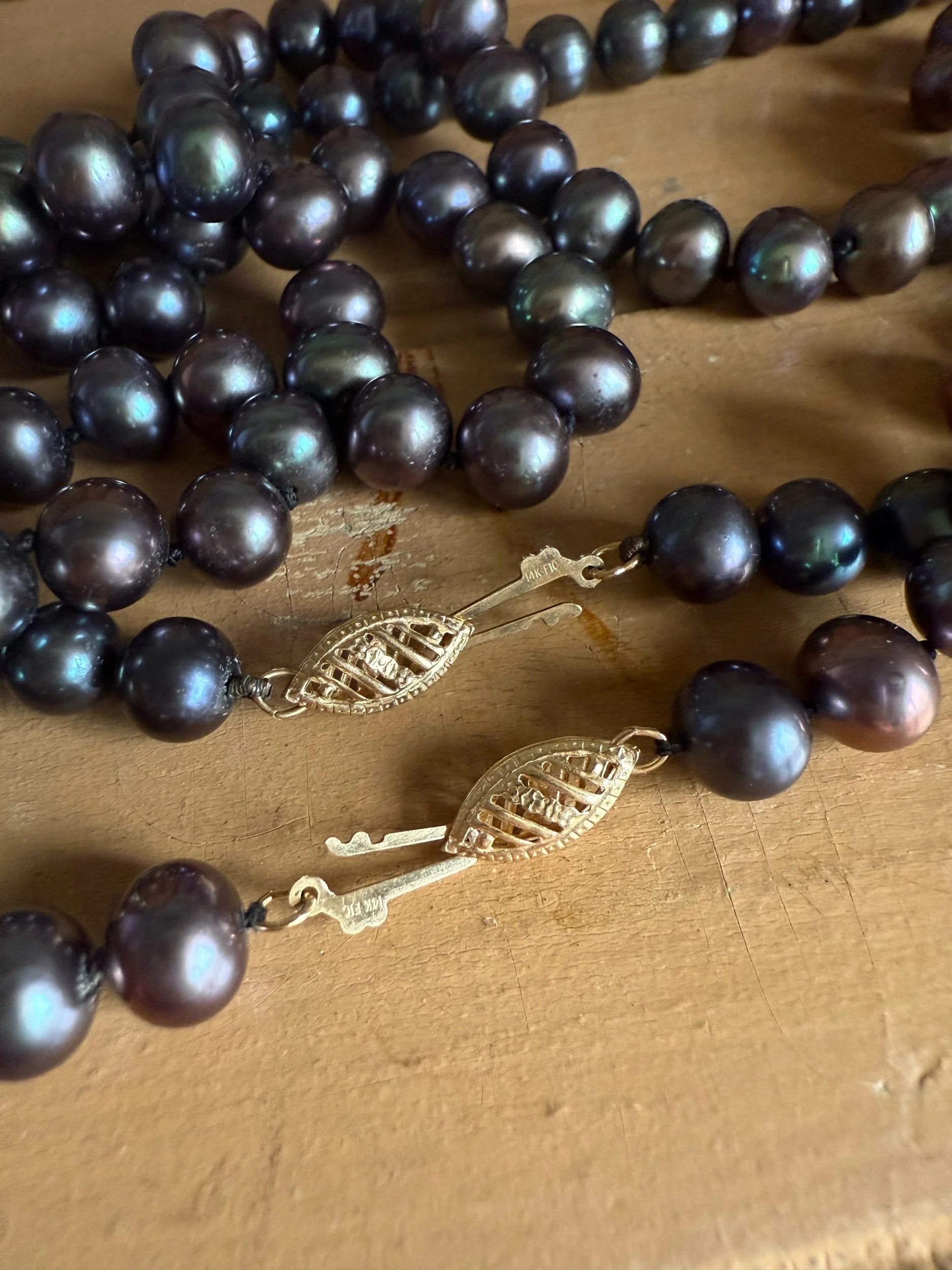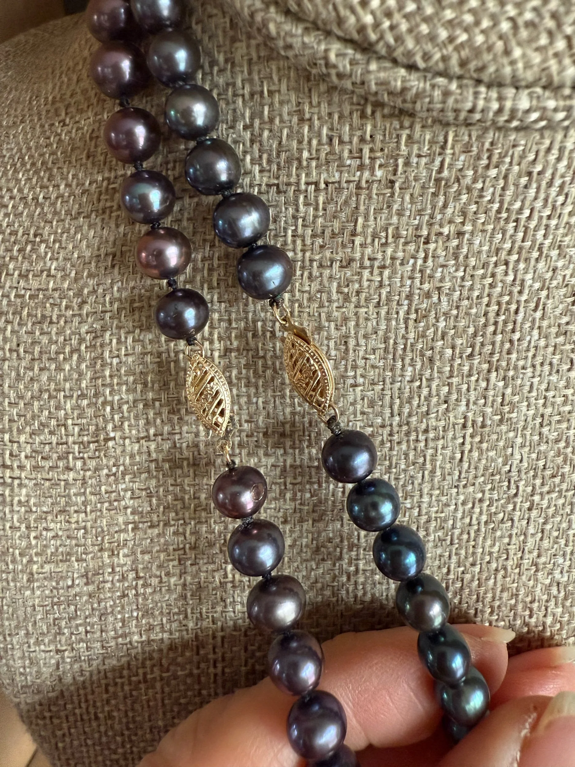 Vintage-Two strands of hand knotted freshwater peacock rainbow pearls. They came together and look very nice stacked but you can just buy one if you want. Both have 14K clasp. The first one is 18" length, approx. 6.9 mm diameter pearls. The second is 24" length, 7.93 mm diameter pearls. The colors are gorgeous and my photos are not catching the iridescence. Pictures are taken by a window on a cloudy day-untouched.