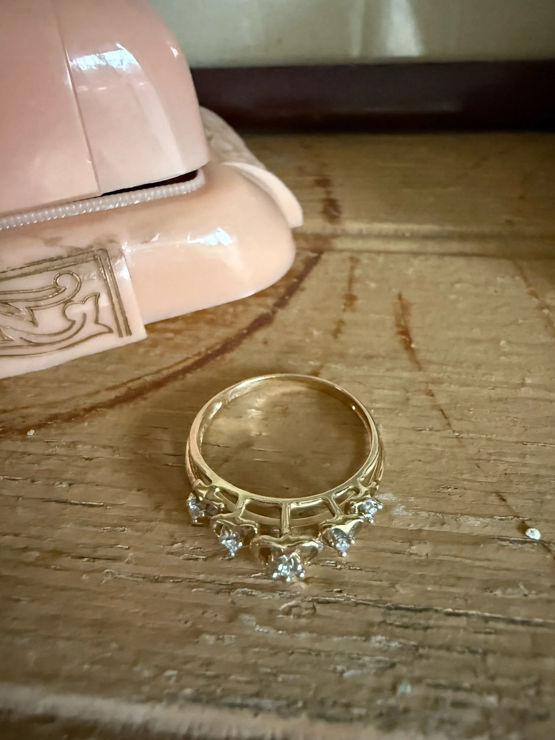 14K yellow gold band featuring open work graduated hearts set with five round cut diamonds. 5 mm wide and sits up off the finger at the front 5.95 mm.