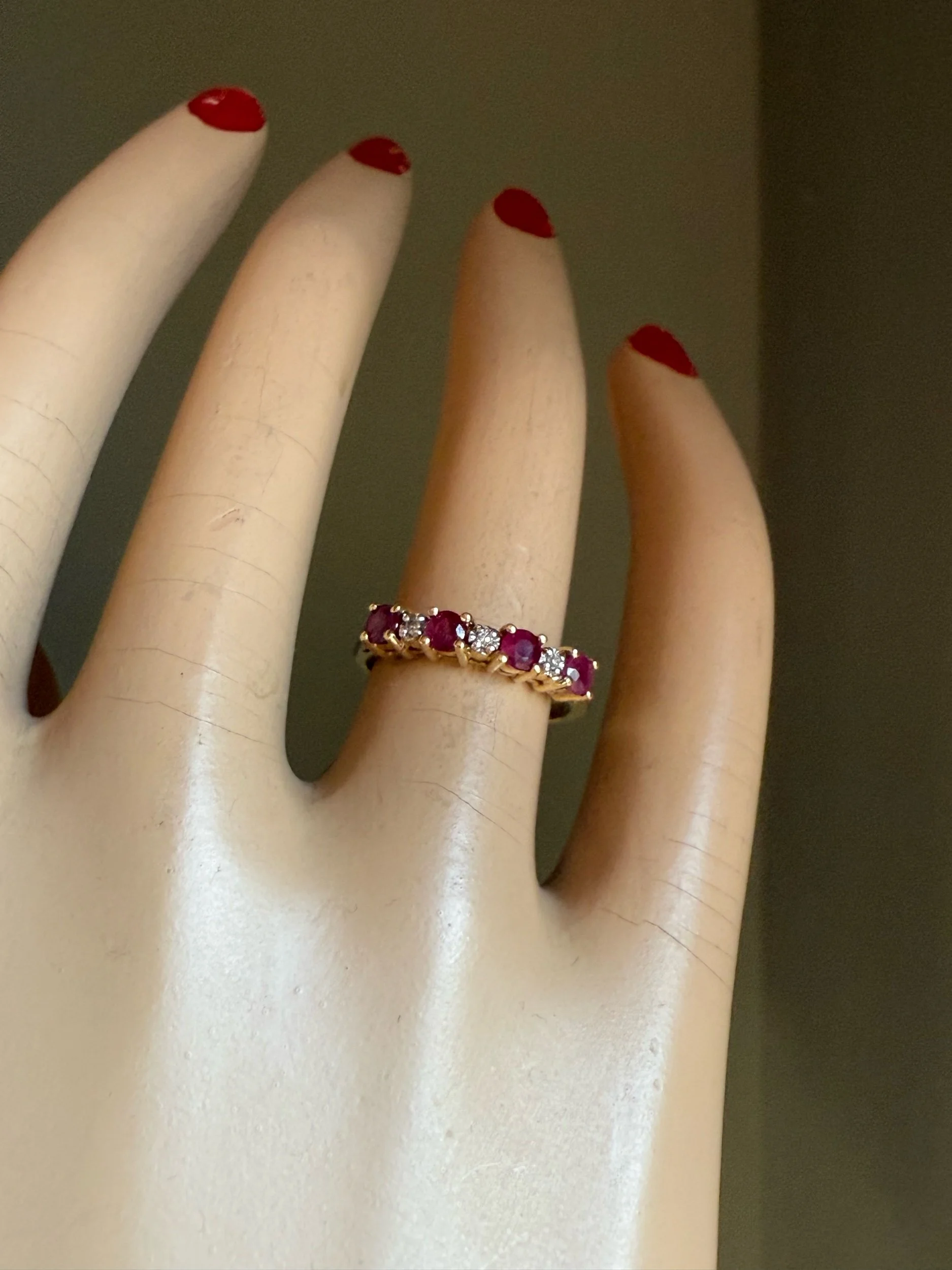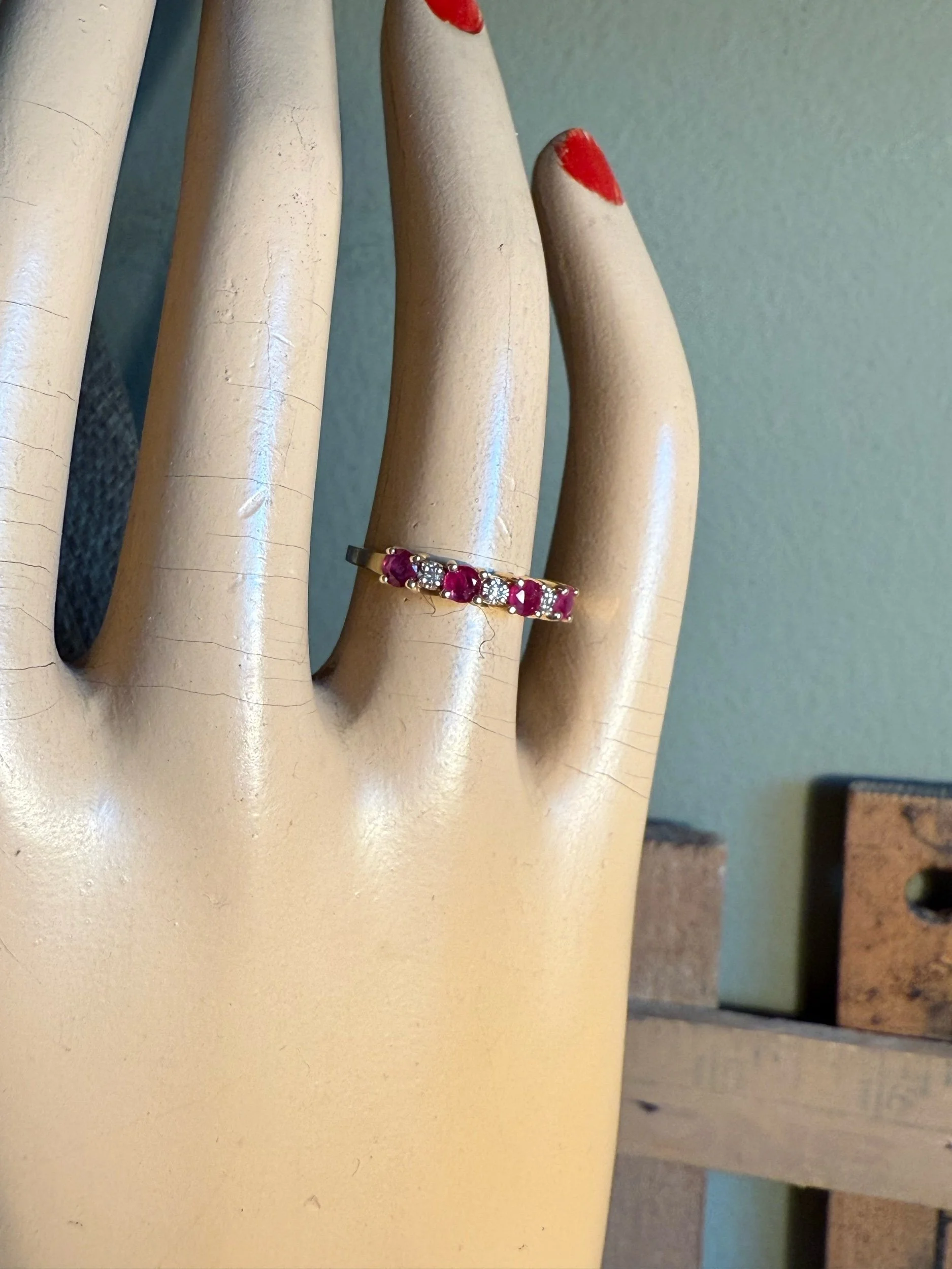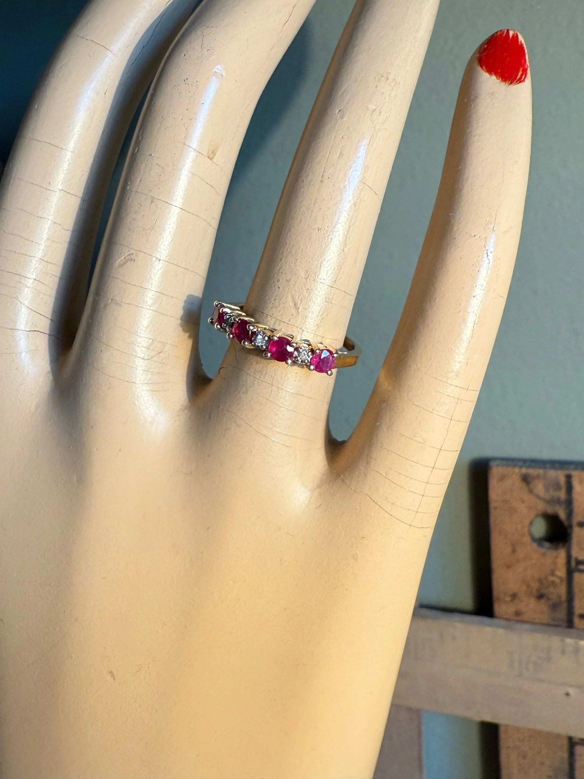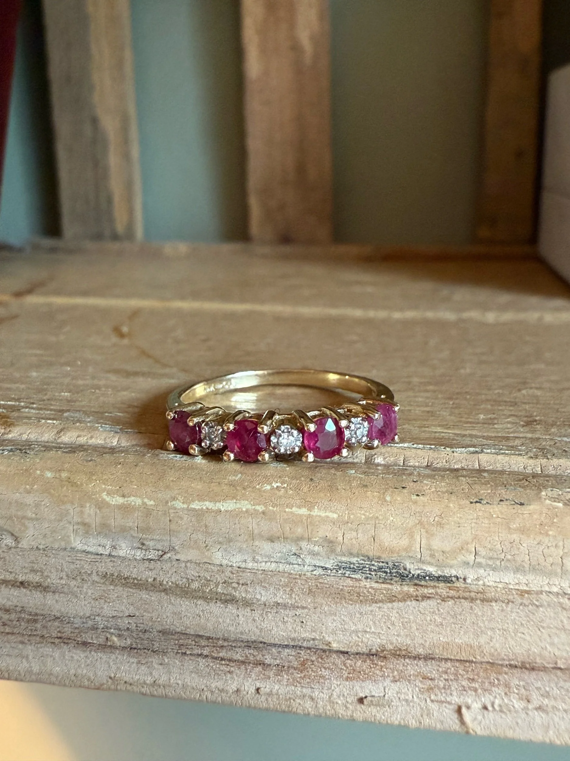 14K yellow gold ring featuring round natural cut rubies, slightly pinkish red, set with four prongs each, approx. .5 ctw, with three small round cut diamonds set in white gold inbetween. The gemstones are in very good preowned condition. Solidly made ring, 3.37 mm wide and sits up off the finger 4.19 mm.