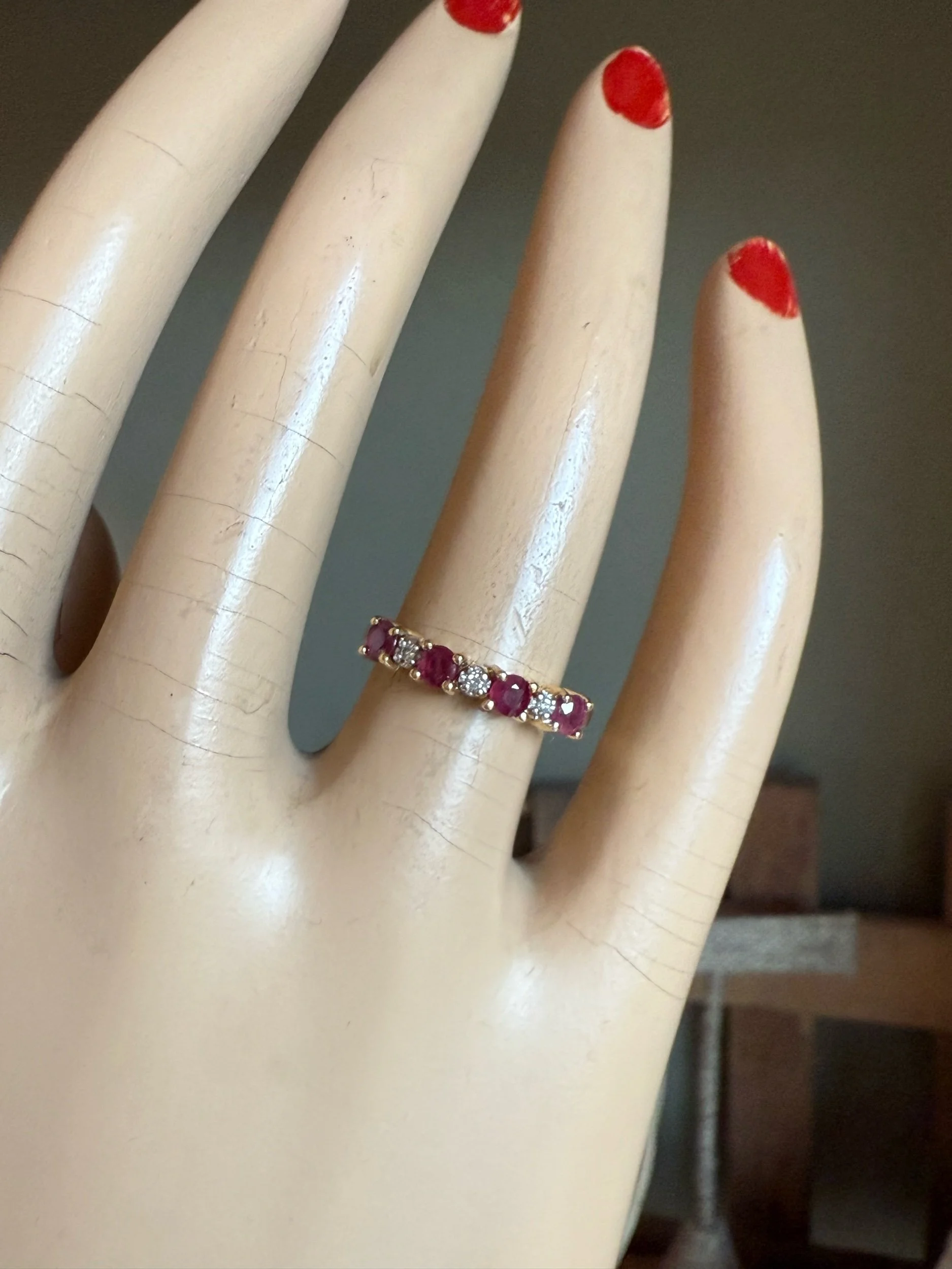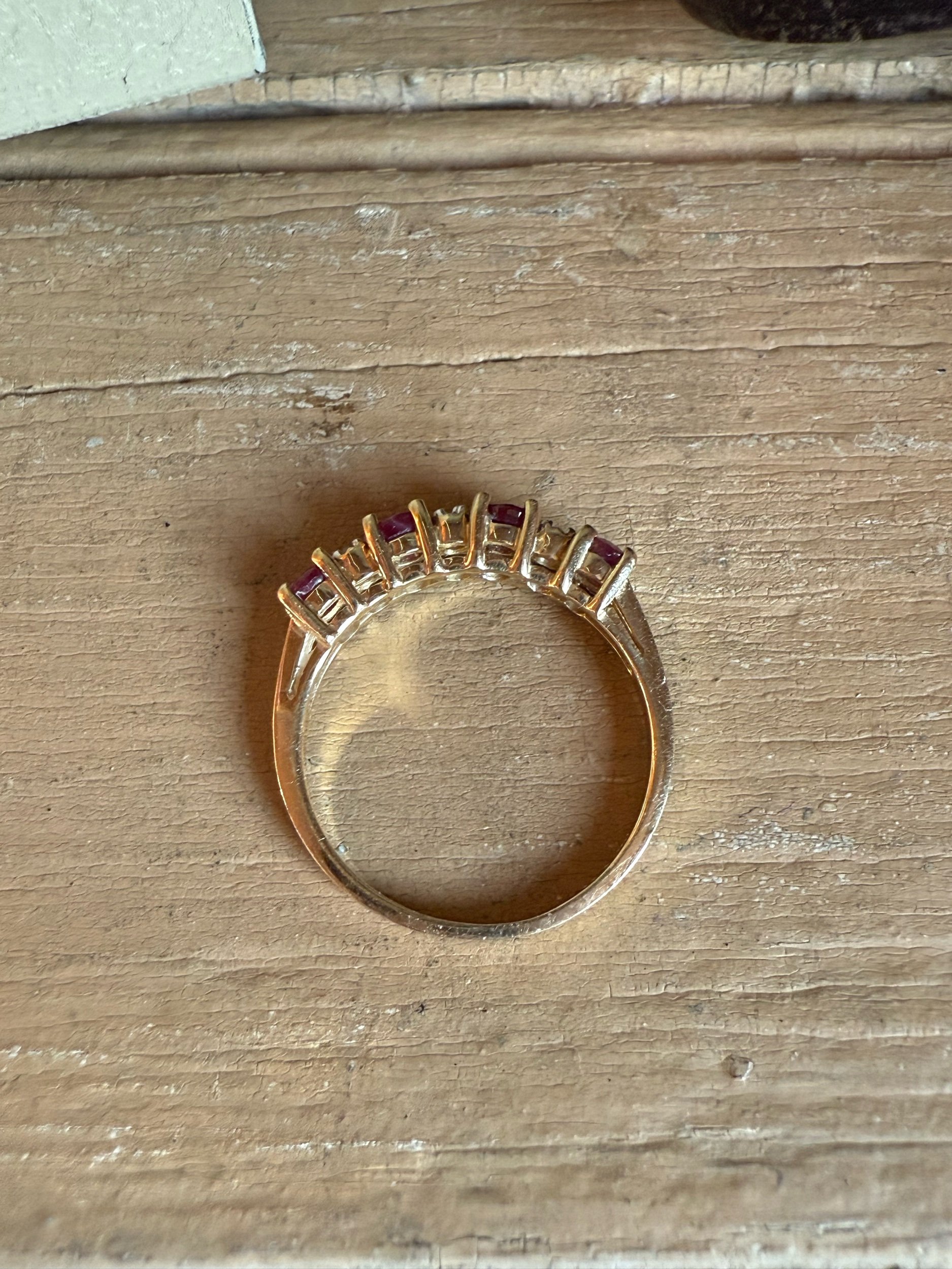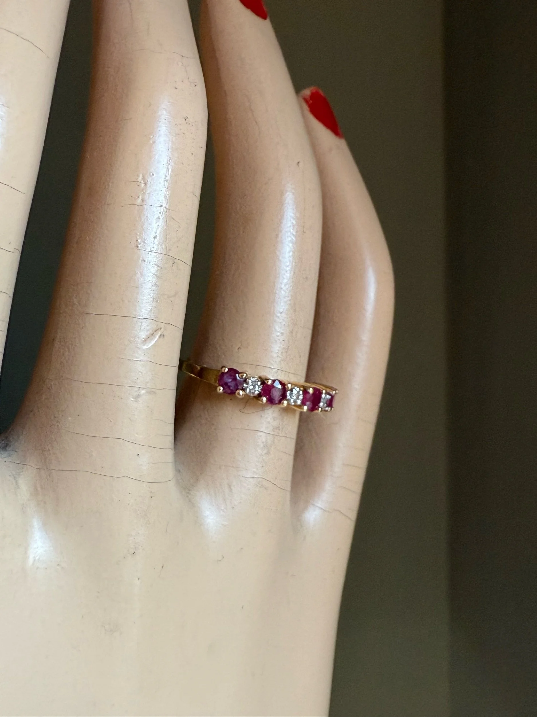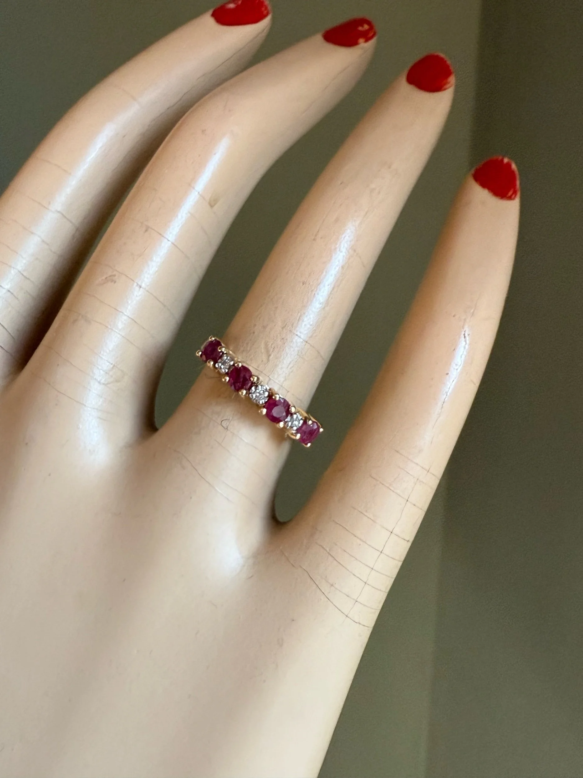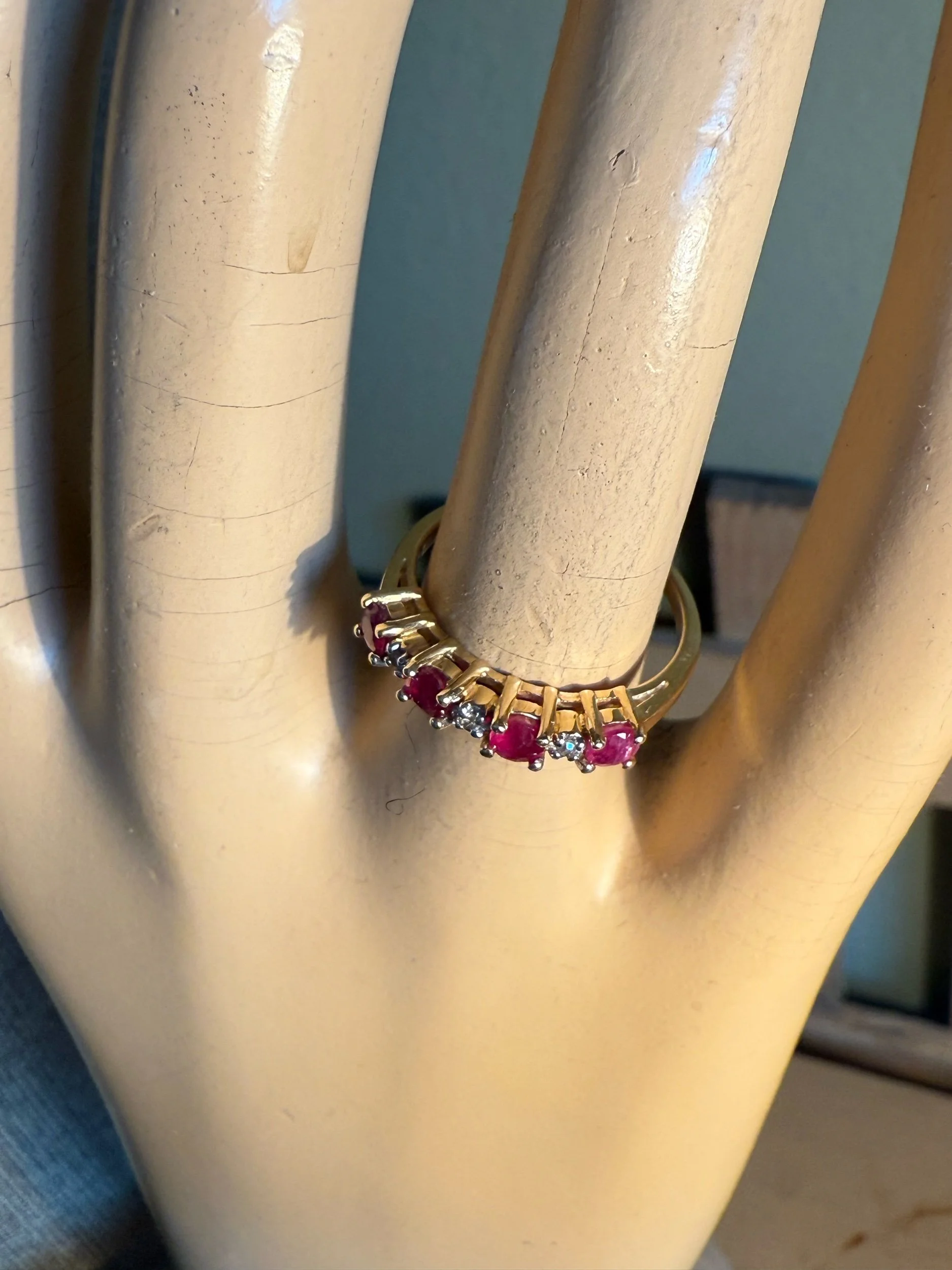 14K yellow gold ring featuring round natural cut rubies, slightly pinkish red, set with four prongs each, approx. .5 ctw, with three small round cut diamonds set in white gold inbetween. The gemstones are in very good preowned condition. Solidly made ring, 3.37 mm wide and sits up off the finger 4.19 mm.