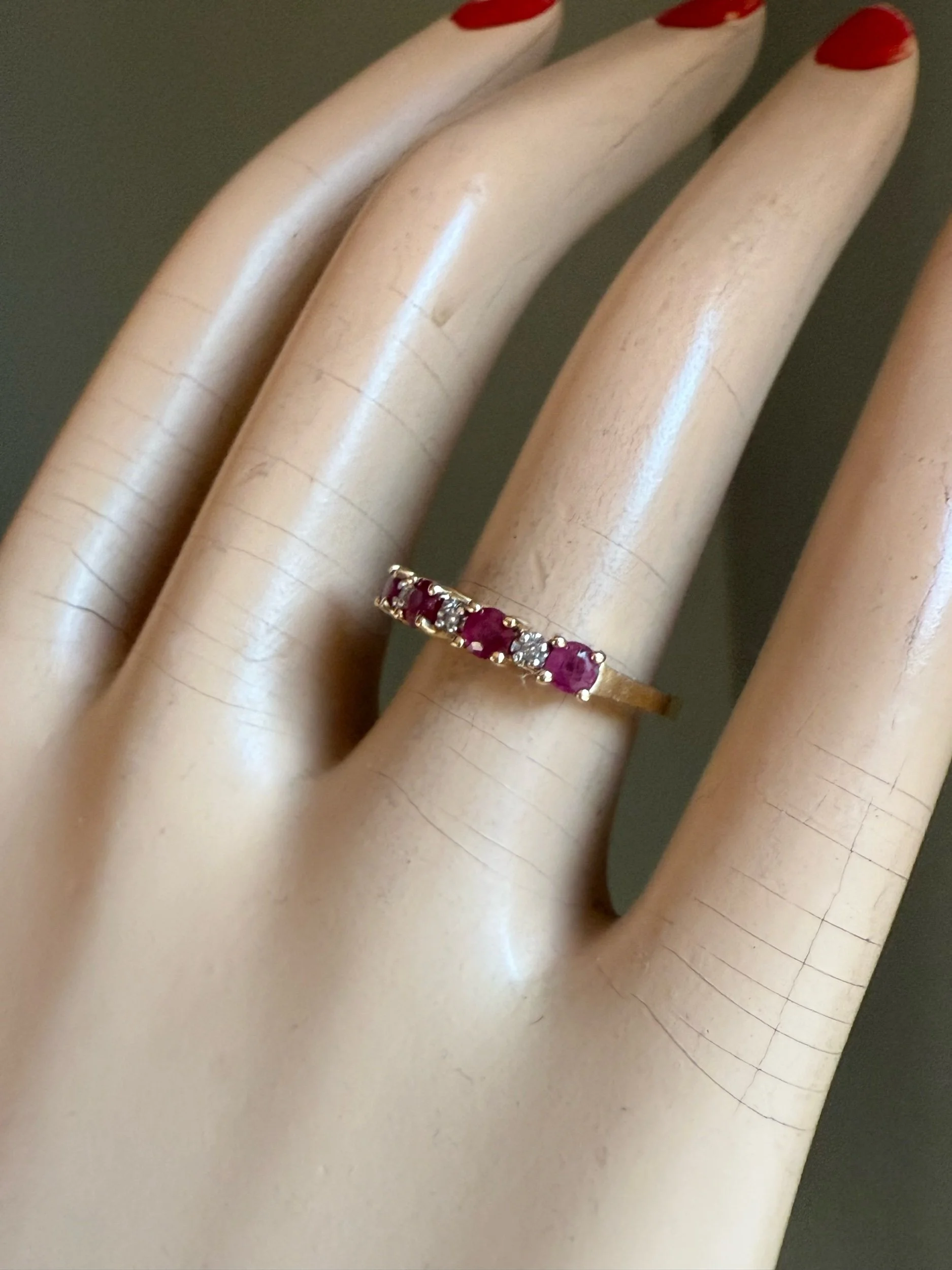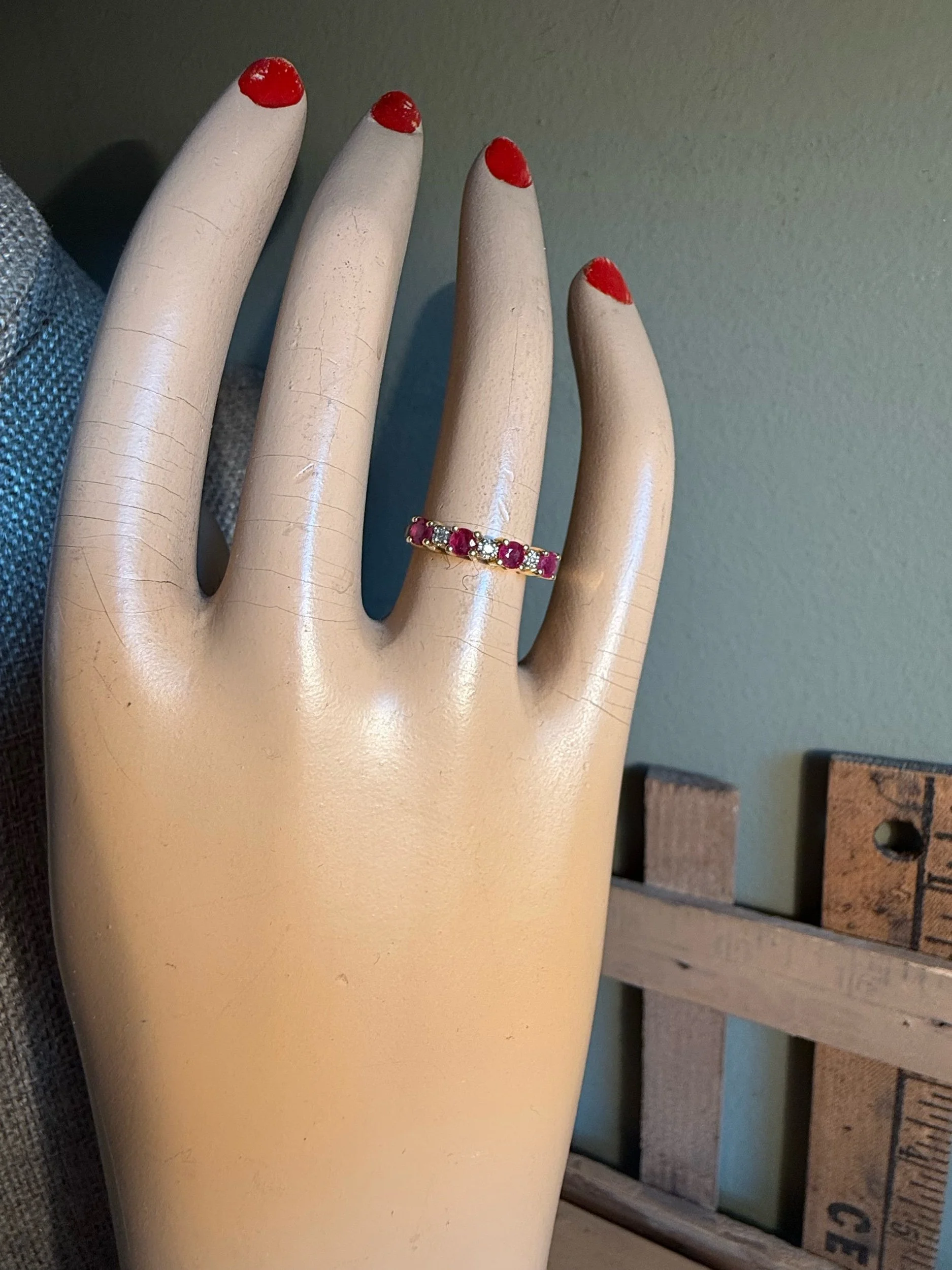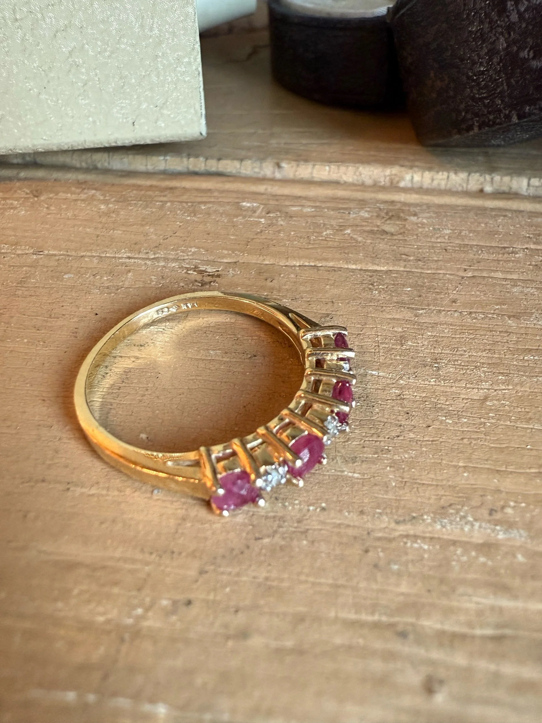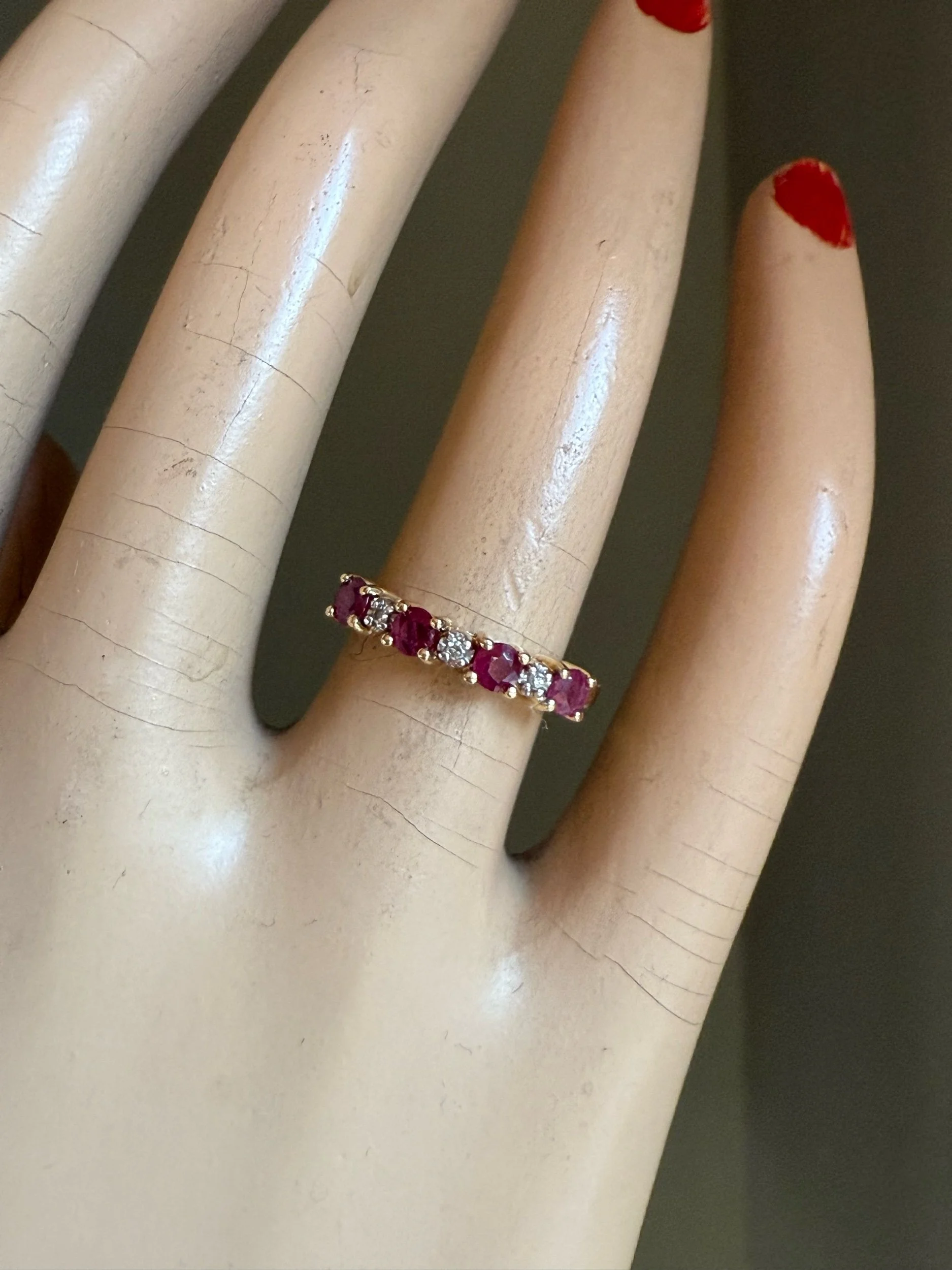 14K yellow gold ring featuring round natural cut rubies, slightly pinkish red, set with four prongs each, approx. .5 ctw, with three small round cut diamonds set in white gold inbetween. The gemstones are in very good preowned condition. Solidly made ring, 3.37 mm wide and sits up off the finger 4.19 mm.