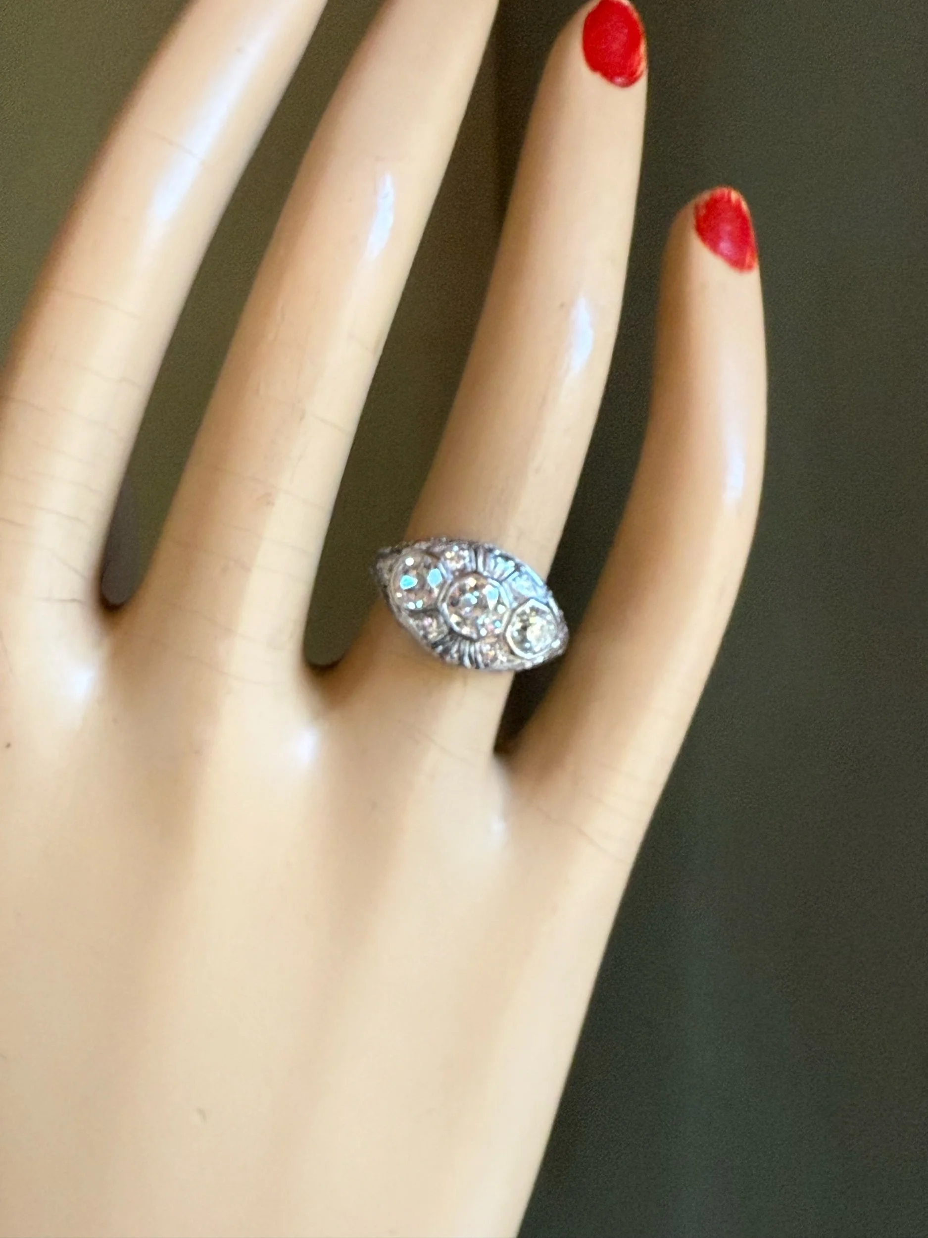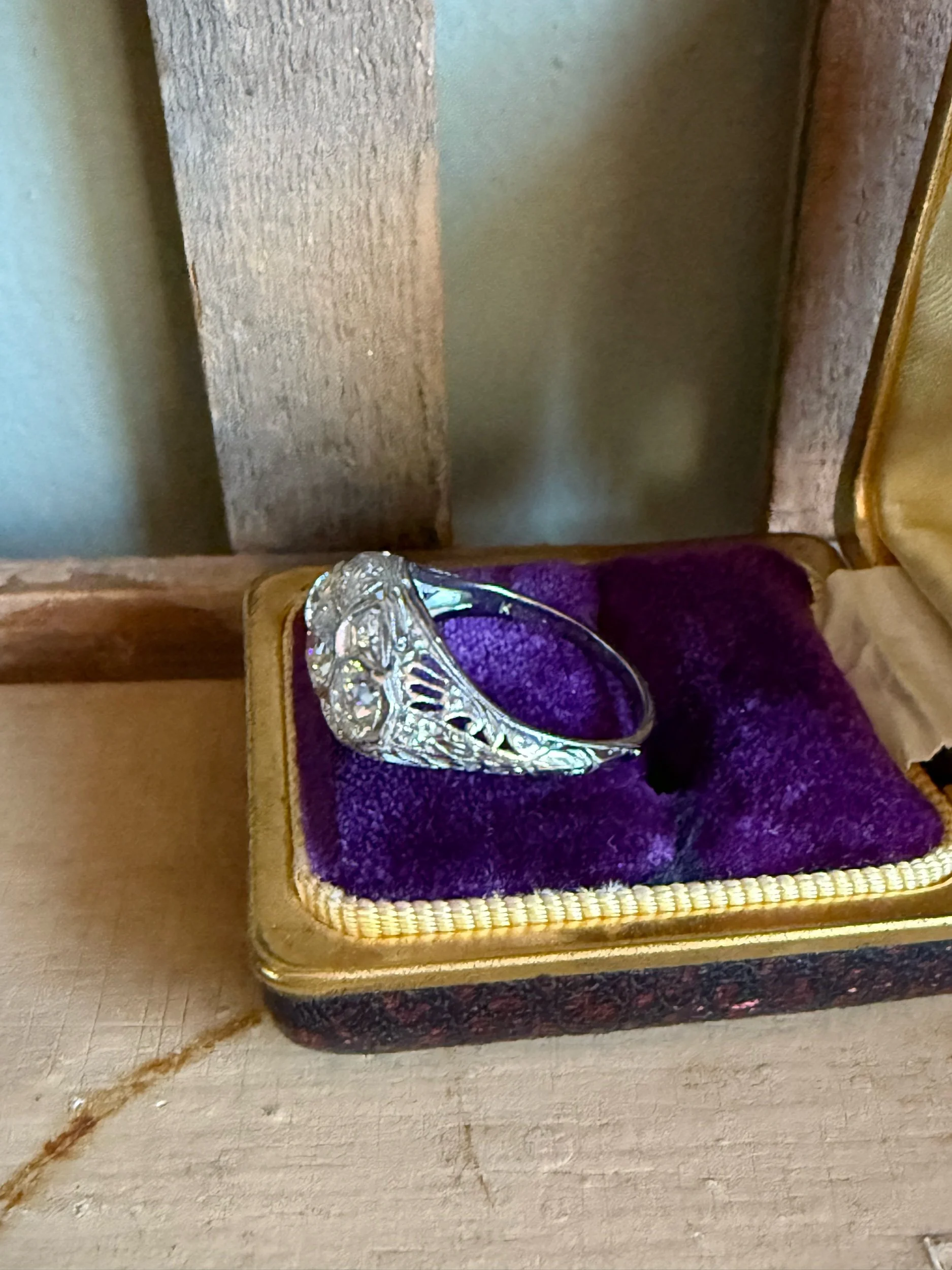 Overall this ring is in very good vintage/antique condition. Filigree is present, diamonds secure is ready to be worn and adored for more decades. 4.1 grams. Size 6.5 but message if you need sizing we can give an estimate of cost.