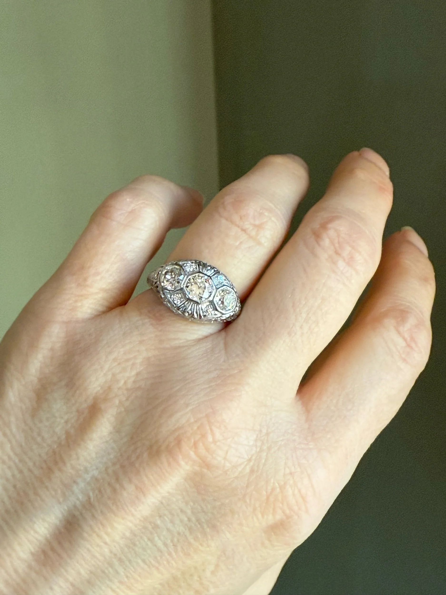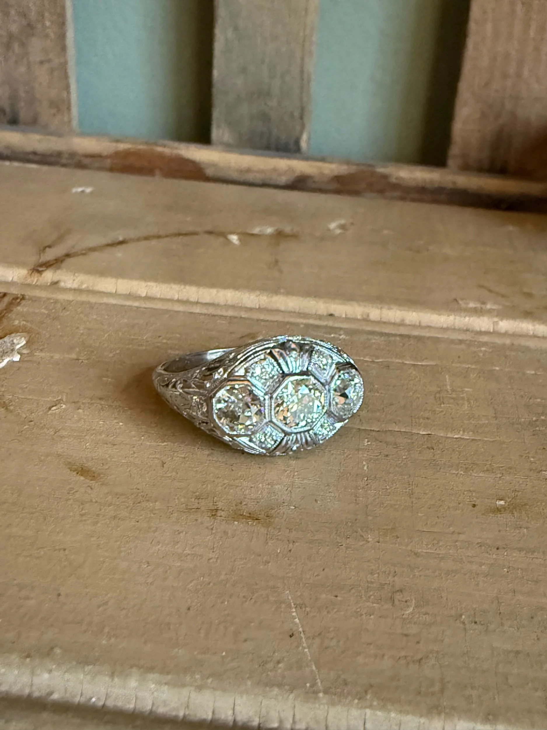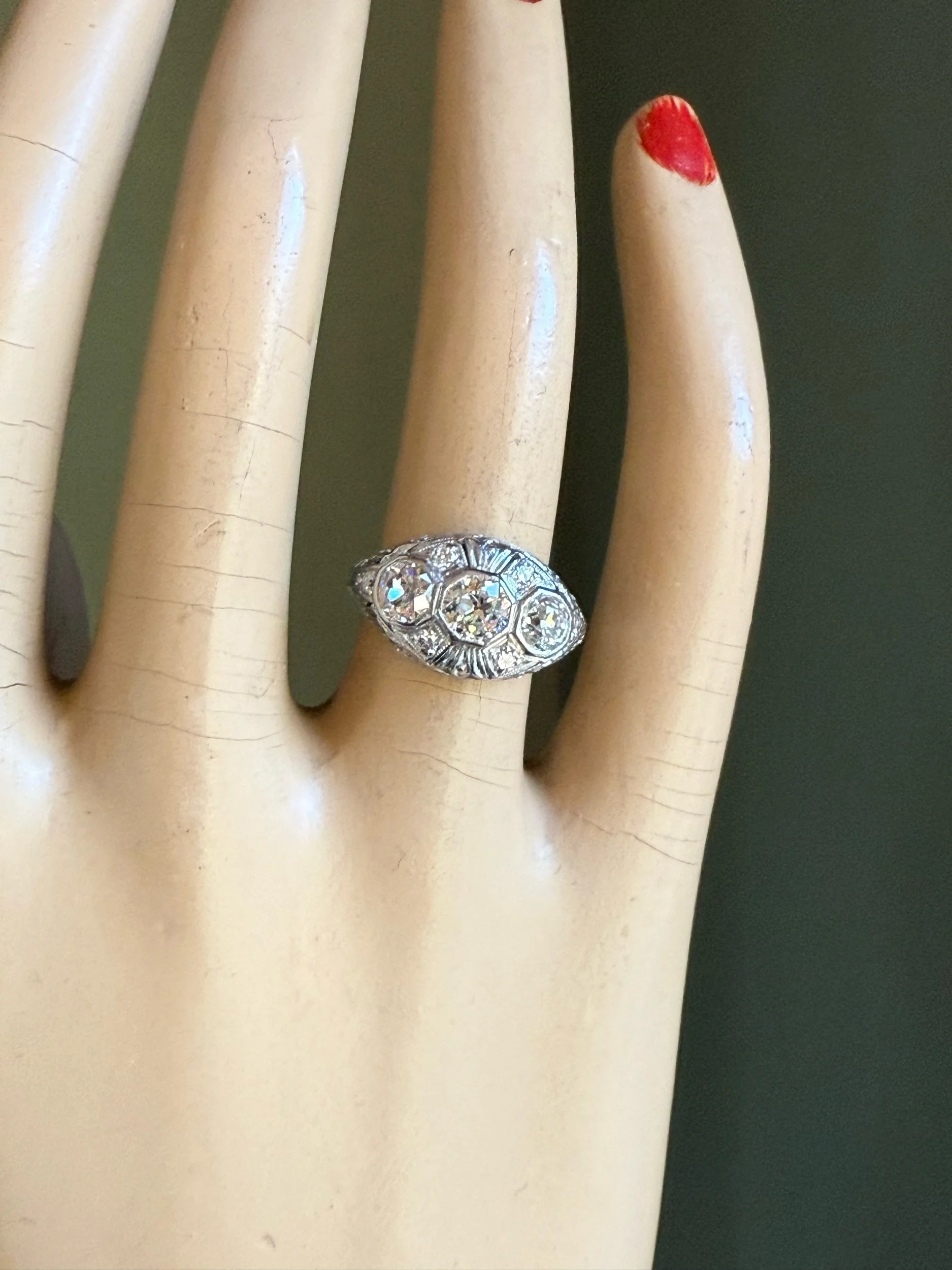 c1935 Iridium and platinum ring (most likely 10% iridium/90% platinum). Beautiful example of a diamond ring set with old European cut diamonds dating to the Art Deco Period. The center old European cut diamond measures approx. 5+ mm, .52 ct, on each side are approx. .35 ct diamonds, total weight approx. 1.22 ctw. There are six additional old european cut diamonds measuring approx. .09 ctw. Total weight around 1.30 ctw. The diamonds are J-K color with a clarity of SI-I. All diamonds are securely set, the main three are bezel set. Can still see milgrain work and engraving. The shoulders have a diamond and filigree and engraving. Front measures 7/16" wide and it sits up off the finger 3/16".