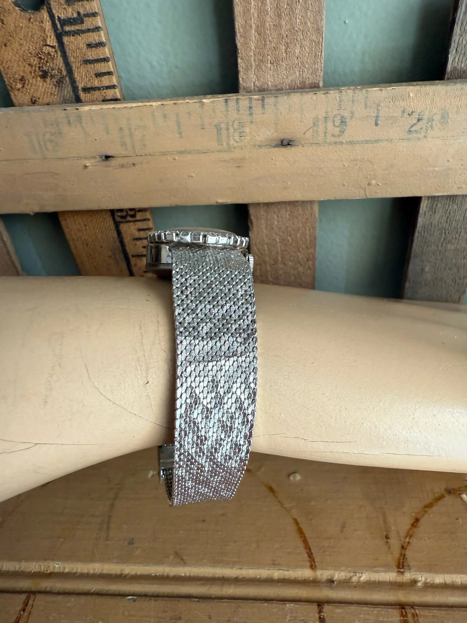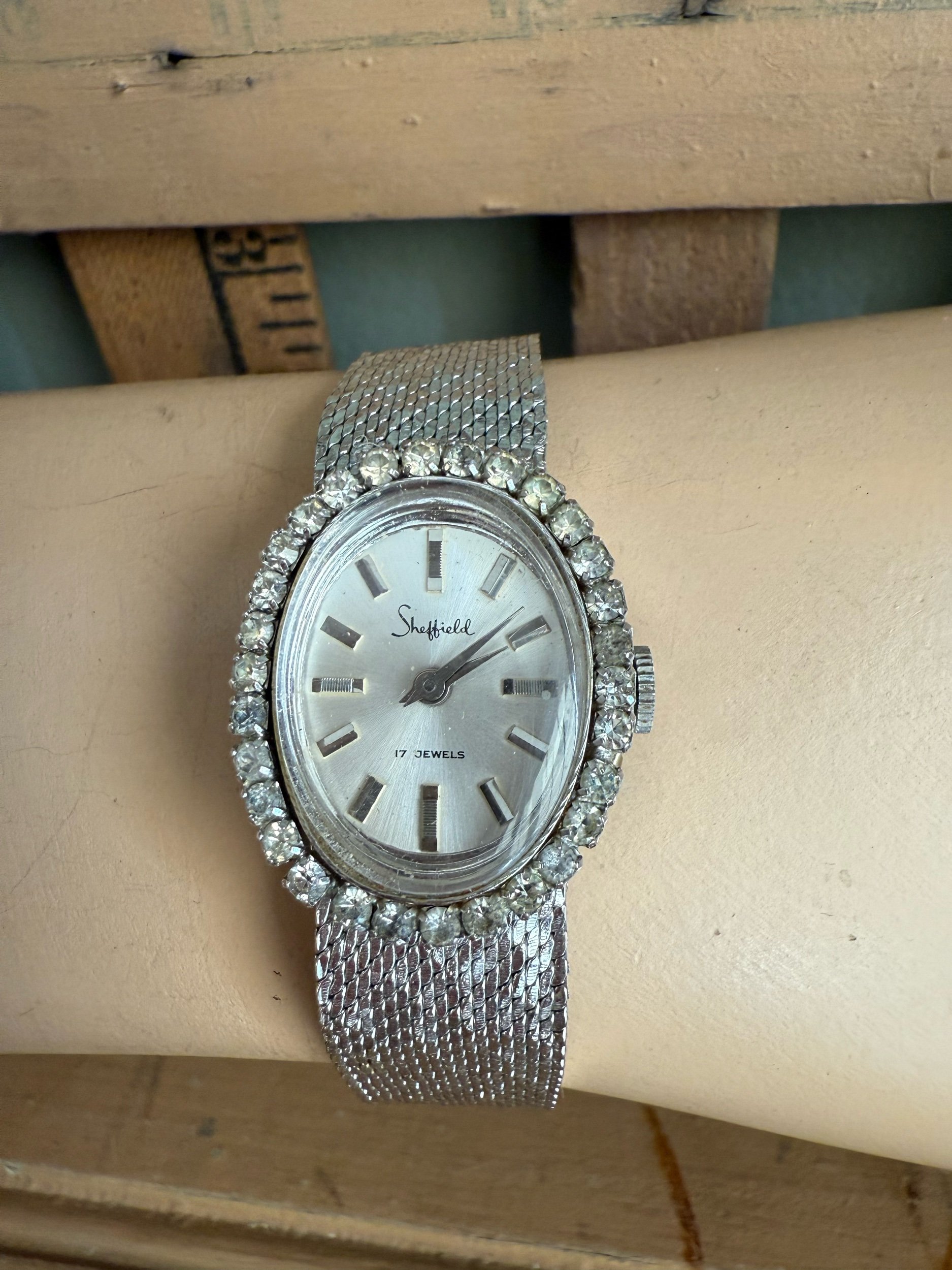17 Jewels manual wind wrist watch by Sheffield. Silver tone metal, rhinestone framed cased. The case is 1 x 3/4".