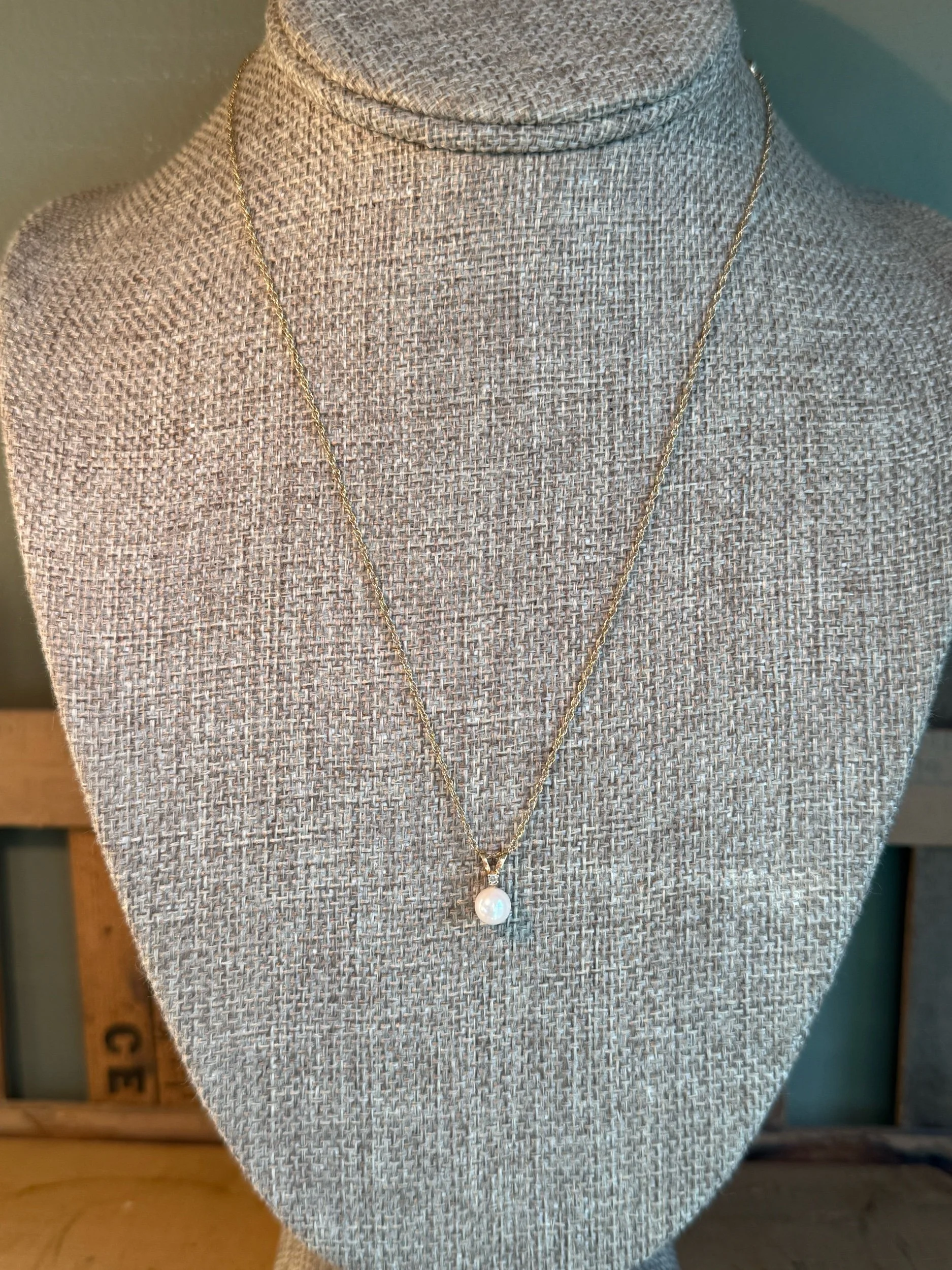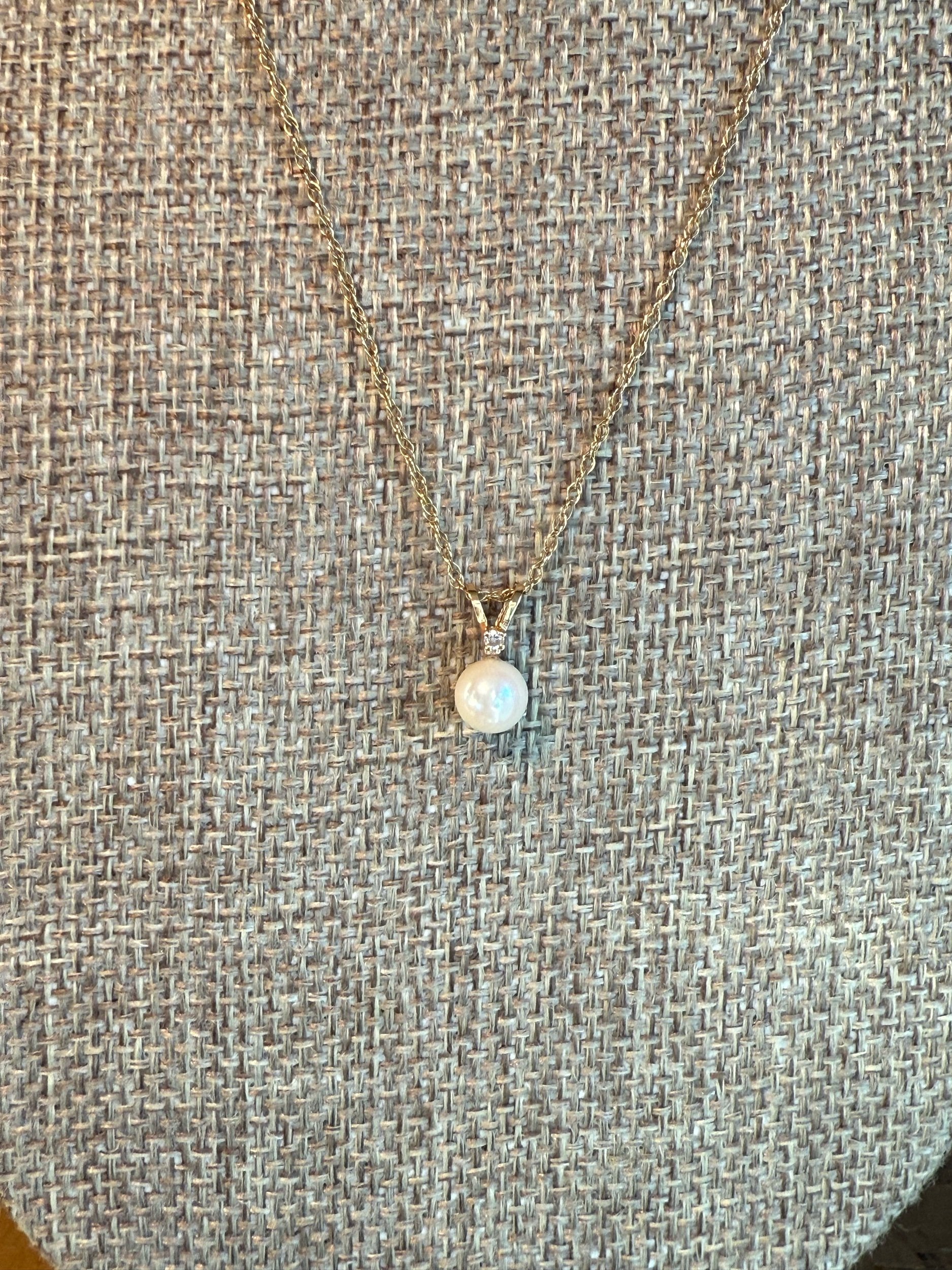 The pendant features a slightly cream hue pearl, good luster measuring 5.96 mm set by post to a bale with a 1.75 mm round cut diamond set by four prongs. Pearls symbolize purity and wisdom.
