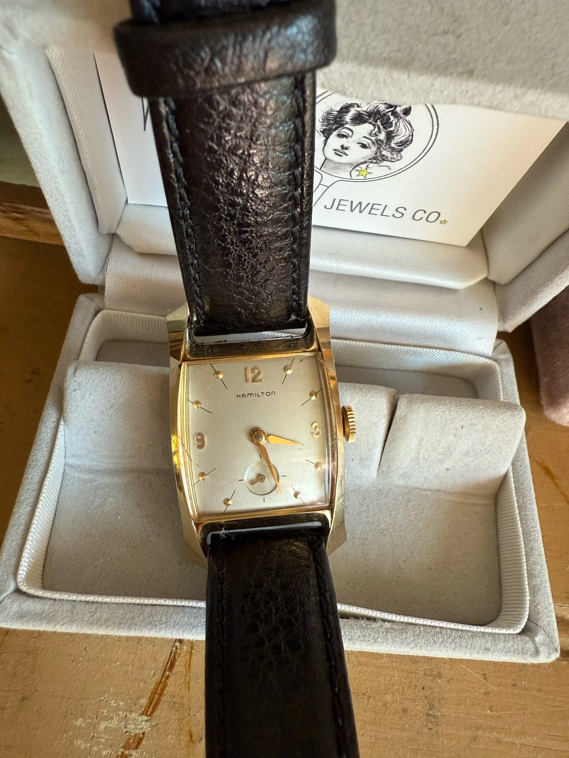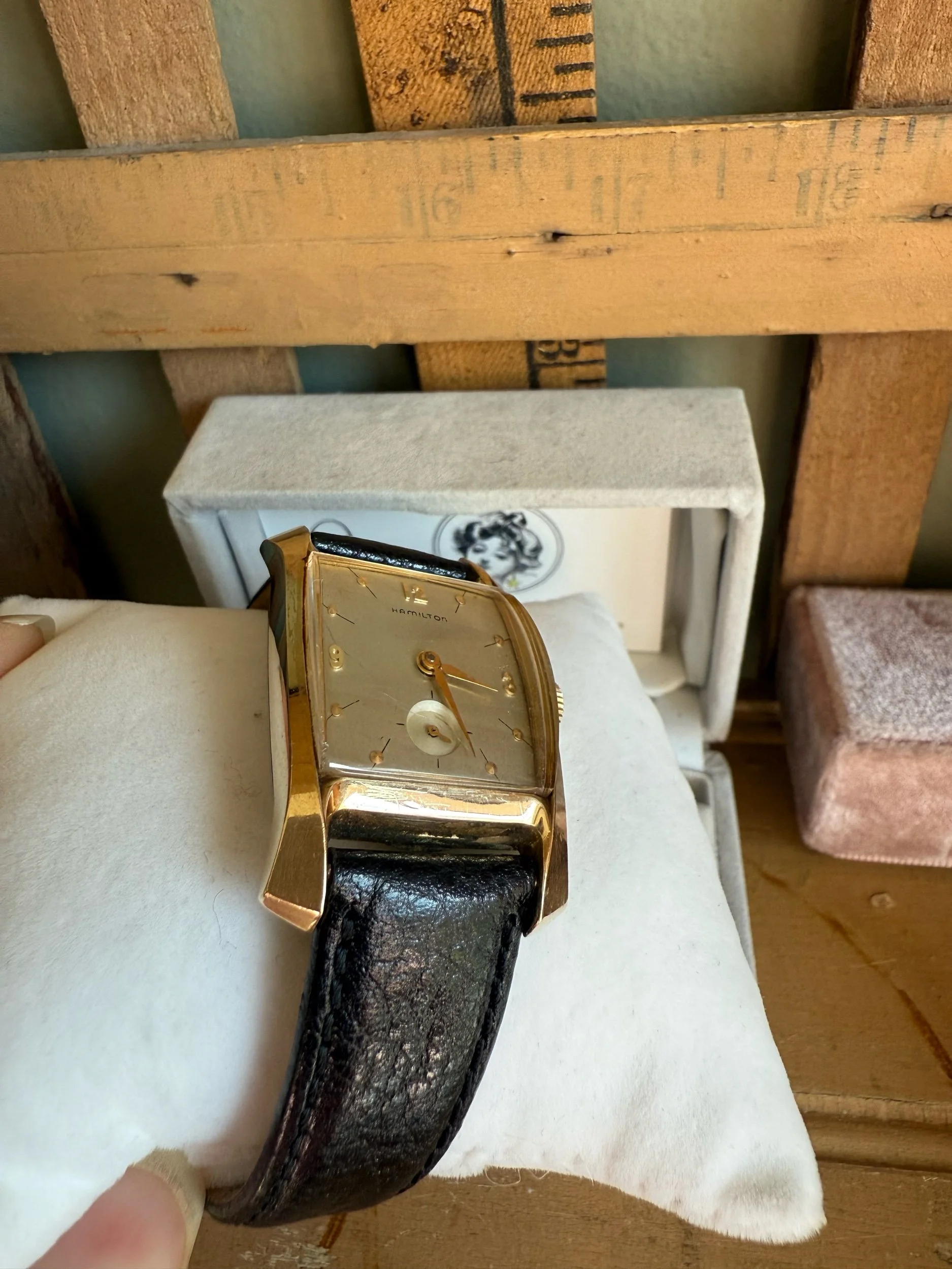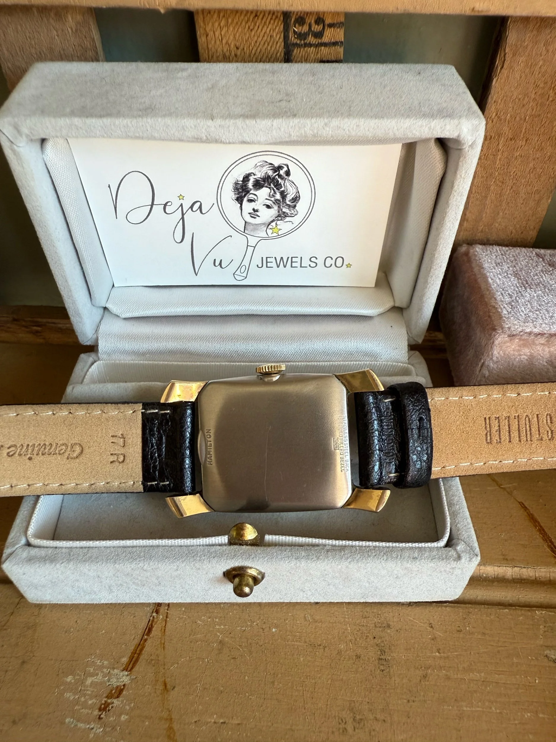 Made from 1955 through 1957, the Hamilton Baxter was a larger watch for the time. This watch comes with an American made Hamilton caliber 730 manual wind movement. The watch features a very good silver tone dial with applied 18k gold numerals and dots. The bezel is 10k gold filled, the case back is stainless steel. The watch comes ready to wear on a new black leather strap with gold tone buckle. The 730 caliber manual wind movement is running well. We have wound this watch over the last few days and it is keeping good time. We can't gurantee it will work forever as manual wind watches do need cleaning and maintenance.