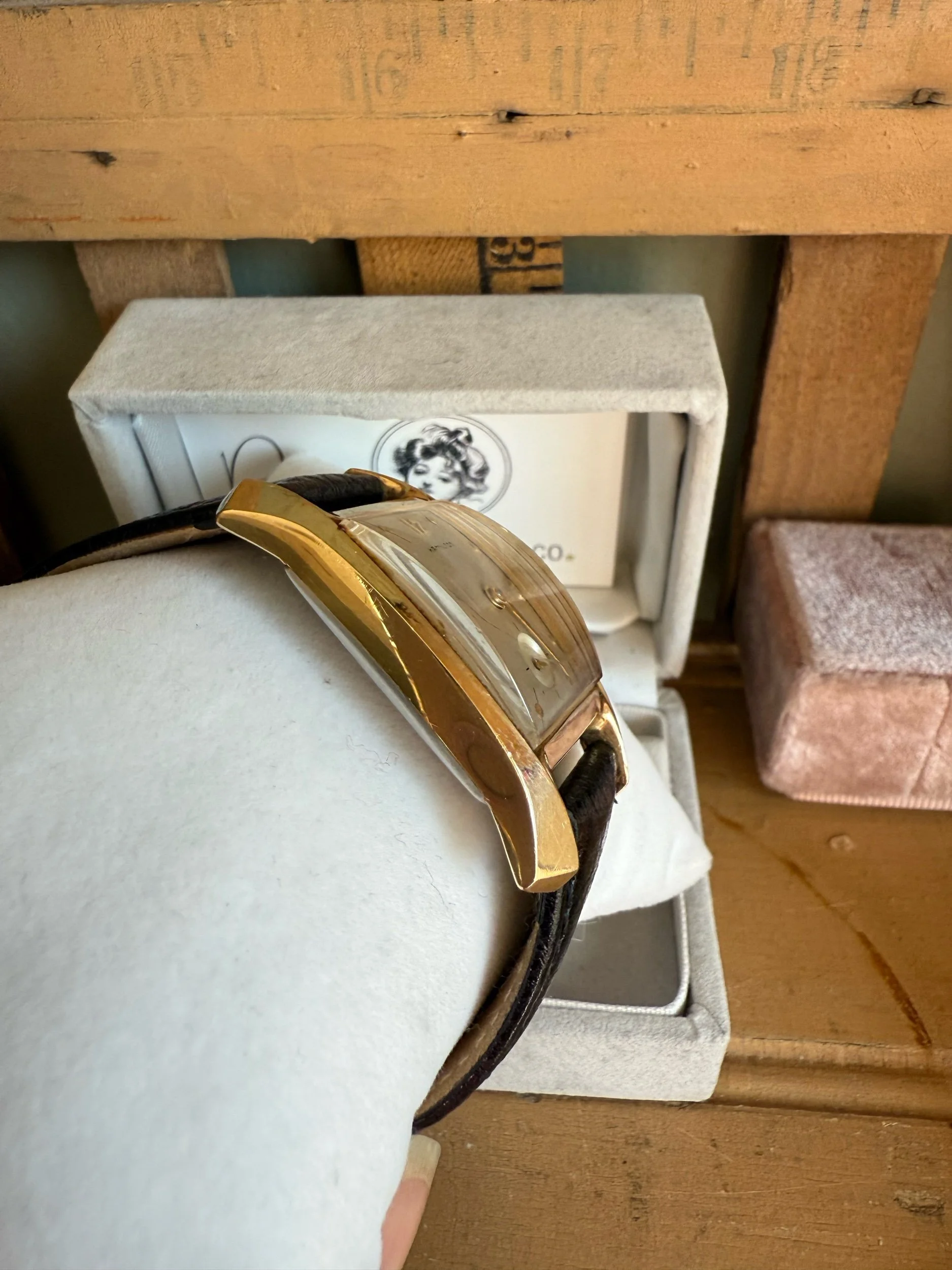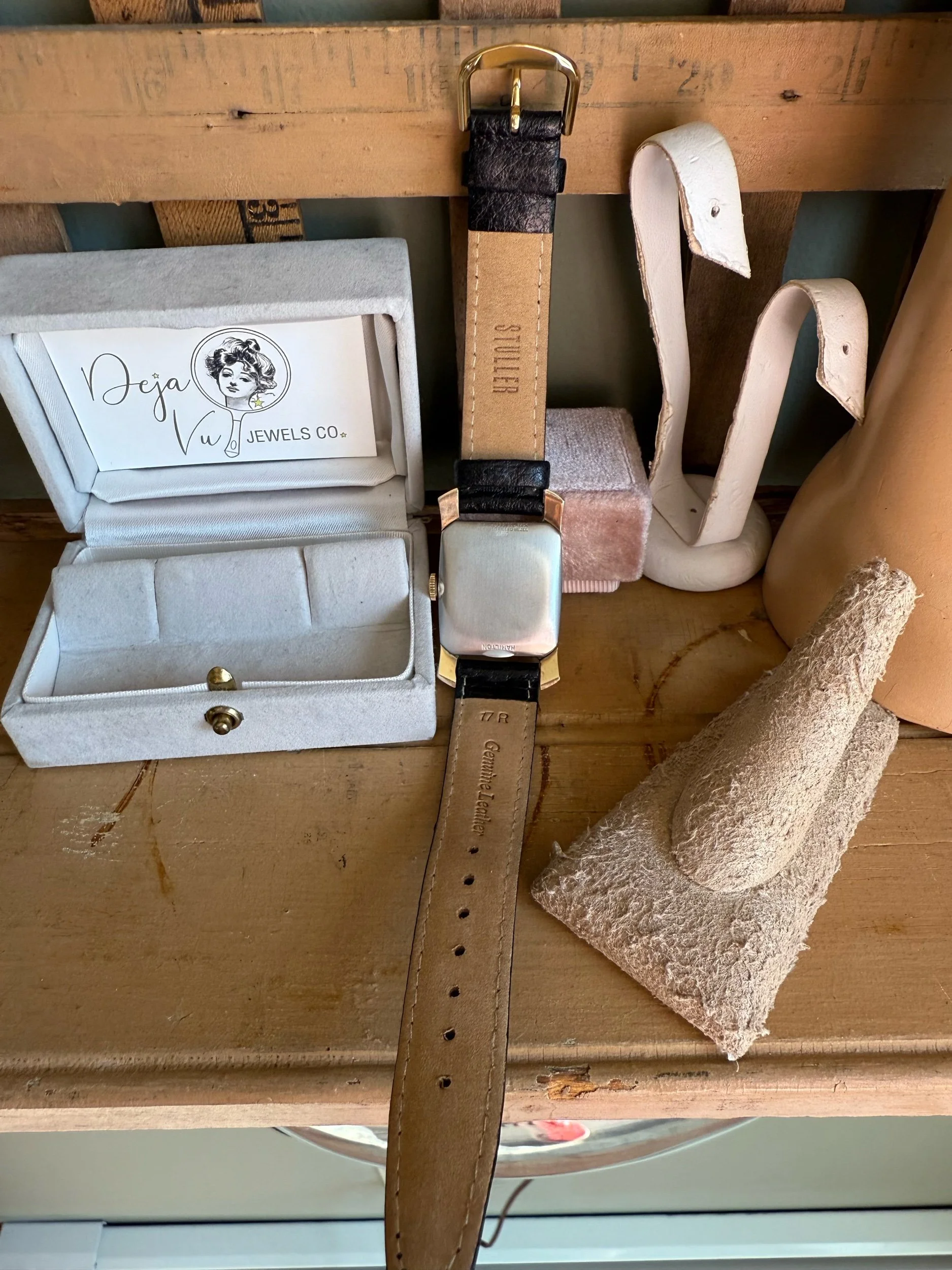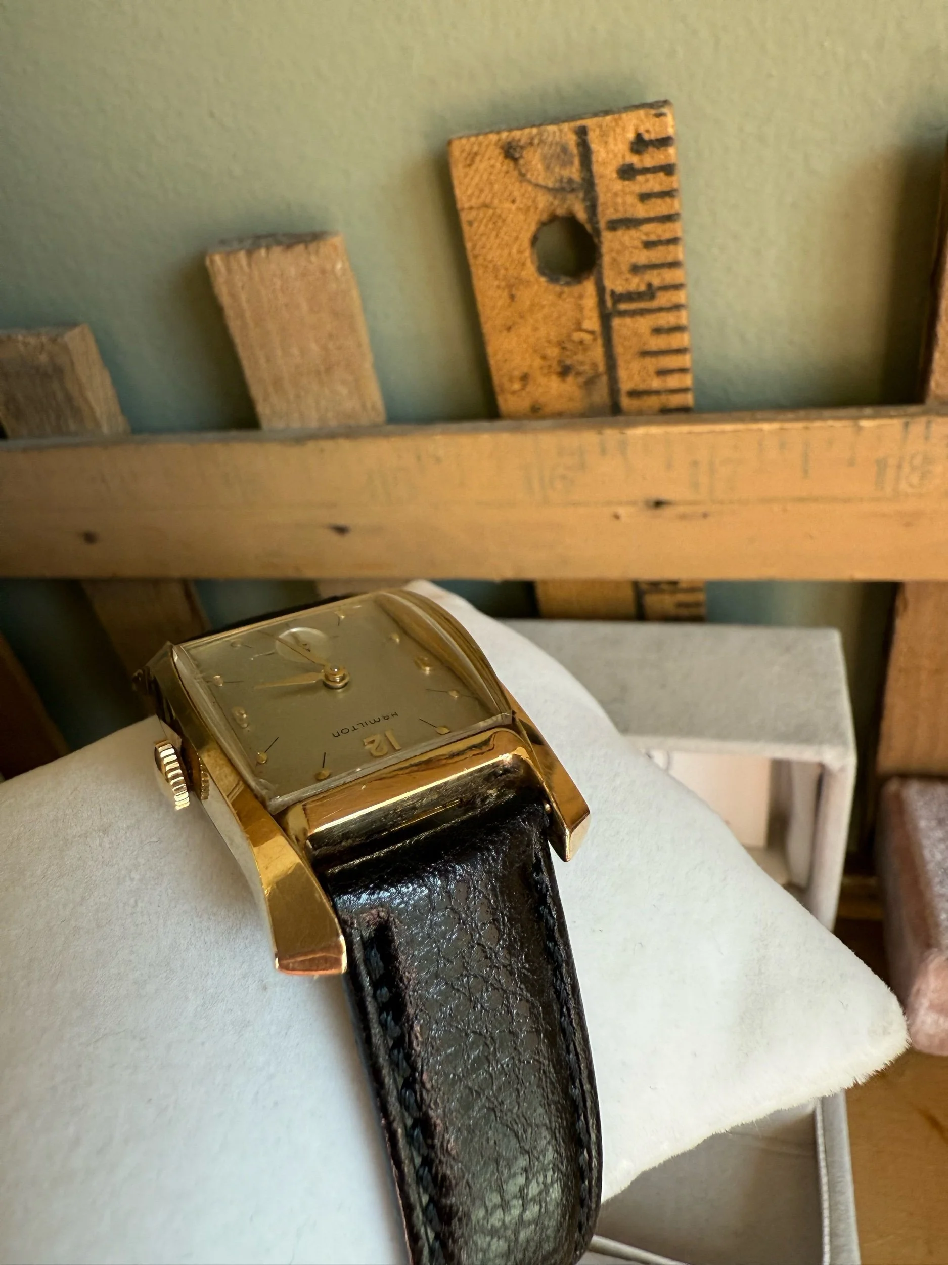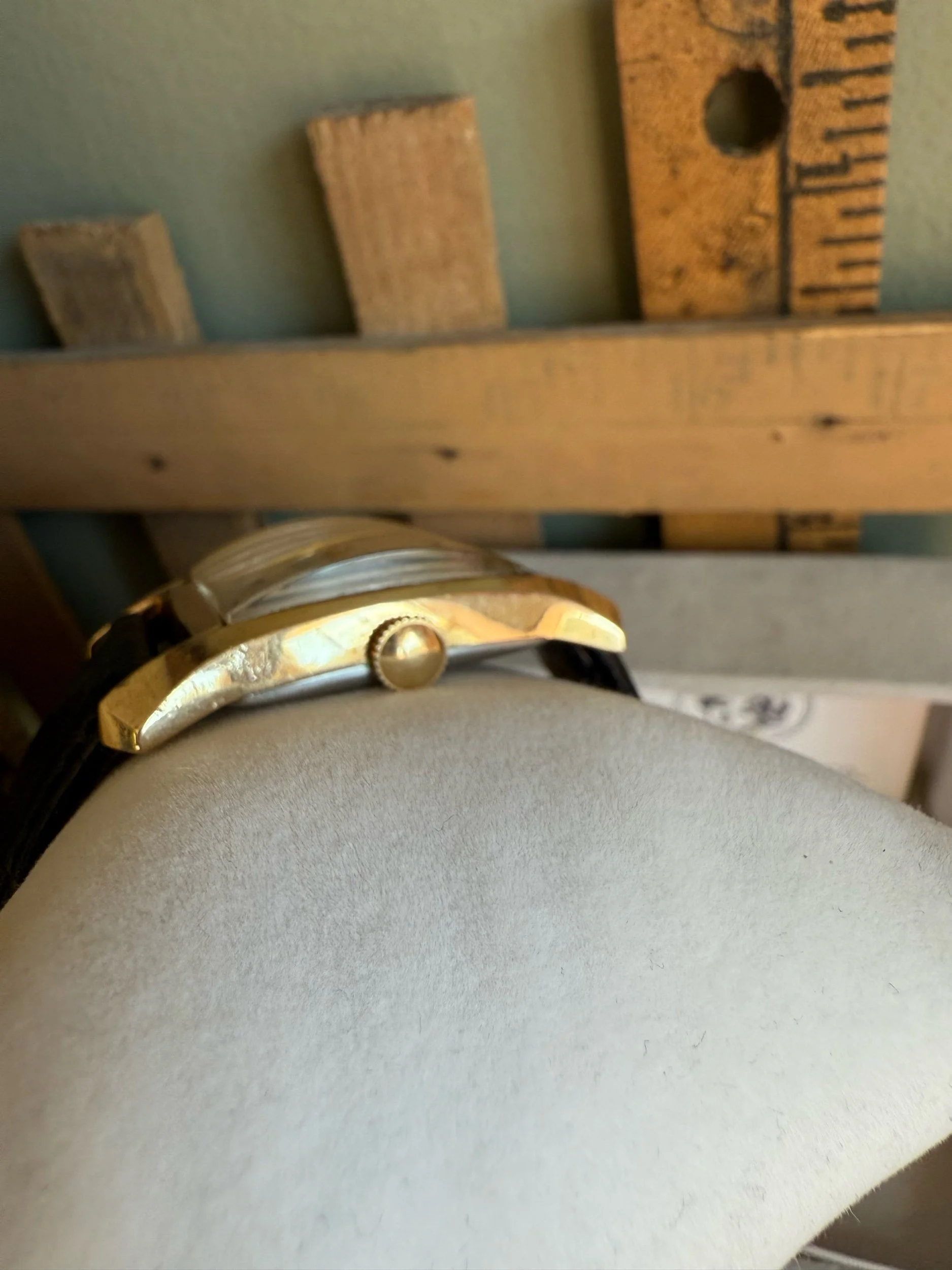 Made from 1955 through 1957, the Hamilton Baxter was a larger watch for the time. This watch comes with an American made Hamilton caliber 730 manual wind movement. The watch features a very good silver tone dial with applied 18k gold numerals and dots. The bezel is 10k gold filled, the case back is stainless steel. The watch comes ready to wear on a new black leather strap with gold tone buckle. The 730 caliber manual wind movement is running well. We have wound this watch over the last few days and it is keeping good time. We can't gurantee it will work forever as manual wind watches do need cleaning and maintenance.