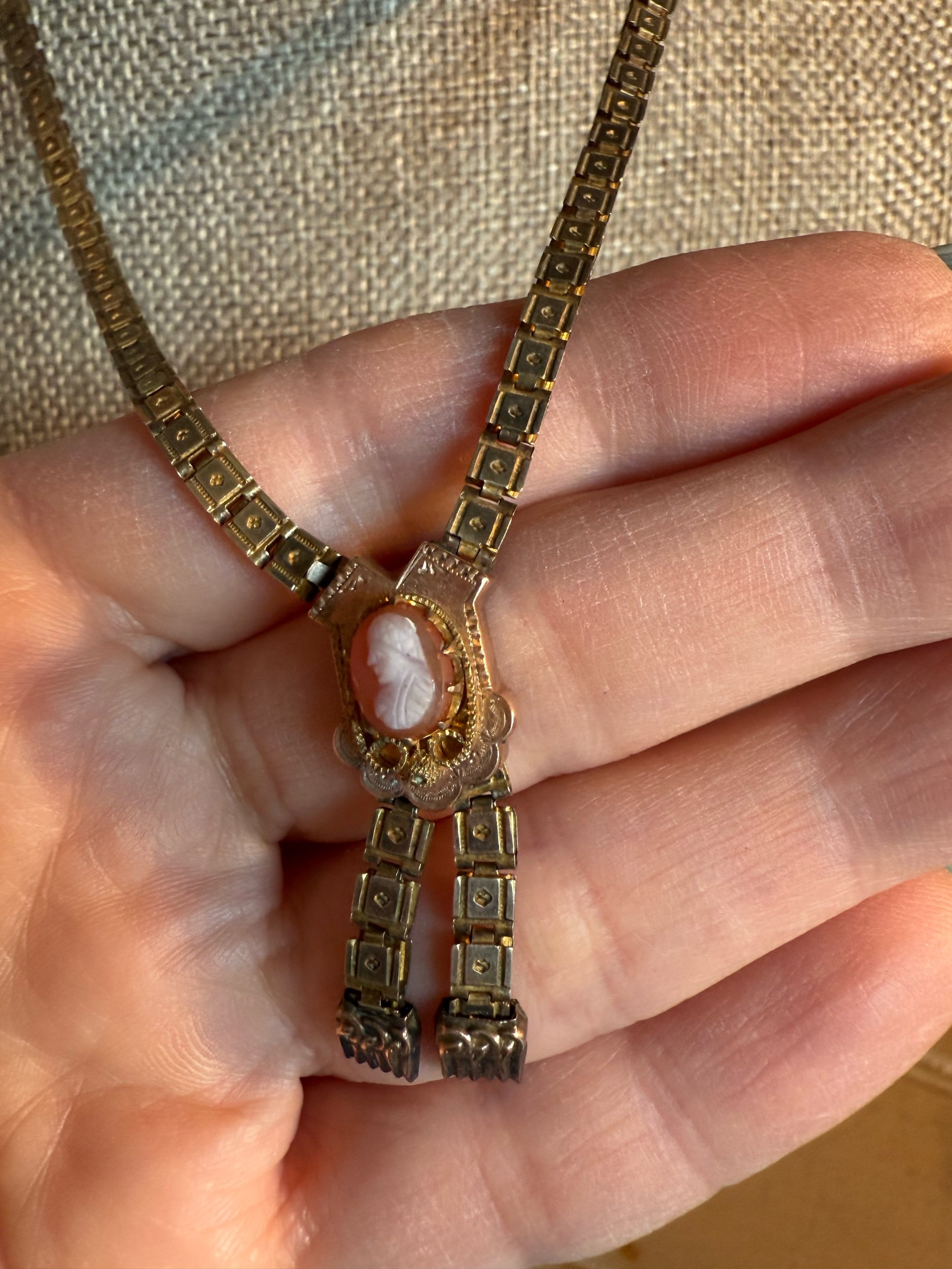 c1880 Victorian gold filled necklace. The bookchain link measures 3/8" wide and is decorative on both sides. 18" length. The clasp is a hidden box behind the hand carved banded agate cameo of a lady in profile. 5/8" length, prong set. There are two tassels 3/4" length.