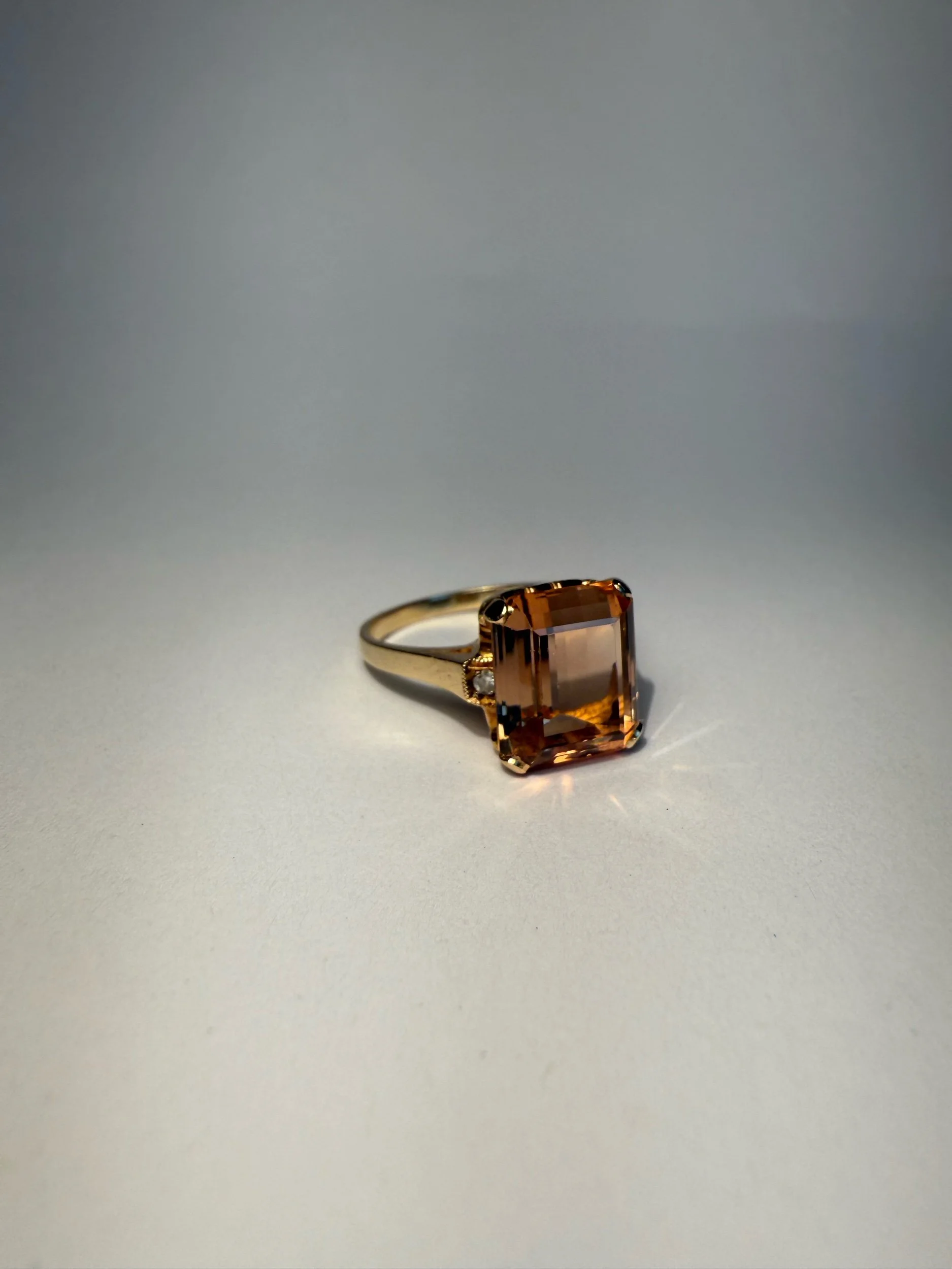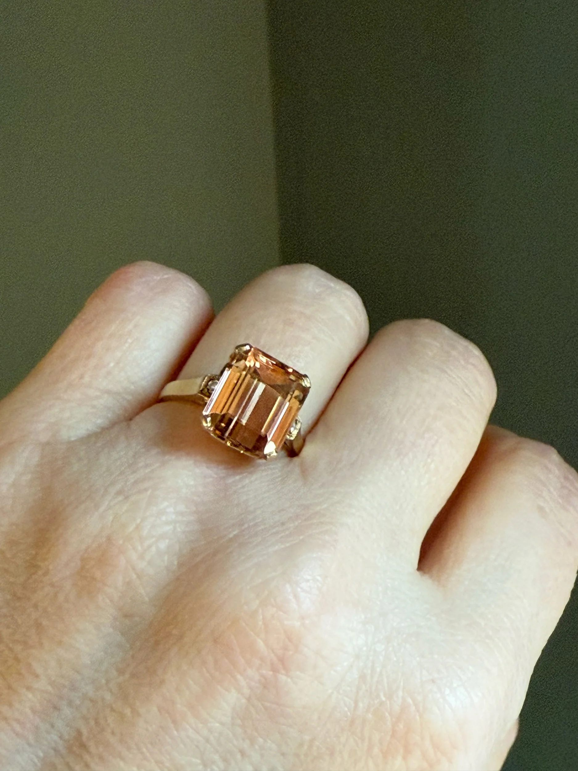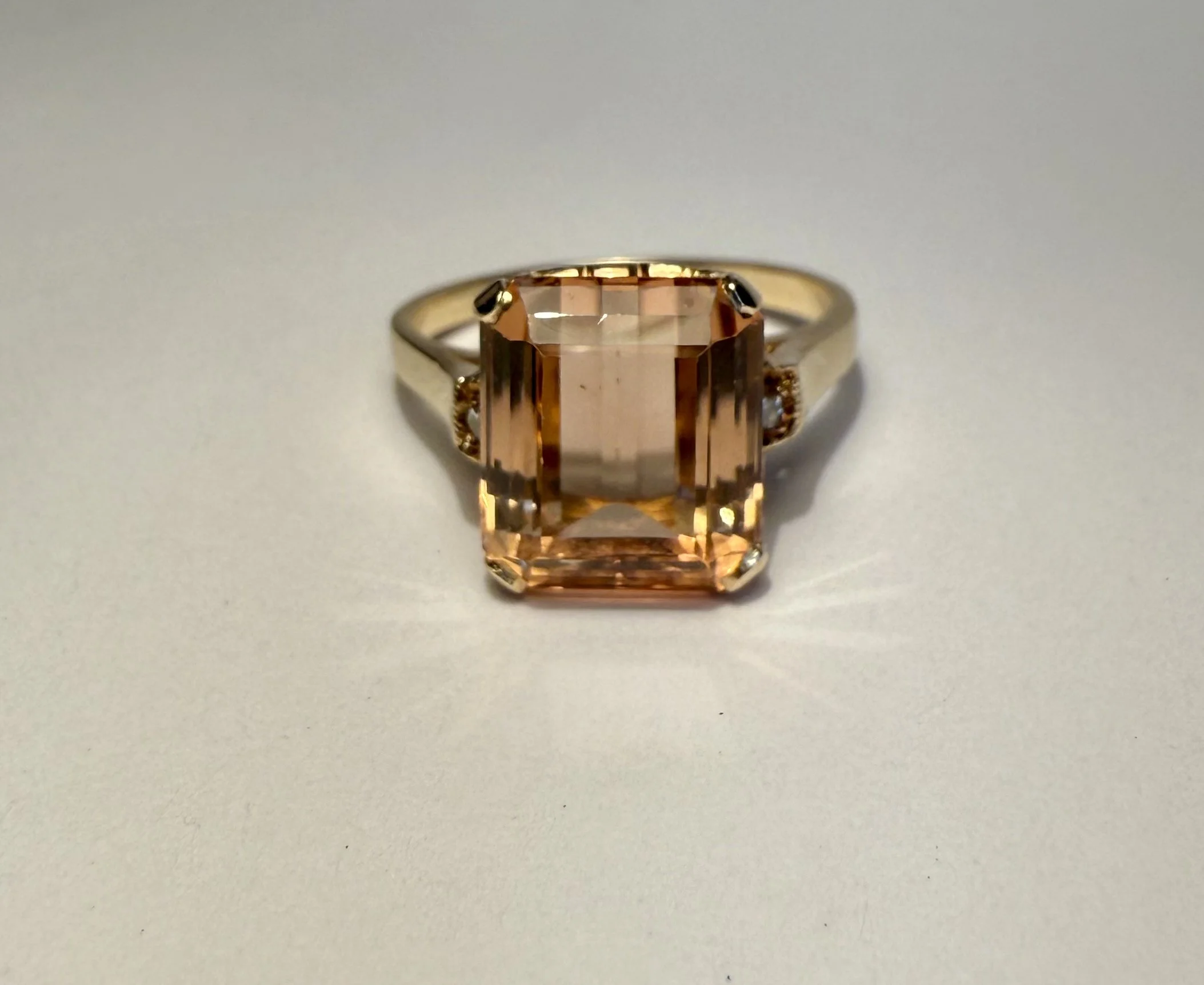 Vintage-1950-1960-14K yellow gold ring featuring a 11 x 9.47 mm rectangle cut peachy/pinkish/brownish rectangle cut tourmaline, approx. 6 cts, set by four corner prongs, one each shoulder are two round cut diamonds measuring approx. 1.50 mm diameter. Good strong setting, back of shank is 1.68 mm wide. Currently a size 7 but message if you need sizing service. 3.7 grams