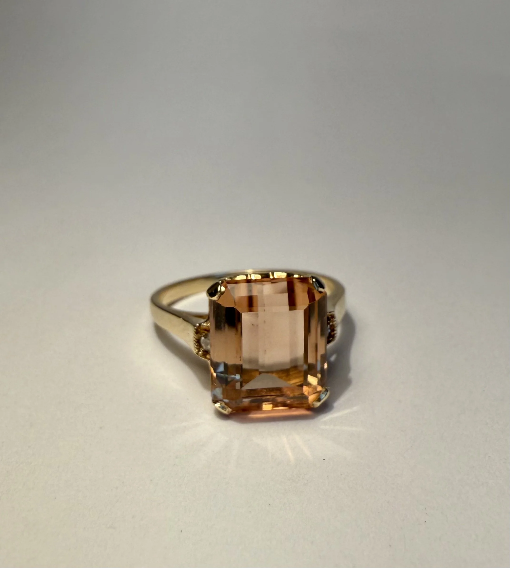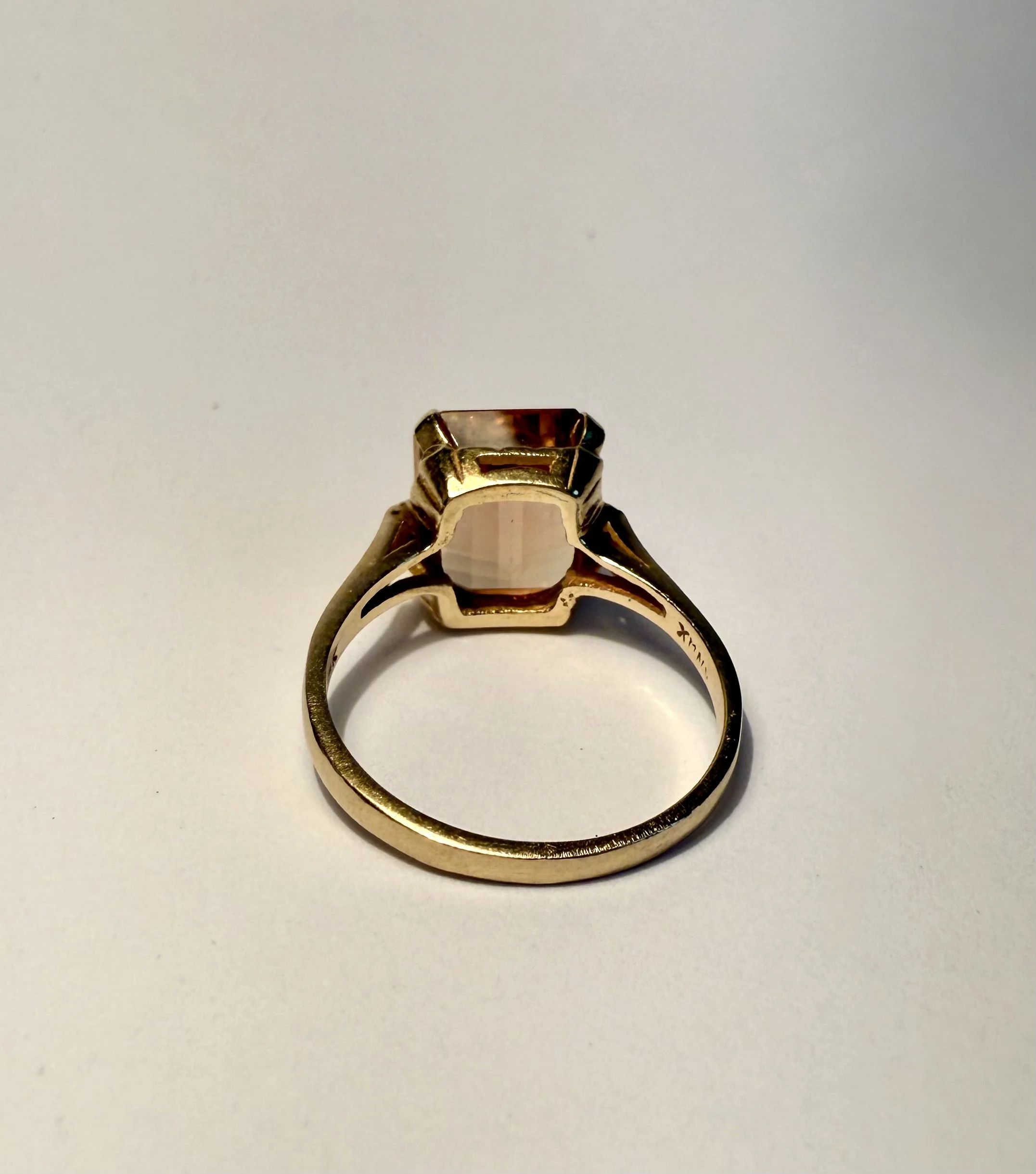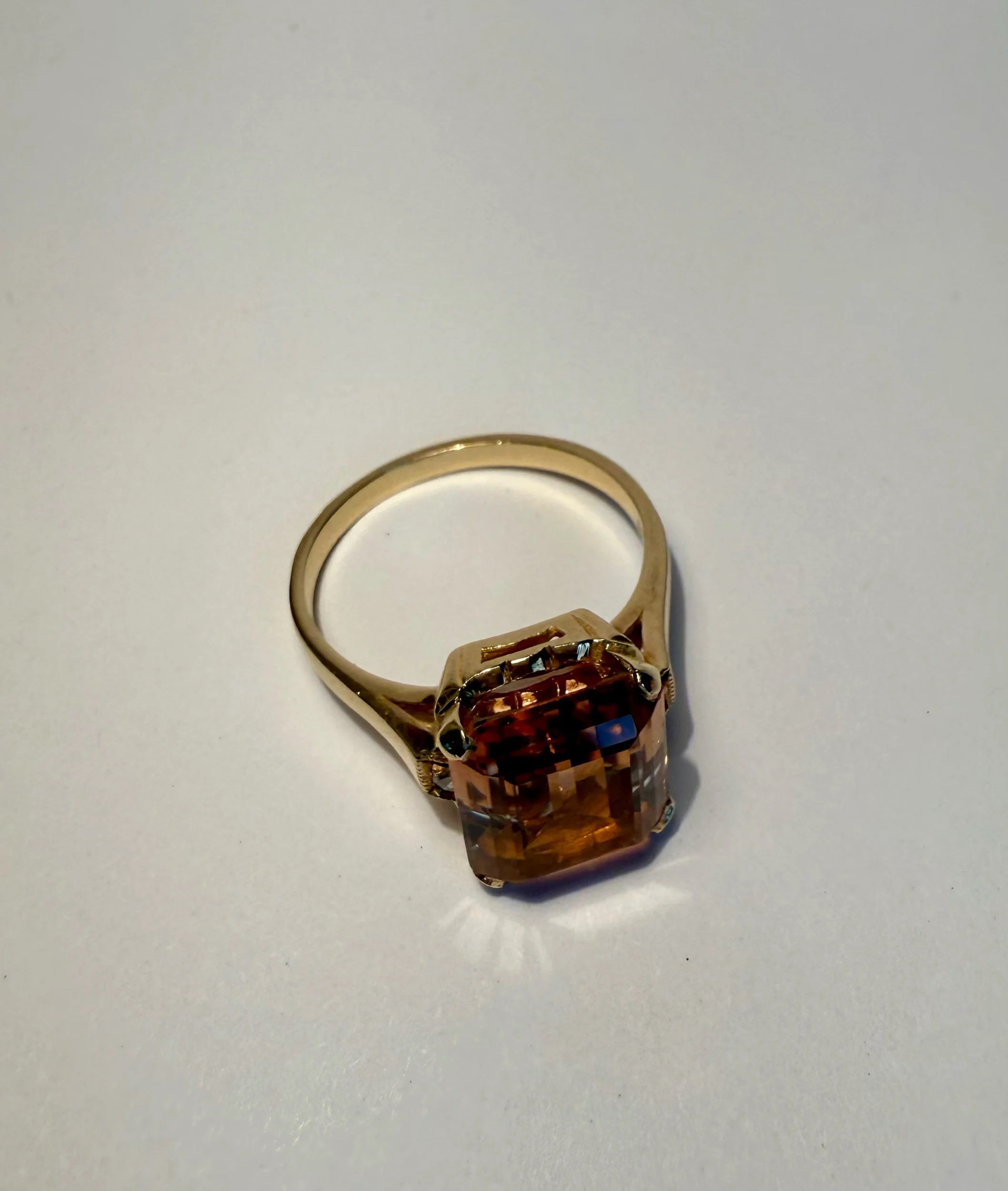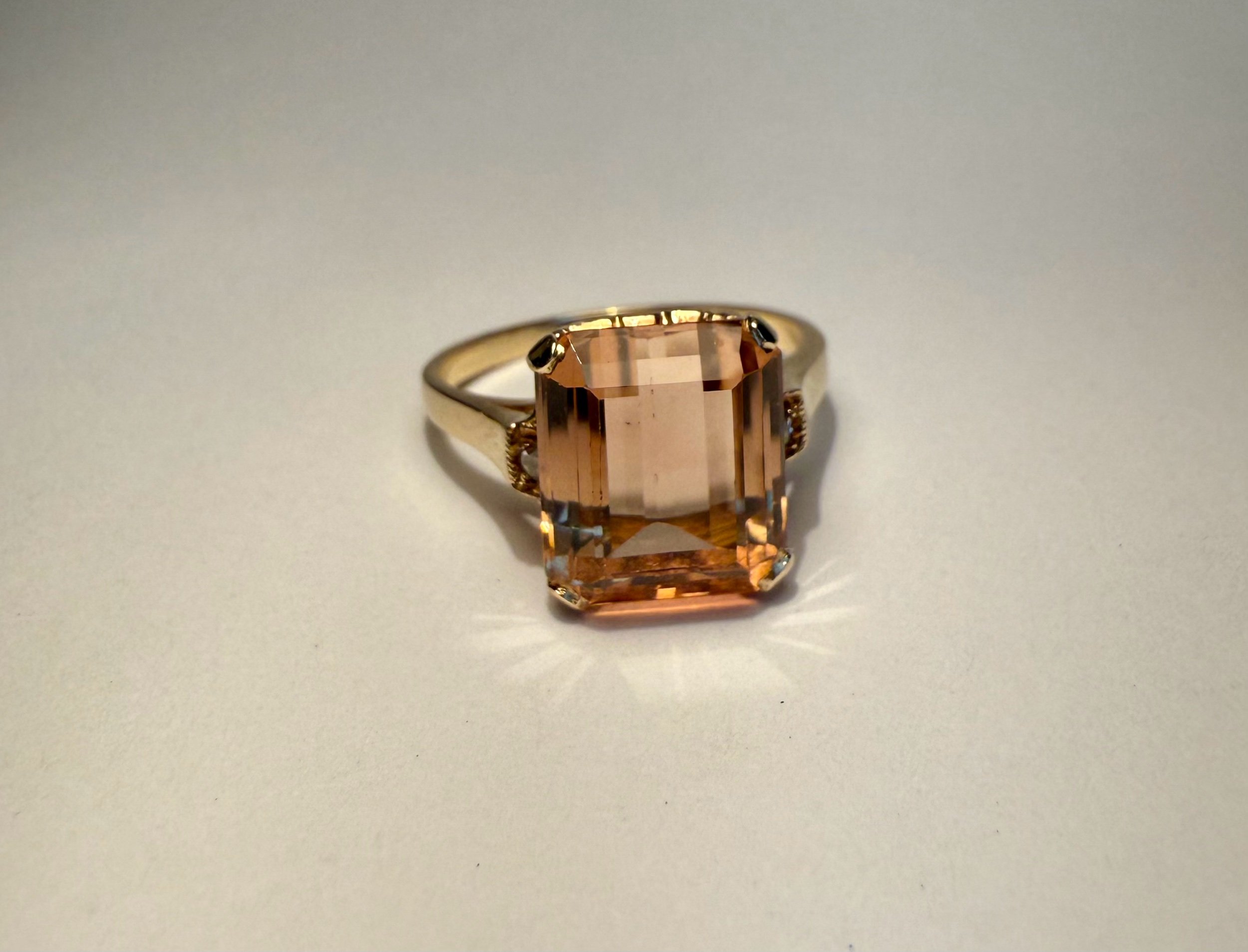 Vintage-1950-1960-14K yellow gold ring featuring a 11 x 9.47 mm rectangle cut peachy/pinkish/brownish rectangle cut tourmaline, approx. 6 cts, set by four corner prongs, one each shoulder are two round cut diamonds measuring approx. 1.50 mm diameter. Good strong setting, back of shank is 1.68 mm wide. Currently a size 7 but message if you need sizing service. 3.7 grams