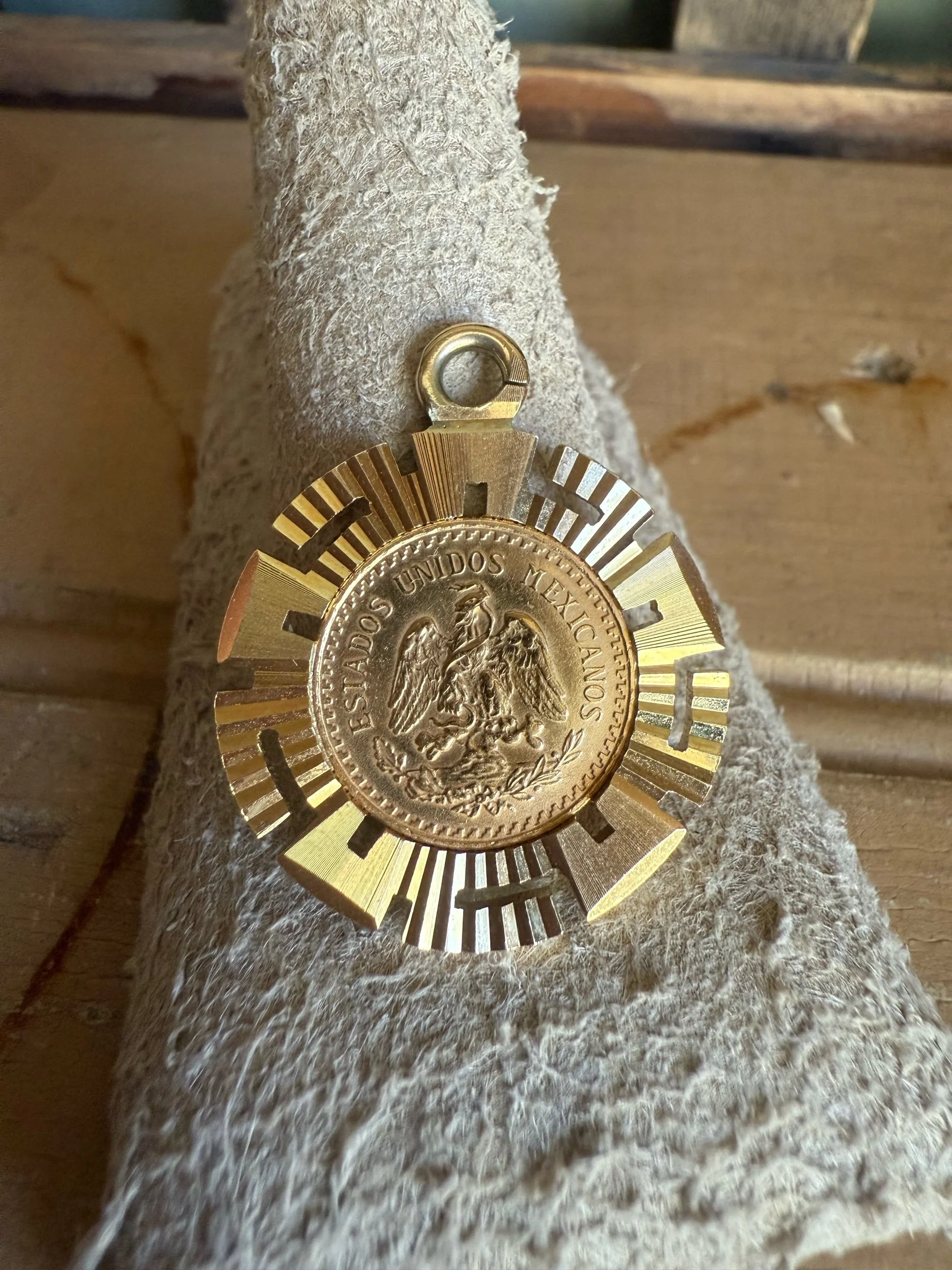 Deja Vu Jewels Co. › Vintage 1945 2 1/2 Pesos Mexican Gold Coin Set in 14k Pendant Image 1 of 5 Image 2 of 5 Image 3 of 5 Image 4 of 5 Image 5 of 5 Vintage 1945 2 1/2 Pesos Mexican Gold Coin Set in 14k Pendant $900.00 c19452 1/2 Mexican Pesos Gold Coin set in a 14K 1960-1970 pendant. 1 " diameter. 6.6 grams Add To Cart Added! c19452 1/2 Mexican Pesos Gold Coin set in a 14K 1960-1970 pendant. 1 " diameter. 6.6 grams Reviews Reviewer Name Review Date Star Rating Description Posted on Etsy Product Show More