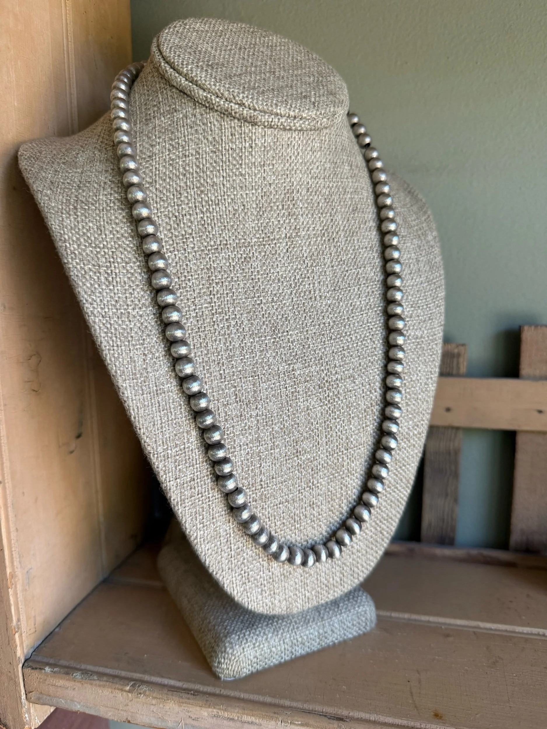 Mexican made sterling silver bead necklace. Also known as a mexican pearl necklace. The beads feature a unique brushed finished and measures approx. 1/4" diameter. The beads are strung on a sterling link chain and the clasp is stamped mexico, taxaco, sterling and a makers mark I can't decipher.