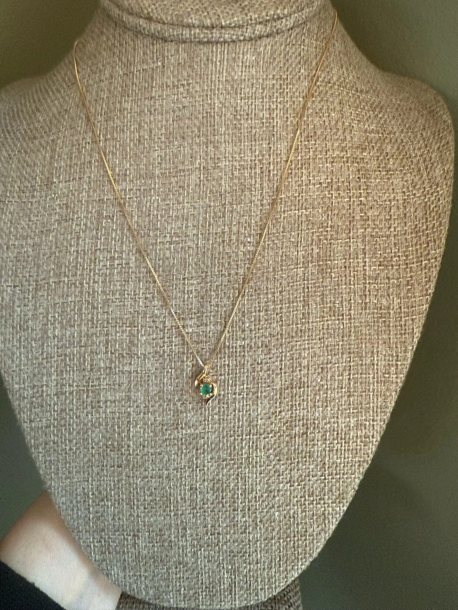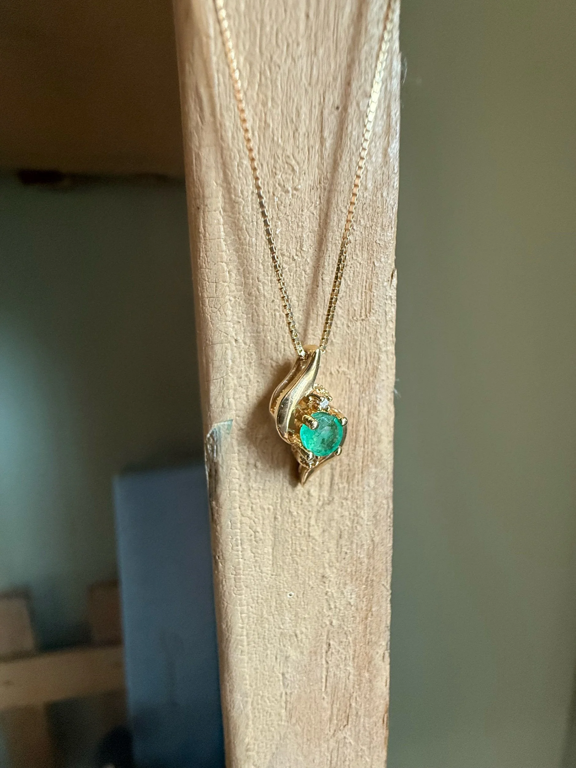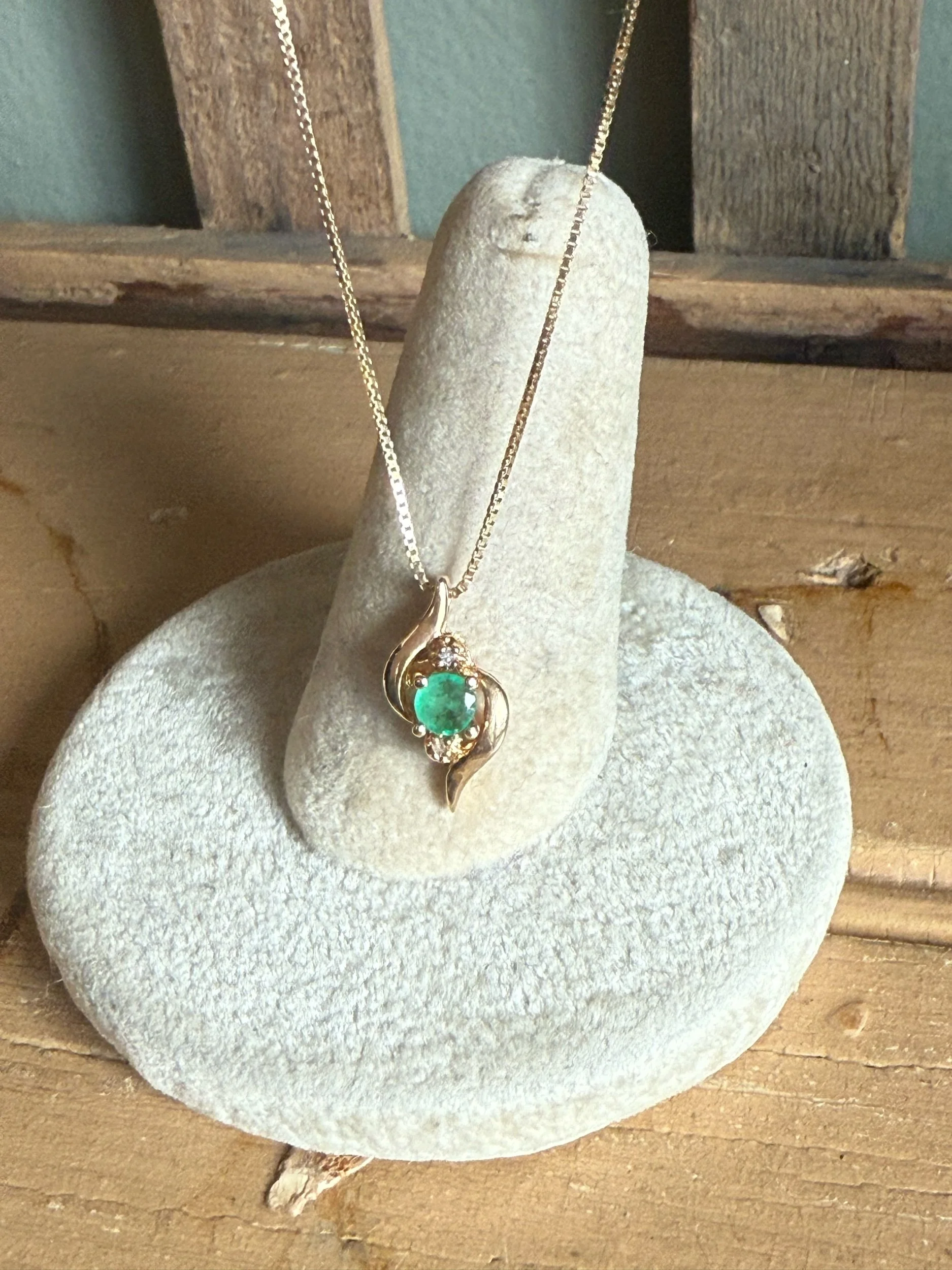 c1980-14K yellow gold pendant and chain. The pendant features a round cut emerald measuring approx. 3.55 mm, approx. .17 ct, slightly bluish green, with two round cut accent diamonds, all gemstones securely set by prongs. 9/16" top to bottom x 5/16" wide. Stamped 14k and tested on a 14K yellow gold box link chain, 18" length. Very good preowned condition. 1.9 grams tw